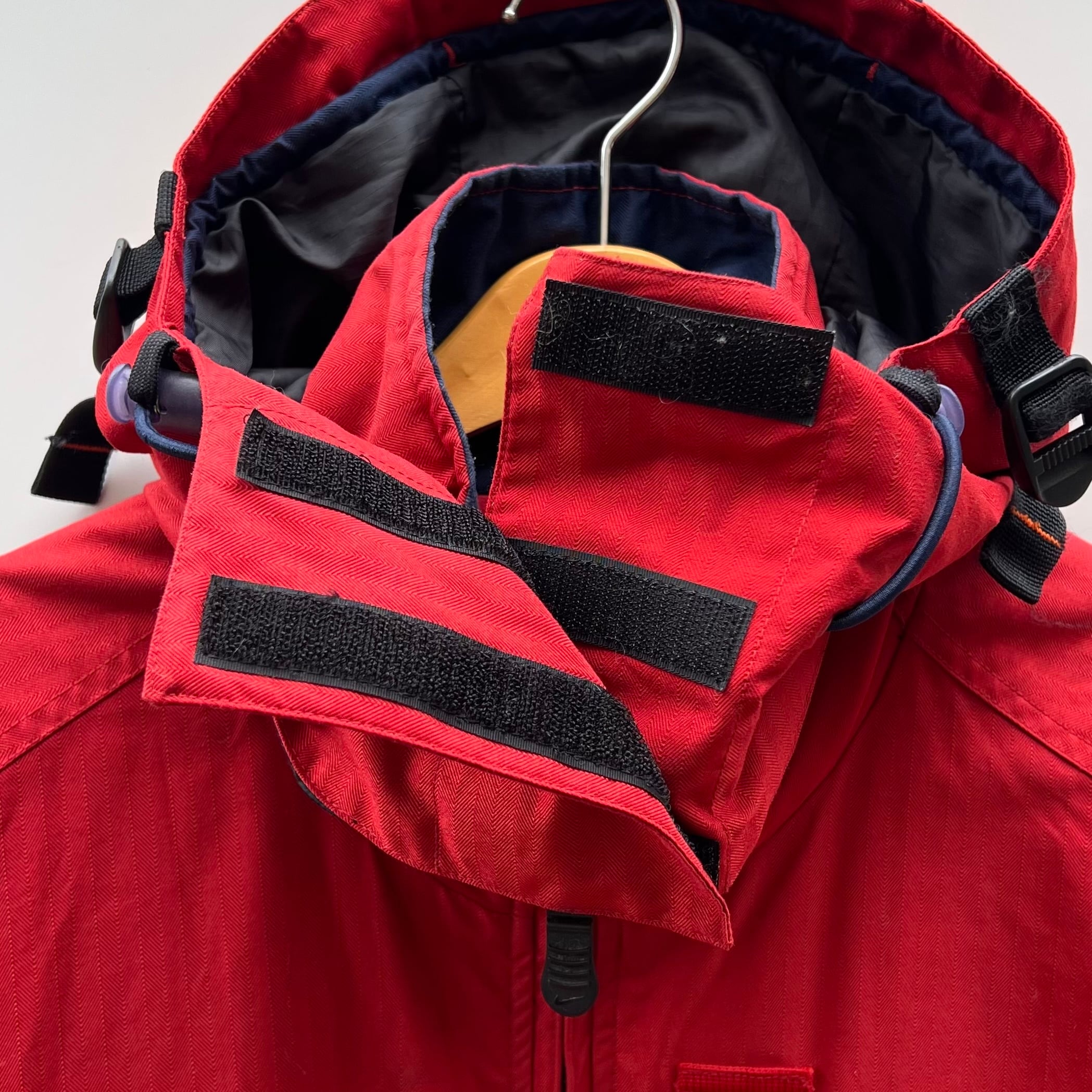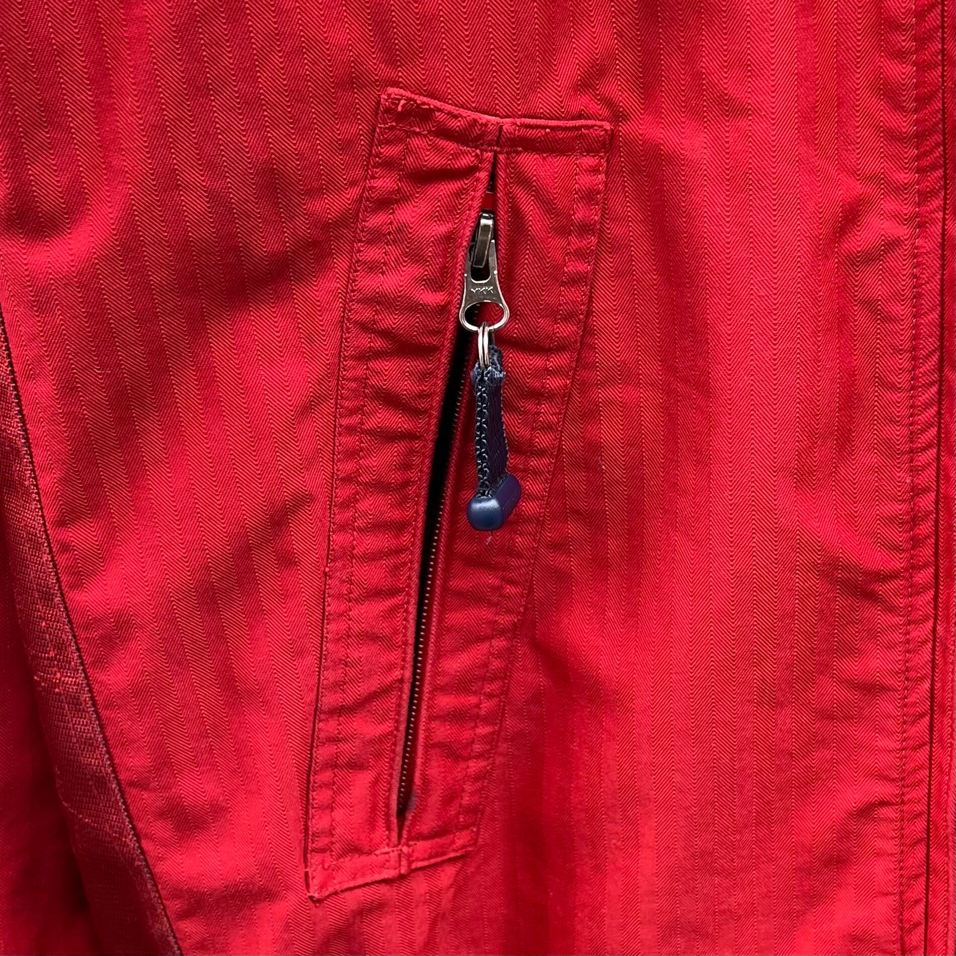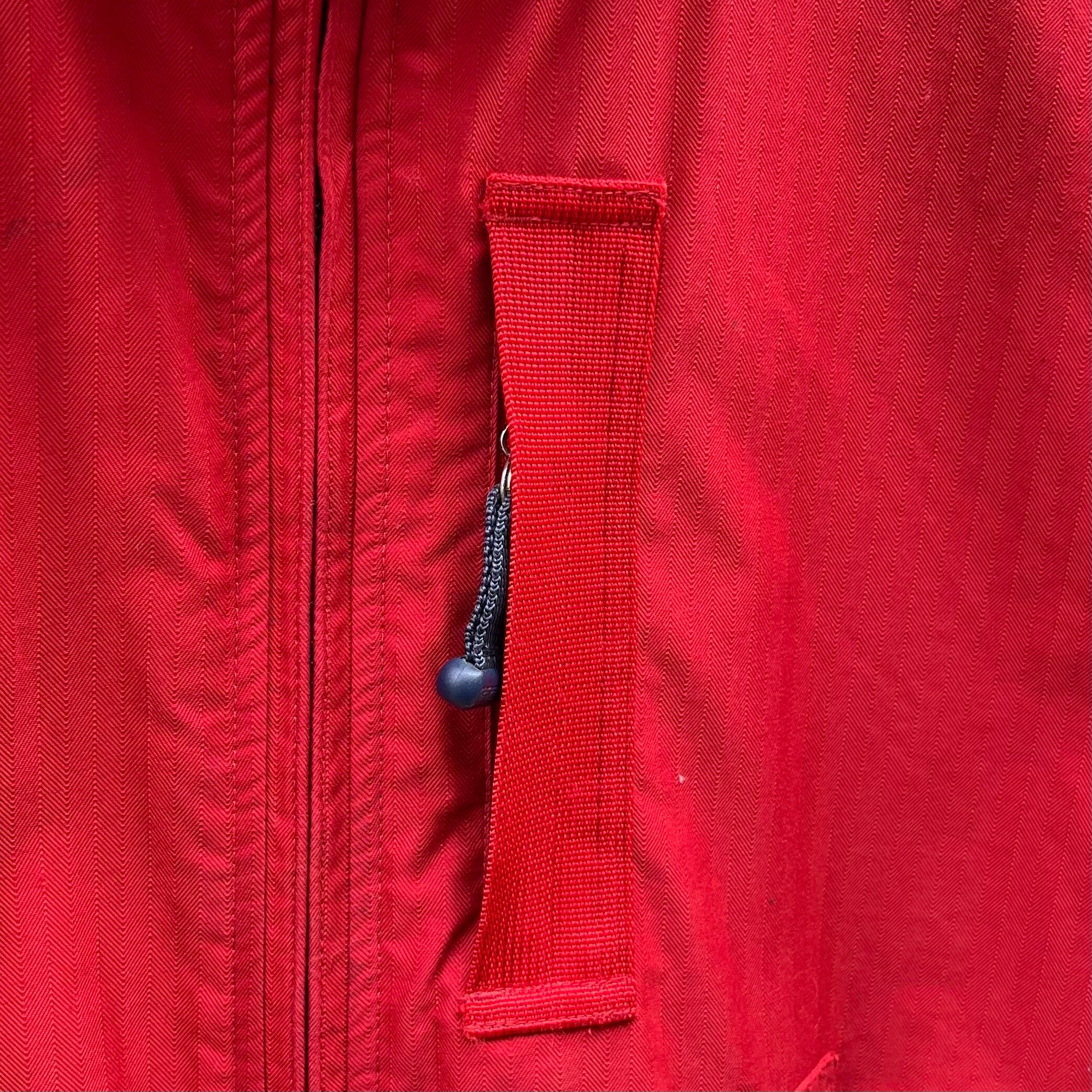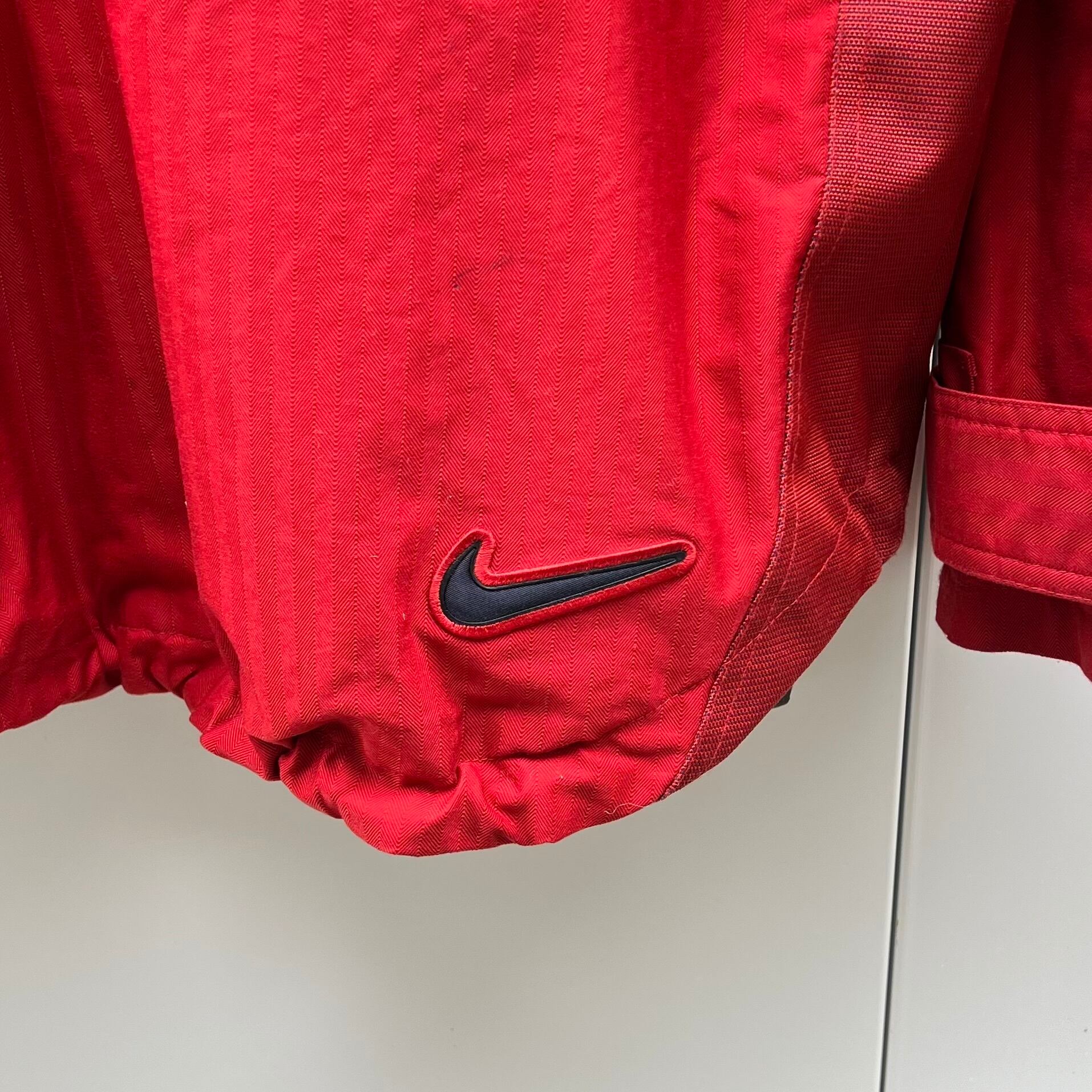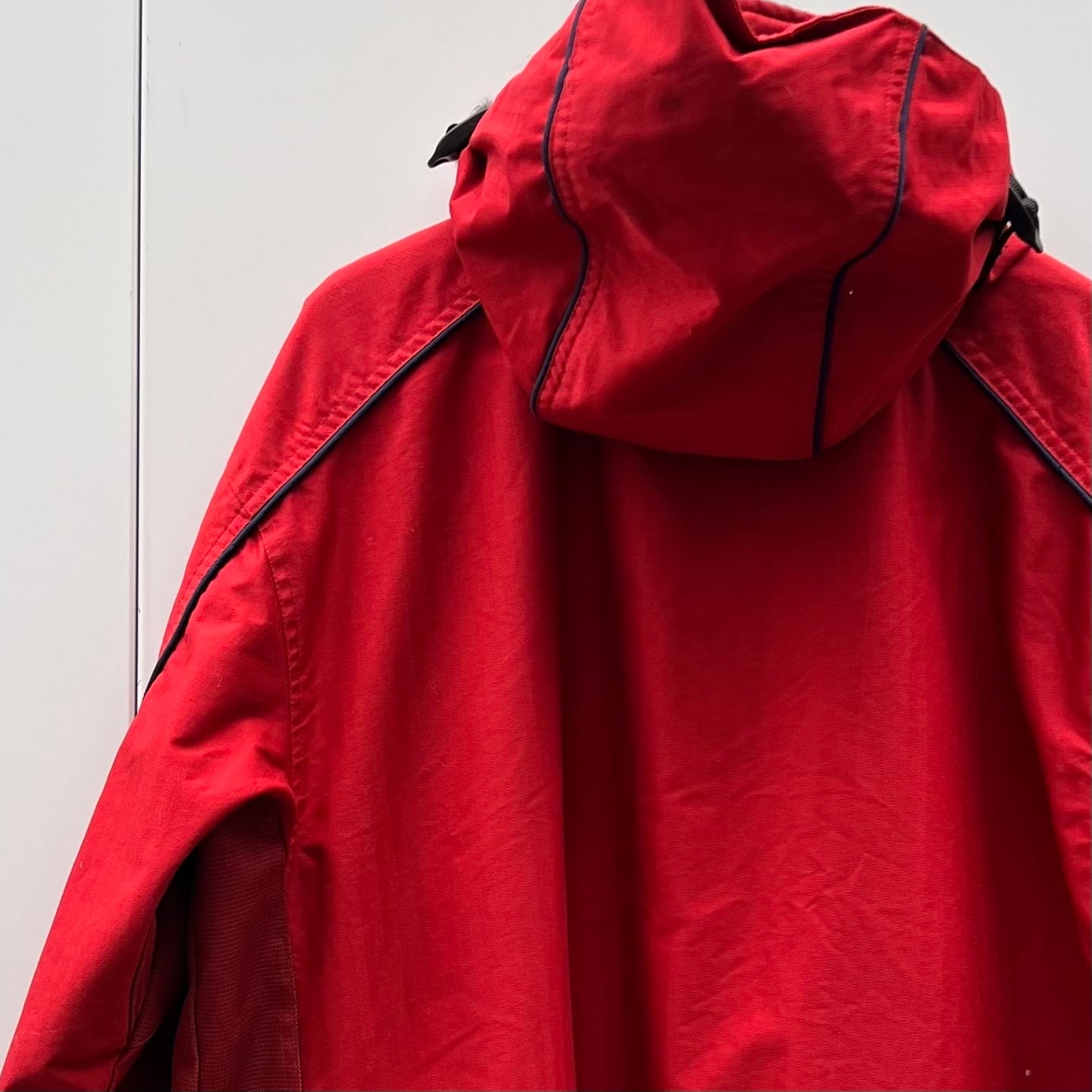レッドxネイビーのナイロン素材、左裾にスウォッシュ刺繍、左袖カフスにACGロゴ刺繍、バック右裾にスウォッシュワッペン、左胸と両サイドにジッパー付きポケット、両サイドにマチ付きポケット、ロゴ入りジッパースライダー、ジッパーでフード脱着、裾にドローコードが付いたデザインです。
