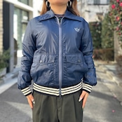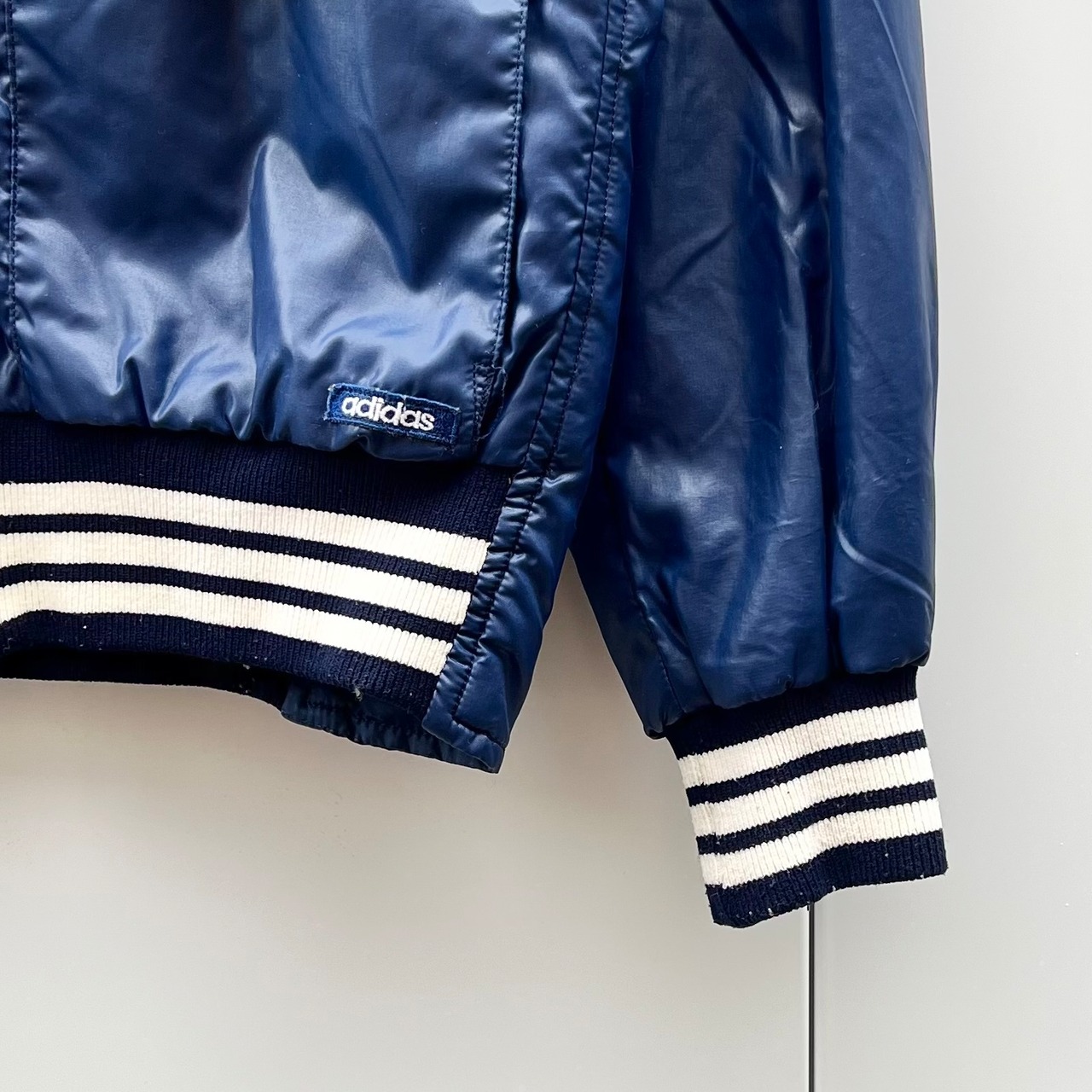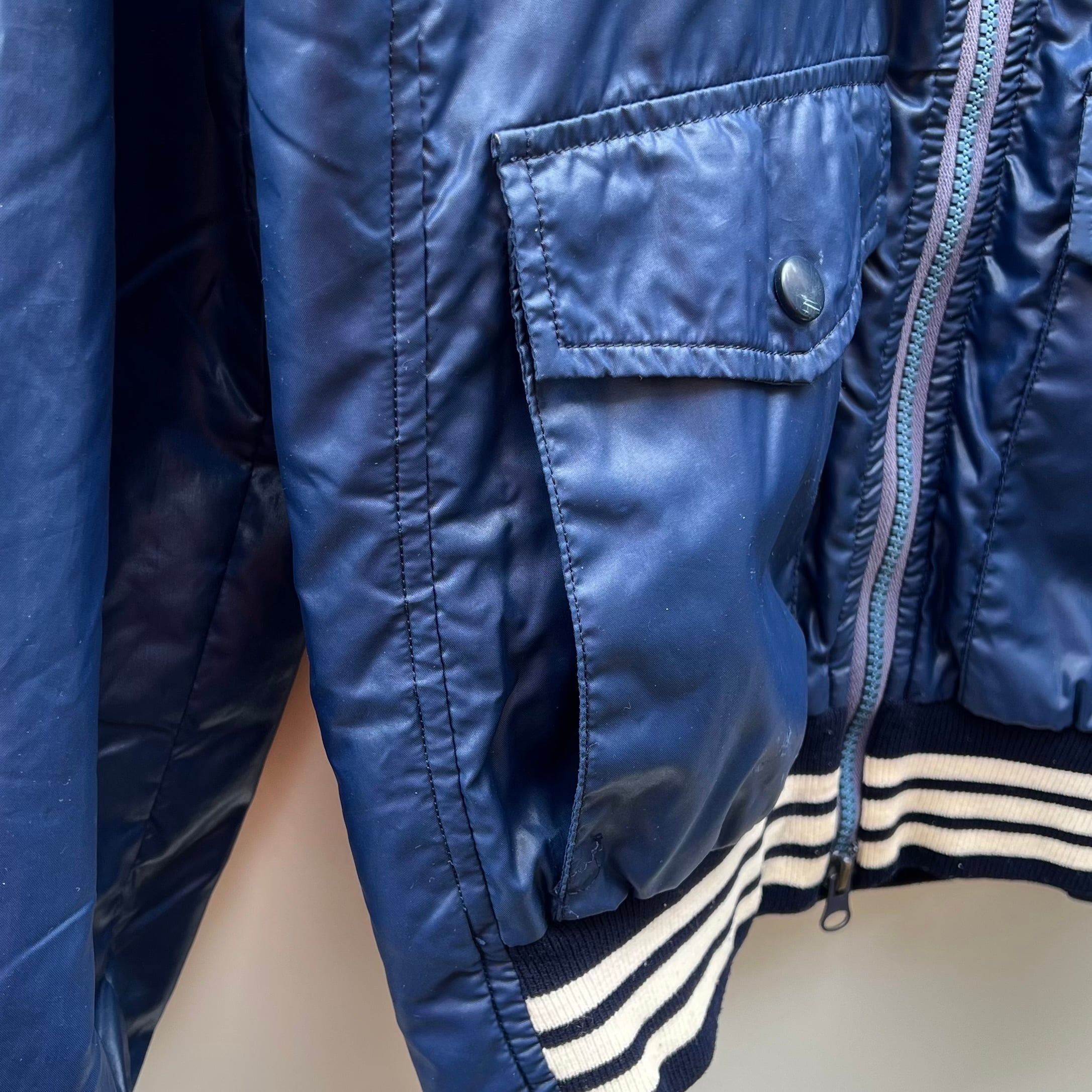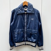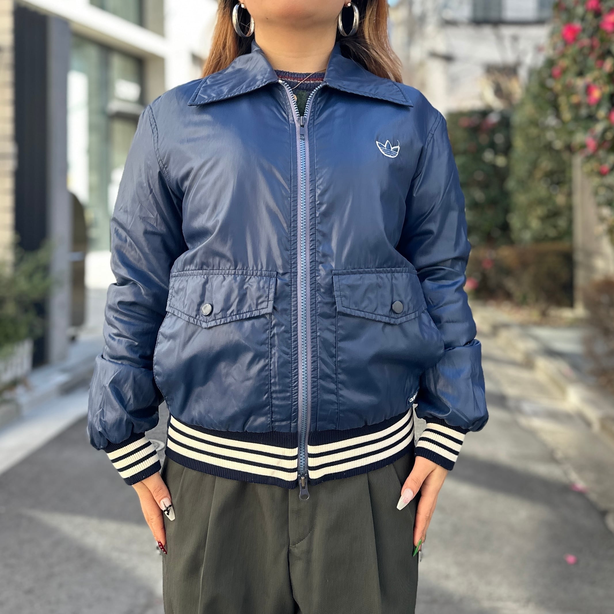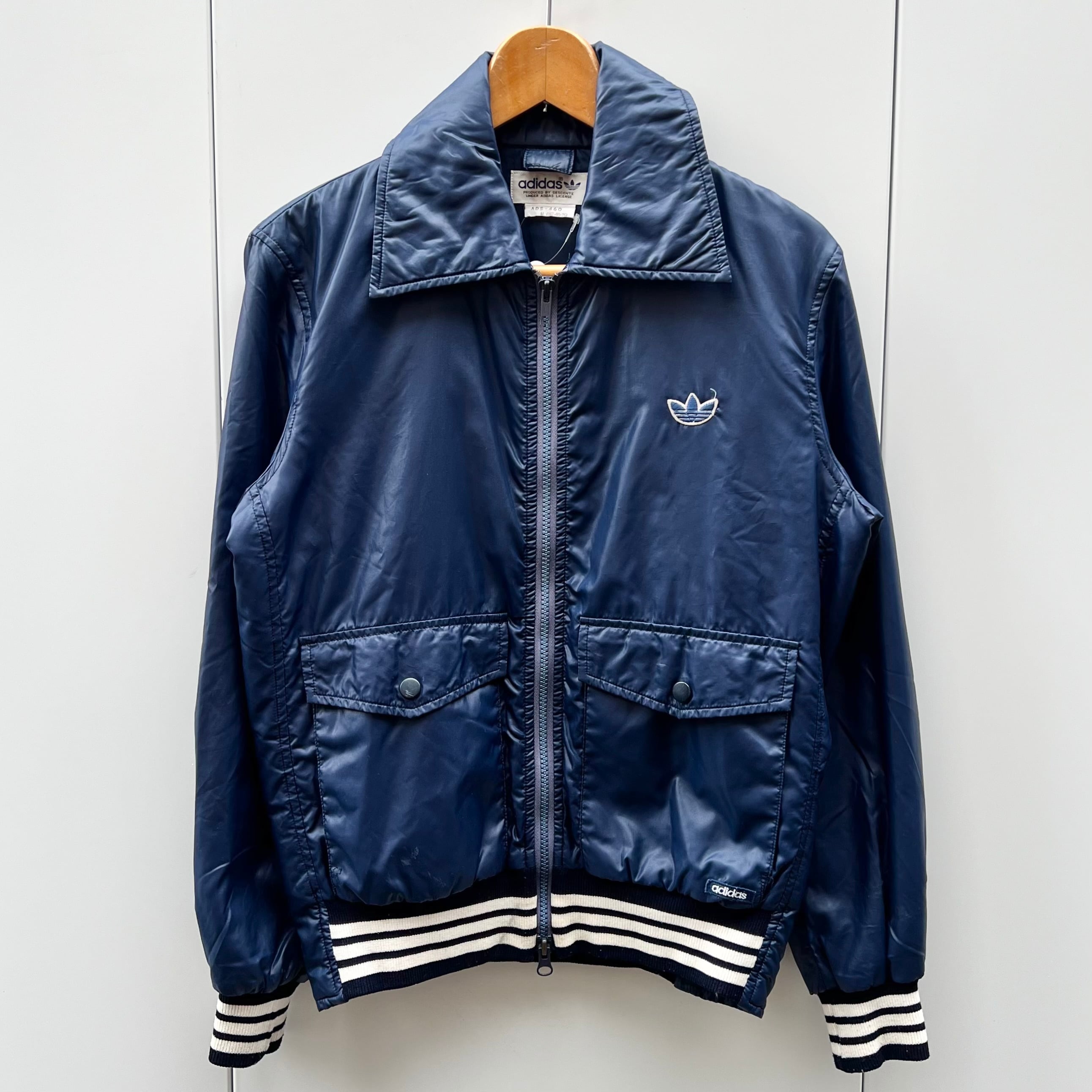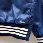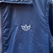 ネイビーのナイロン素材xホワイトライン、左胸にトレフォイルワッペン、左裾にadidasワッペン、フラップ付きとハンドウォームポケットのダブルポケット、ダブルジッパーを使用したデザインです。