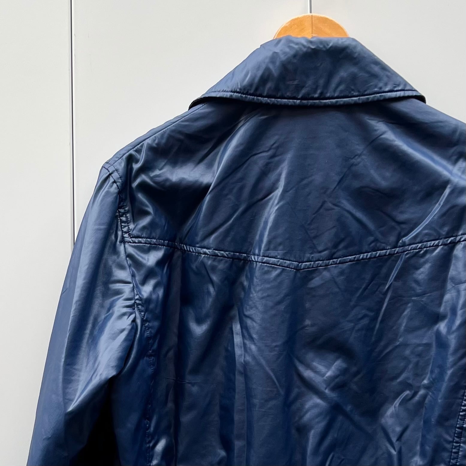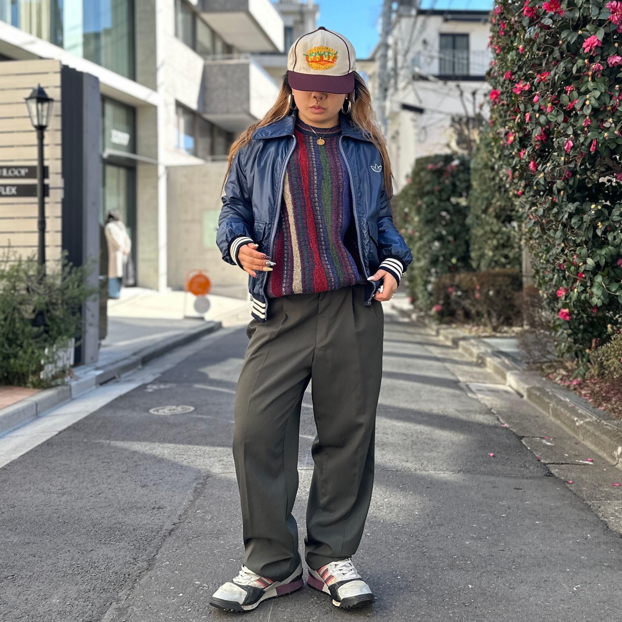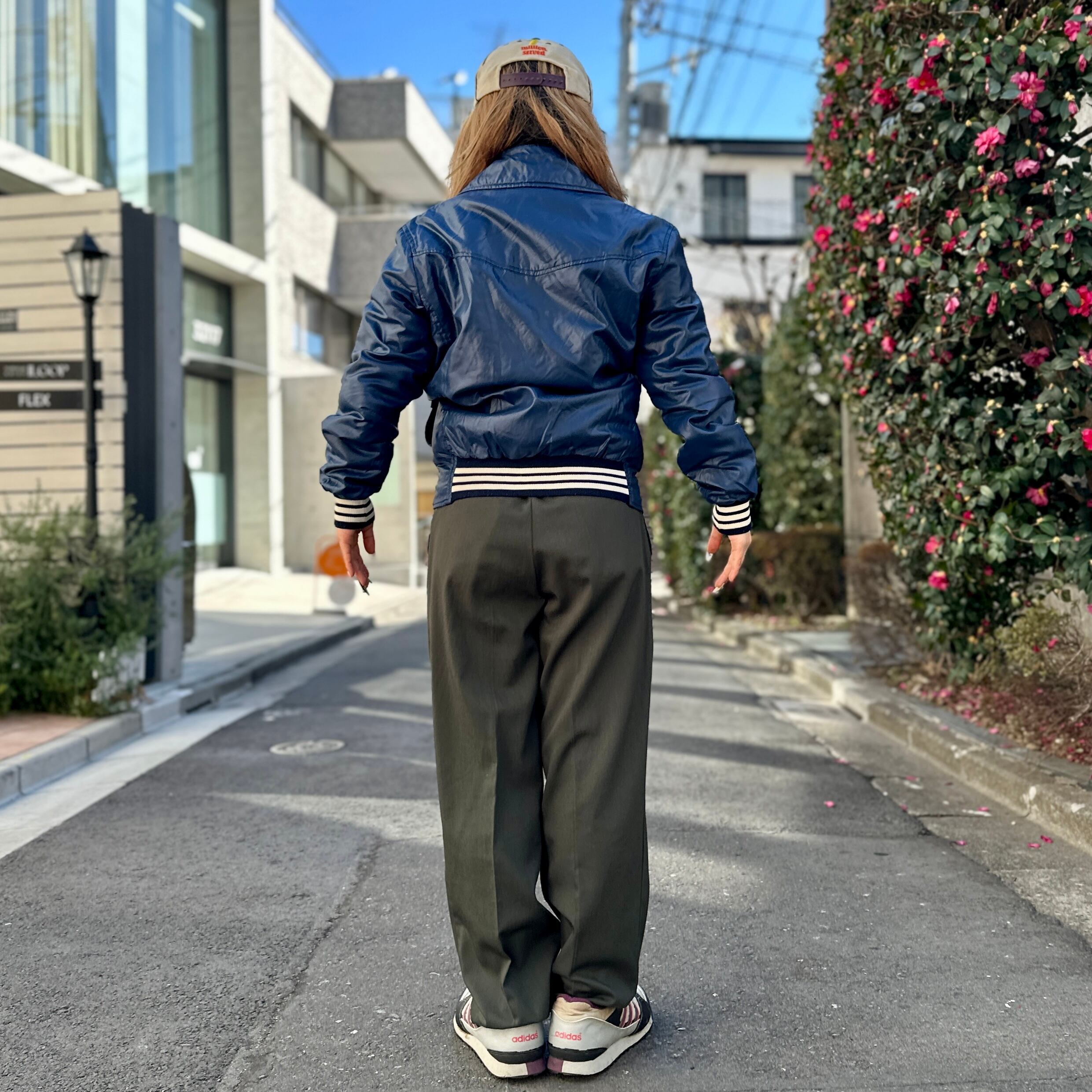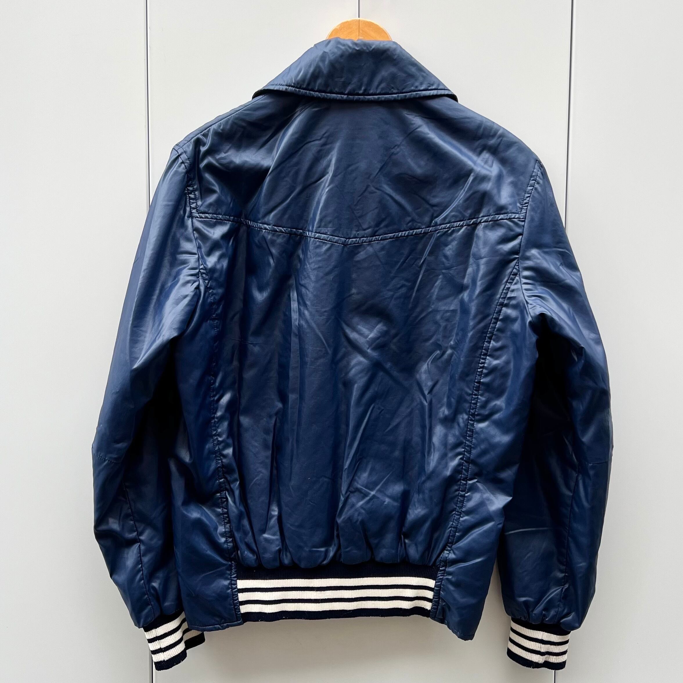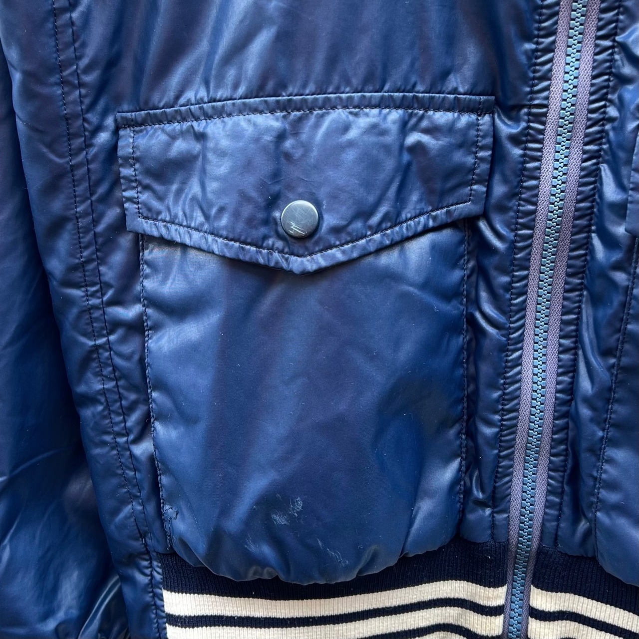 ネイビーのナイロン素材xホワイトライン、左胸にトレフォイルワッペン、左裾にadidasワッペン、フラップ付きとハンドウォームポケットのダブルポケット、ダブルジッパーを使用したデザインです。