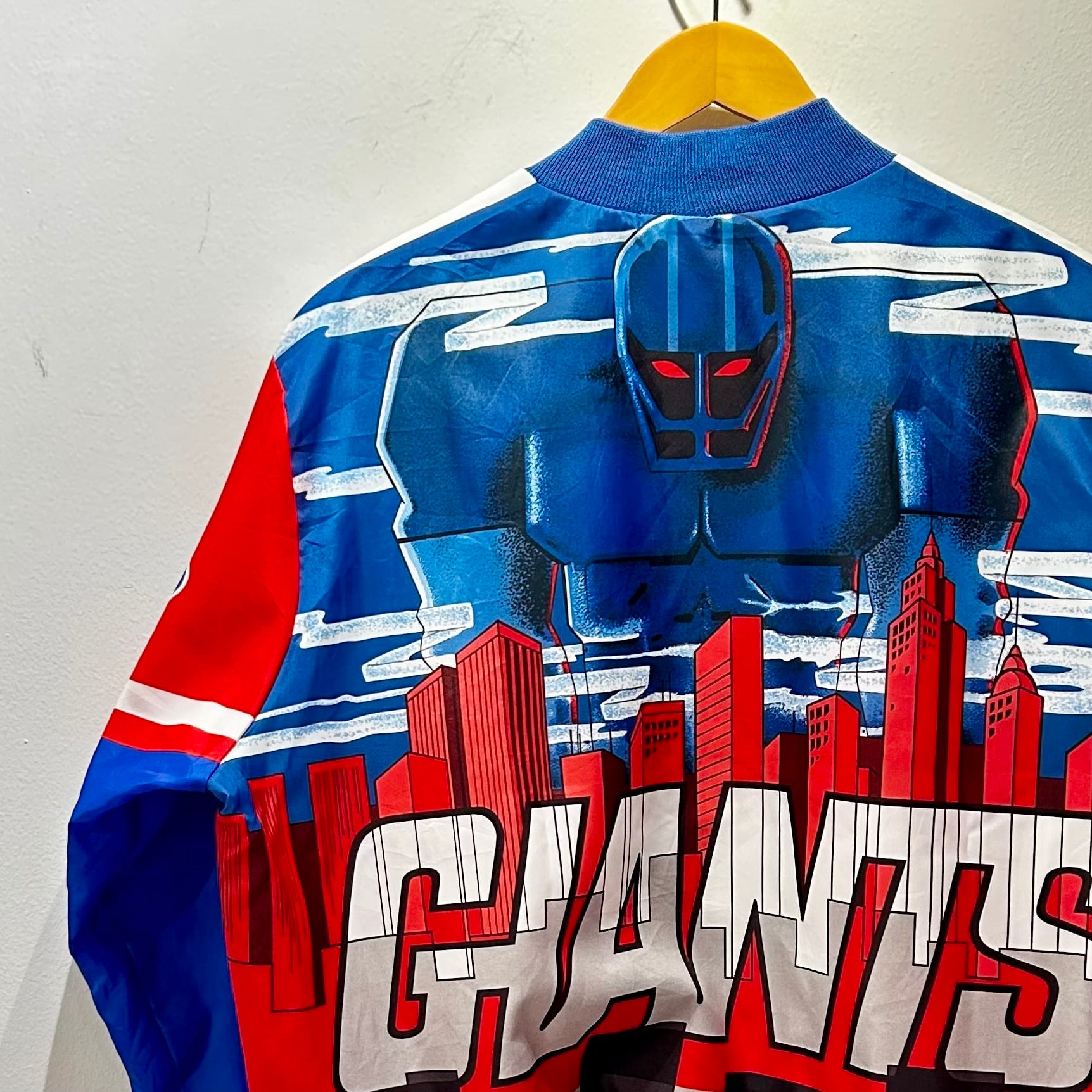ホワイトxブルーxレッドのポリエステル素材、左胸にGIANTSプリント、両袖にGIANTSプリント、バック全面にGIANTSとグラフィックプリントが入るデザインです。