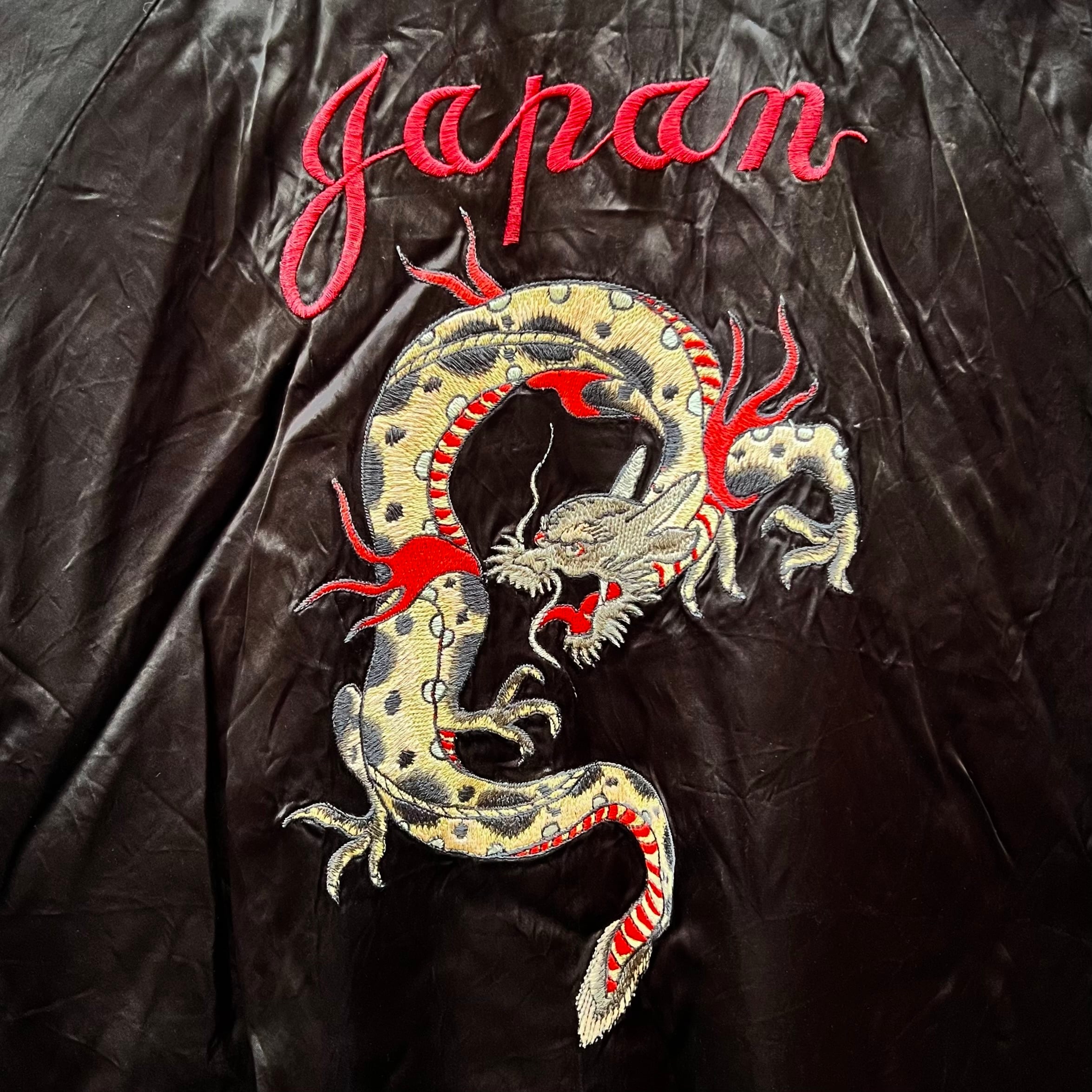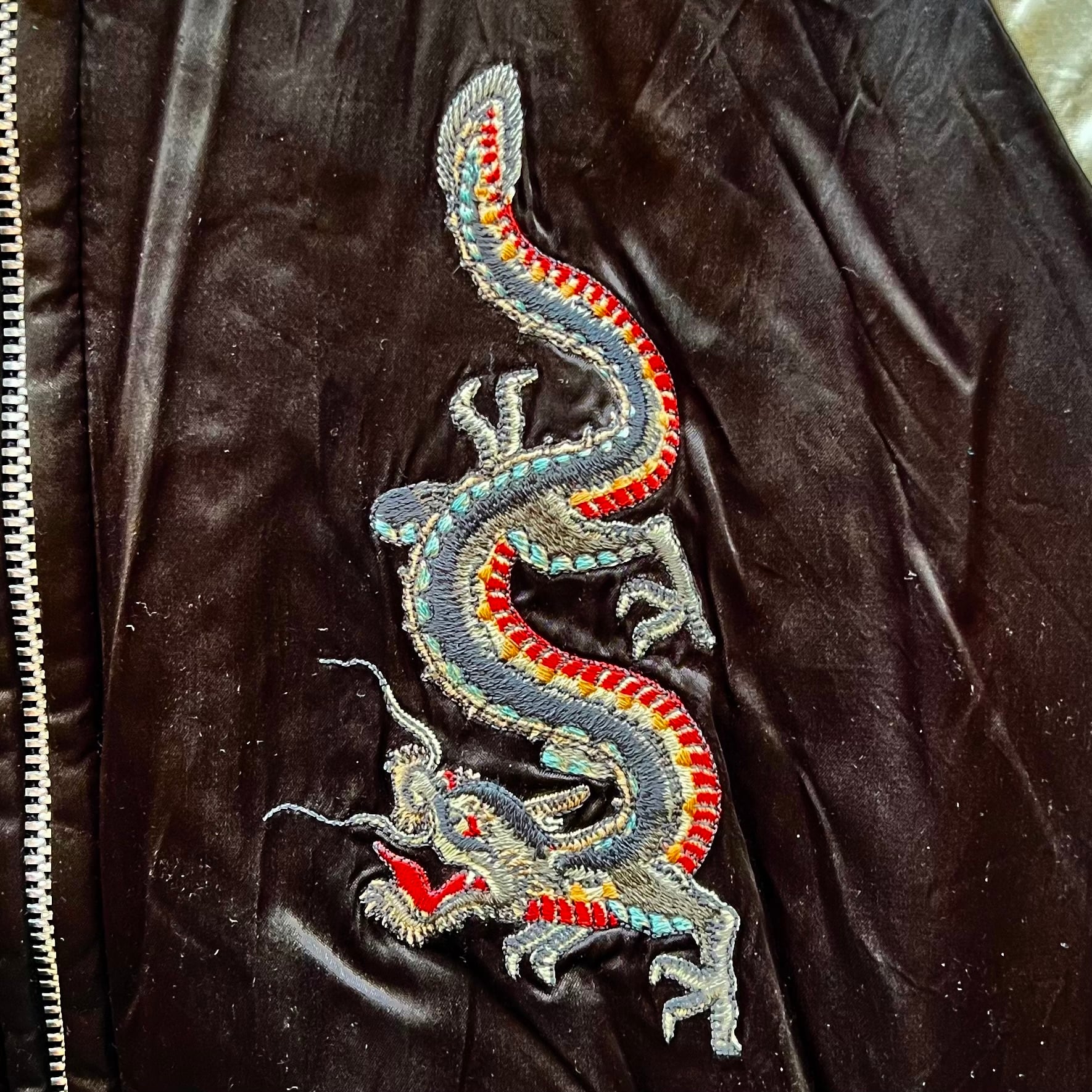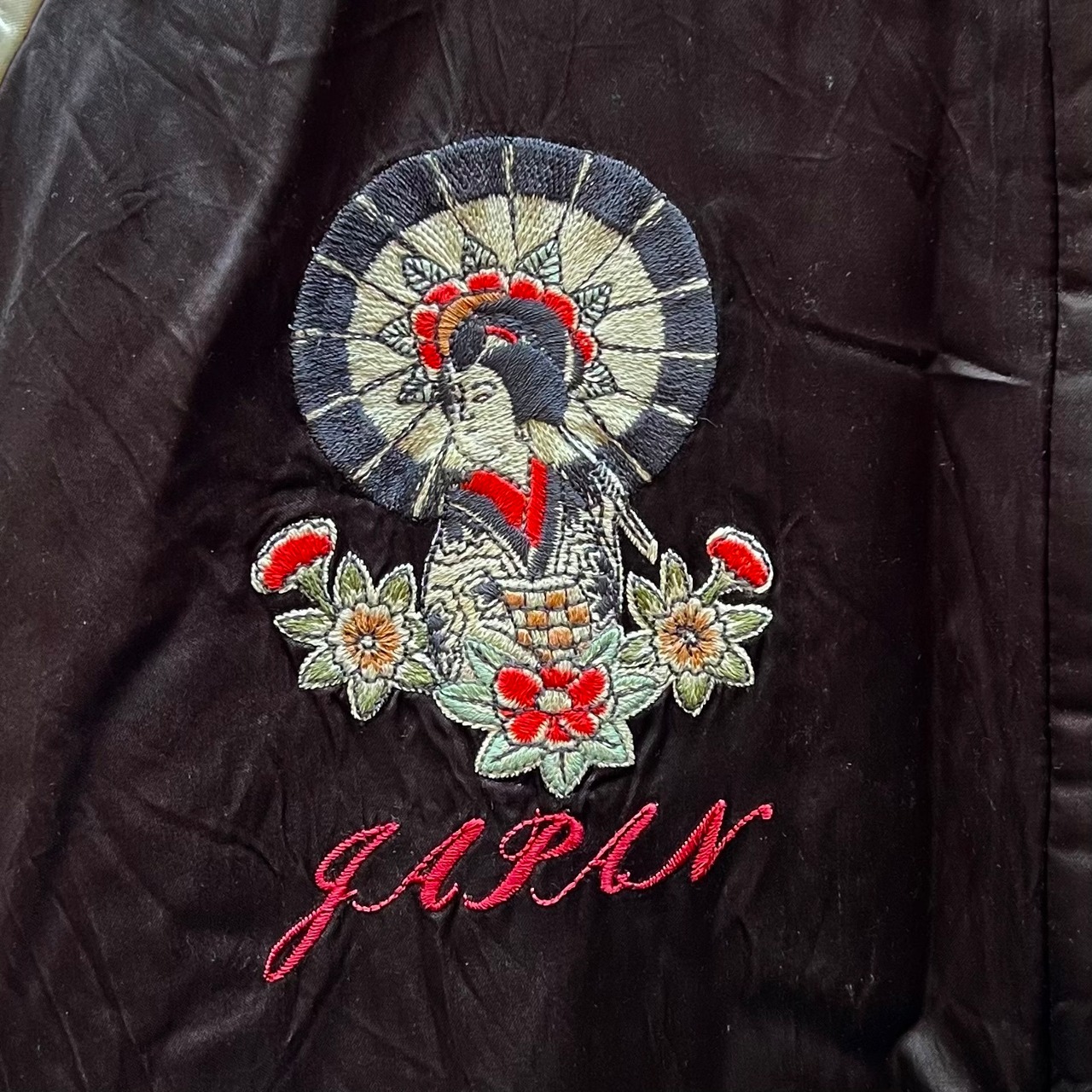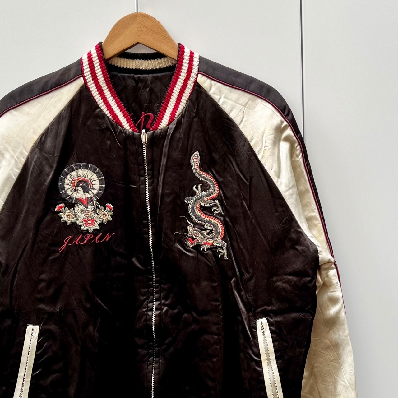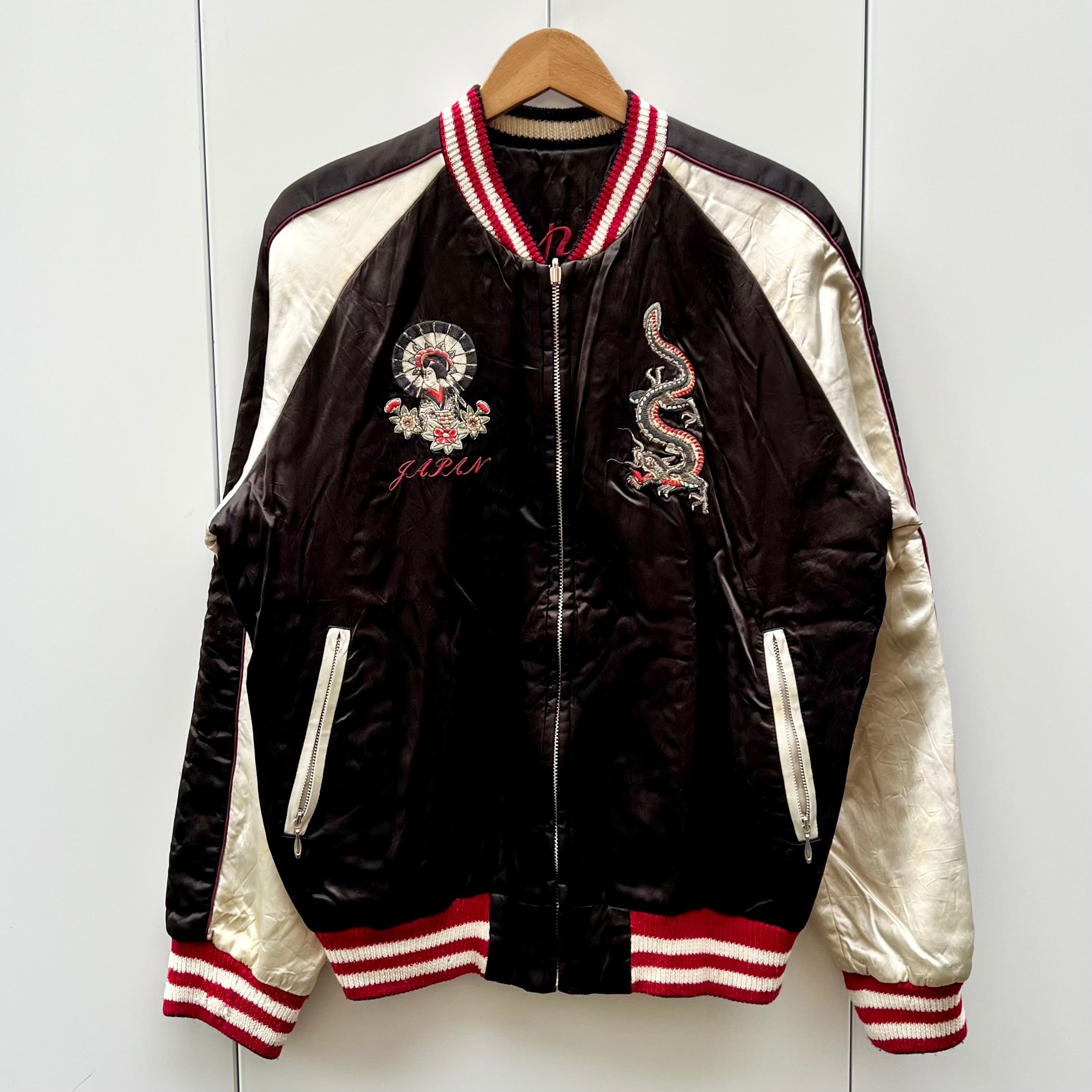 ブラック/オフホワイトxブラックのリバーシブル、ブラック/オフホワイト面、左胸に龍、右胸に芸者とJAPAN、バックに鷹刺繍、ブラック面、左胸に芸者、右胸にヘビとROCKS、バックに龍とJAPAN刺繍、YKKのリバーシブルジッパー、ハンドウォームポケットが付いたデザインです。