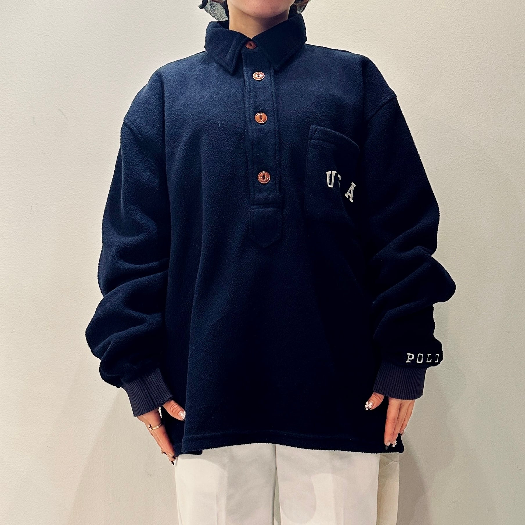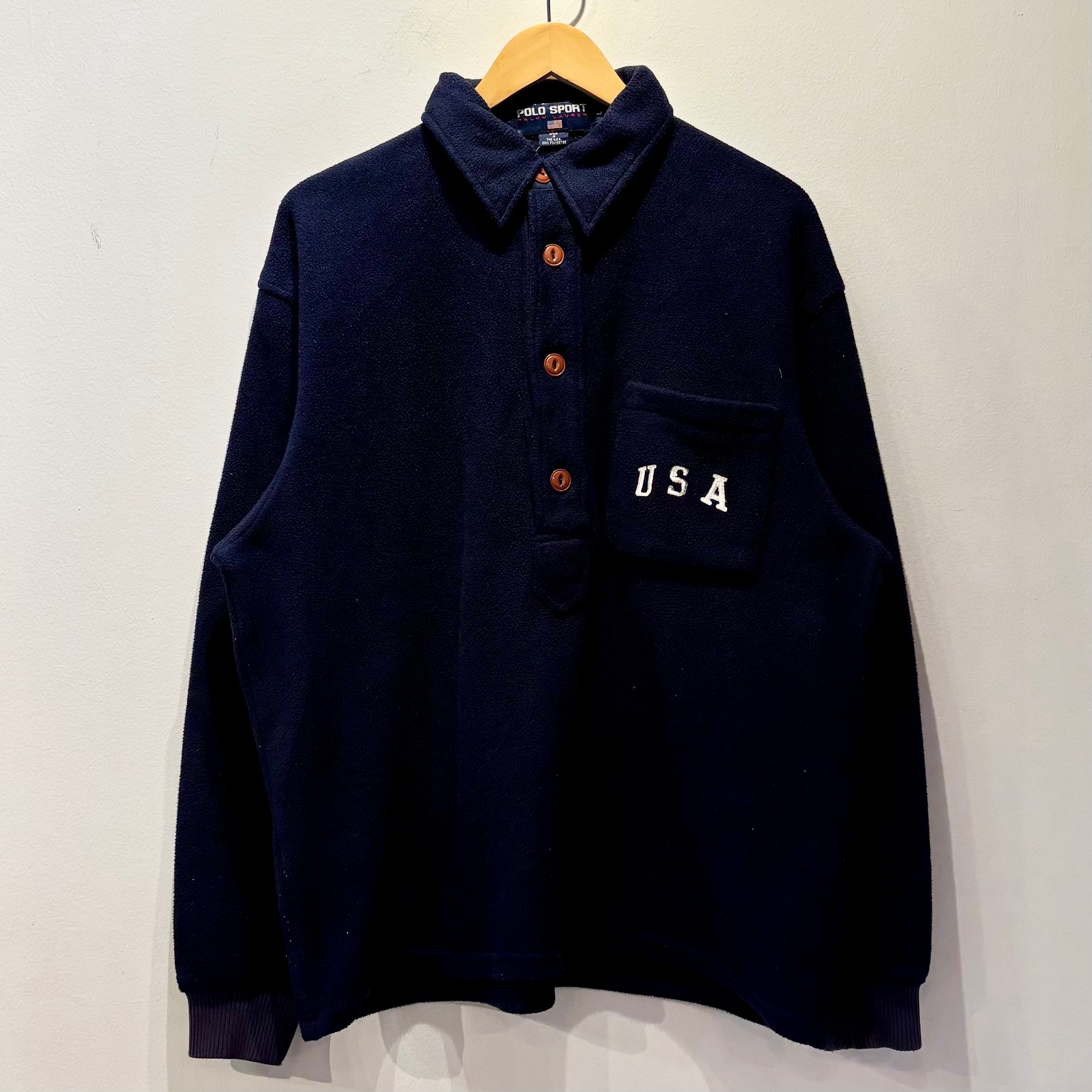 ネイビーのフリース素材、左胸にポケットにUSA刺繍、左袖にPOLO刺繍、4つのボタンで開閉するプルオーバーのデザインです。