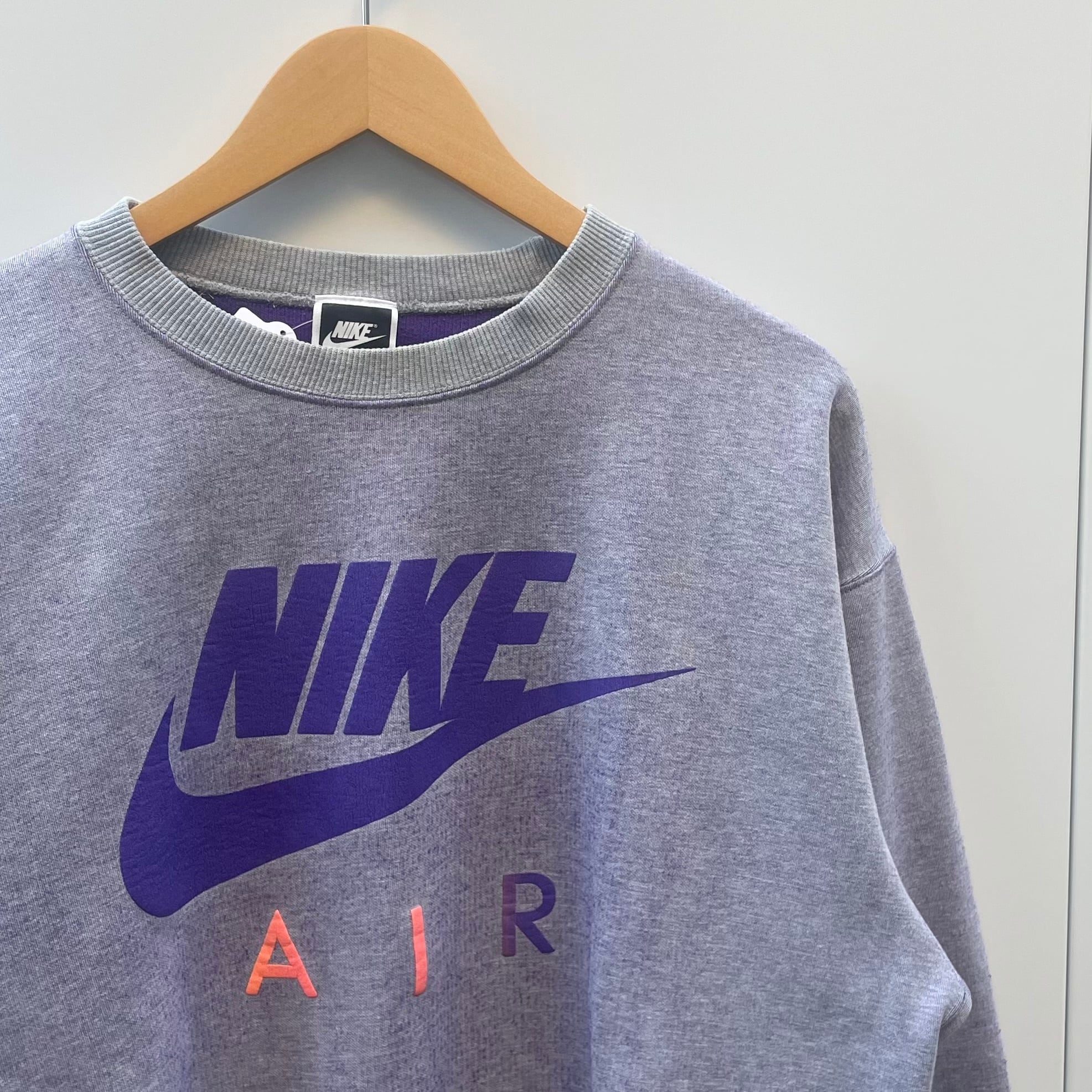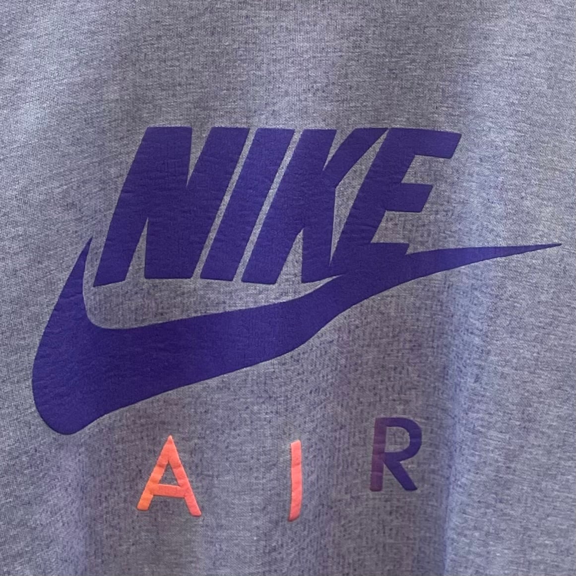 グレーxパープルのポリエステル混素材、フロントにNIKE AIRのビッグロゴプリントが入るシンプルデザインです。