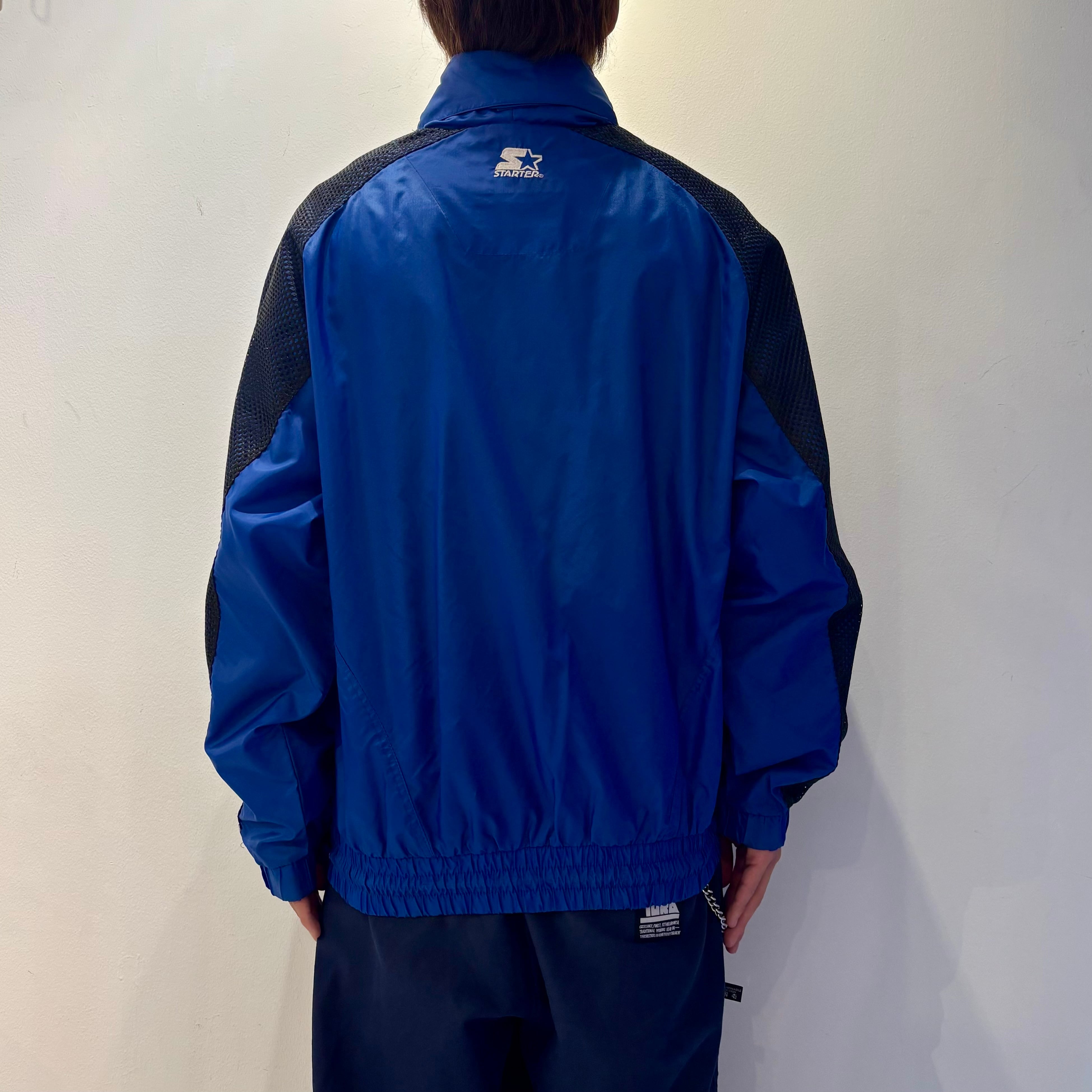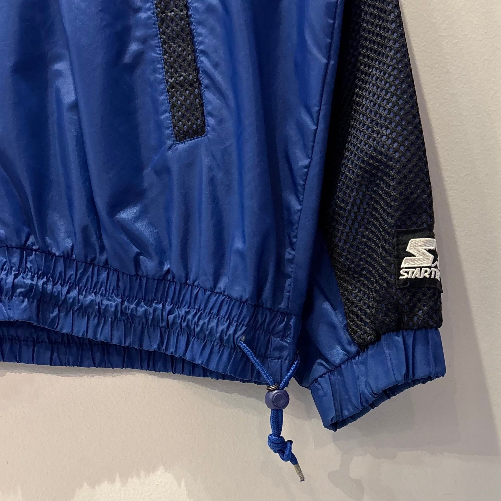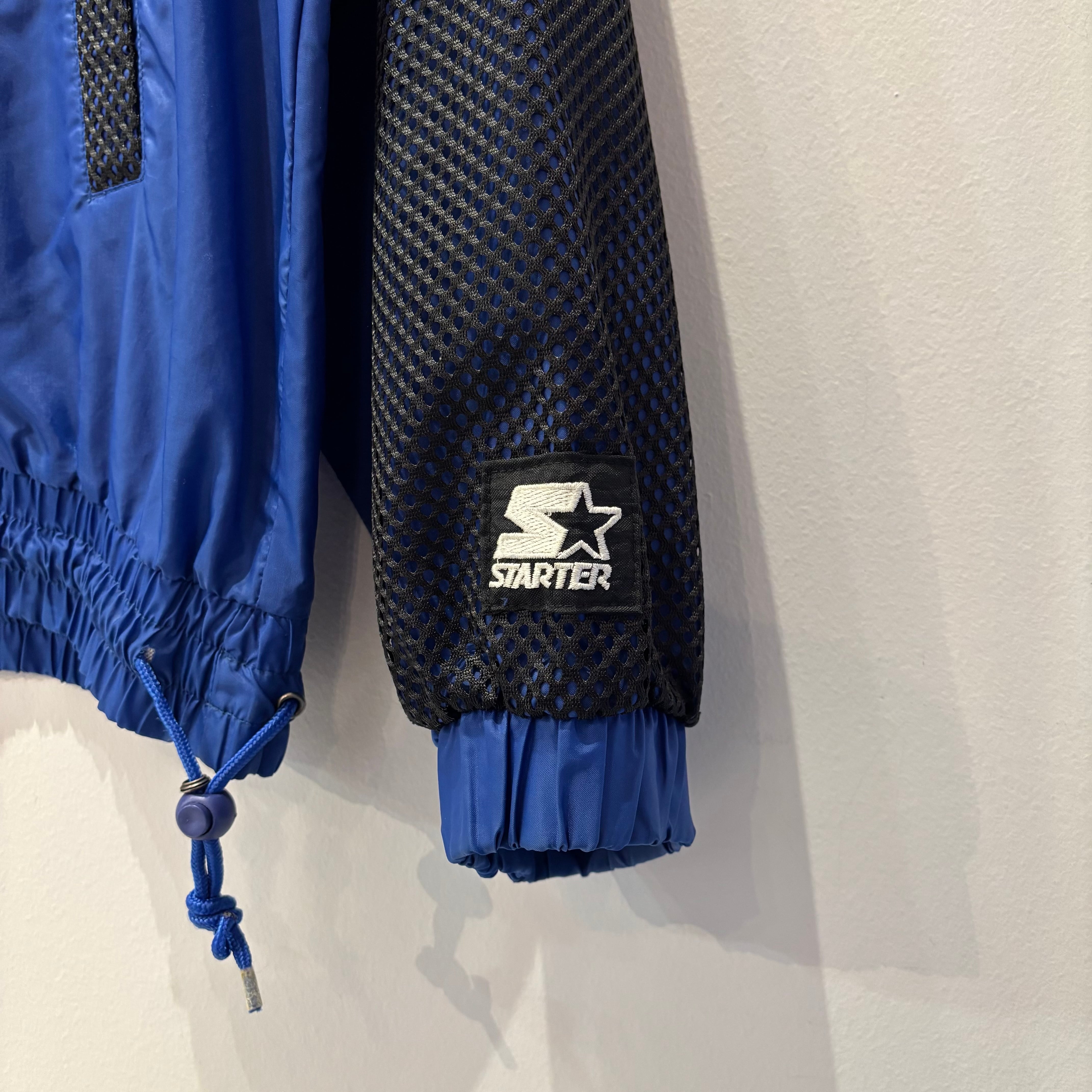 ブルーのナイロン素材xブラックメッシュ、左胸にロゴマーク刺繍、バック襟元と左袖にSTARTERロゴマーク刺繍、裾に紐入り、ハンドウォームポケットが付いたデザインです。