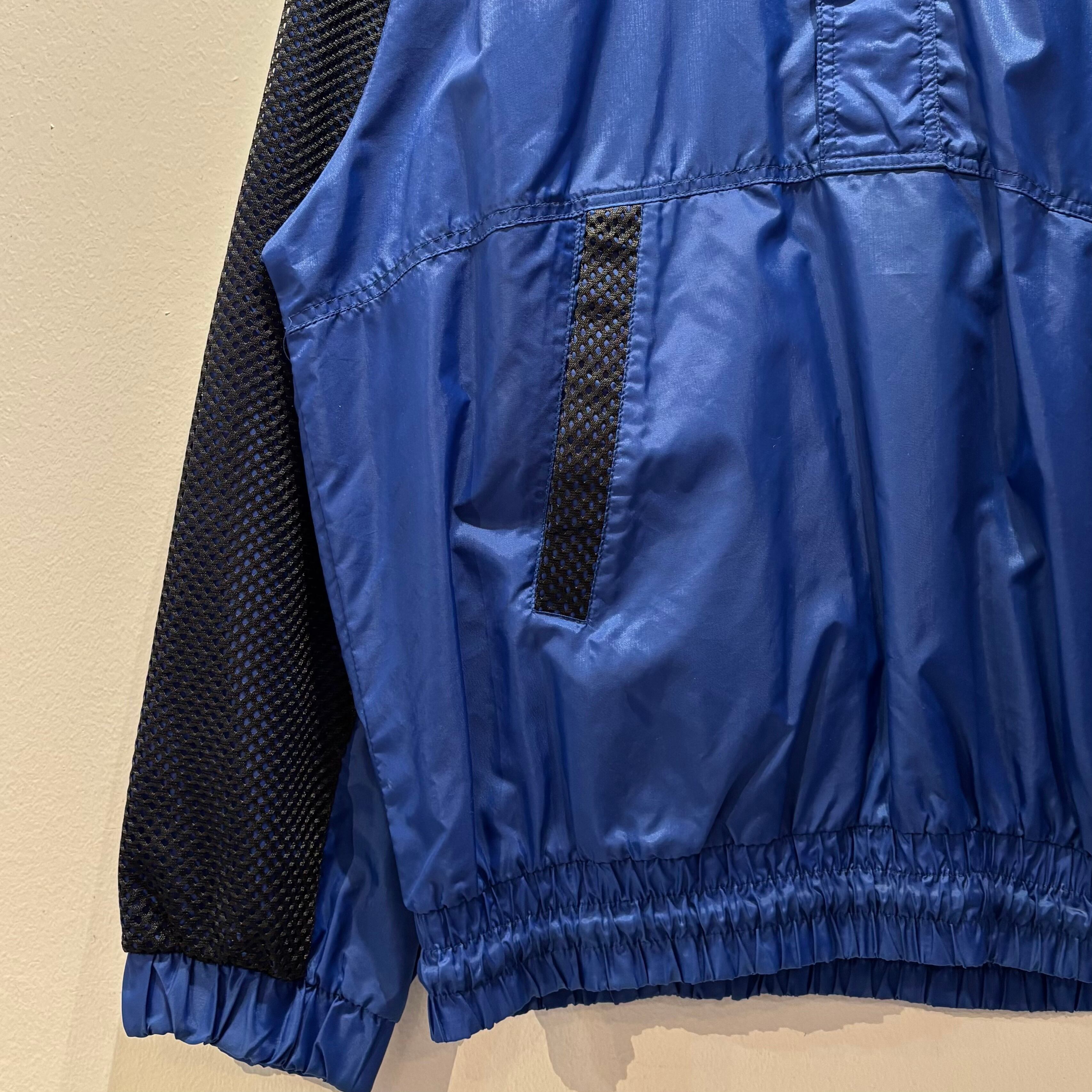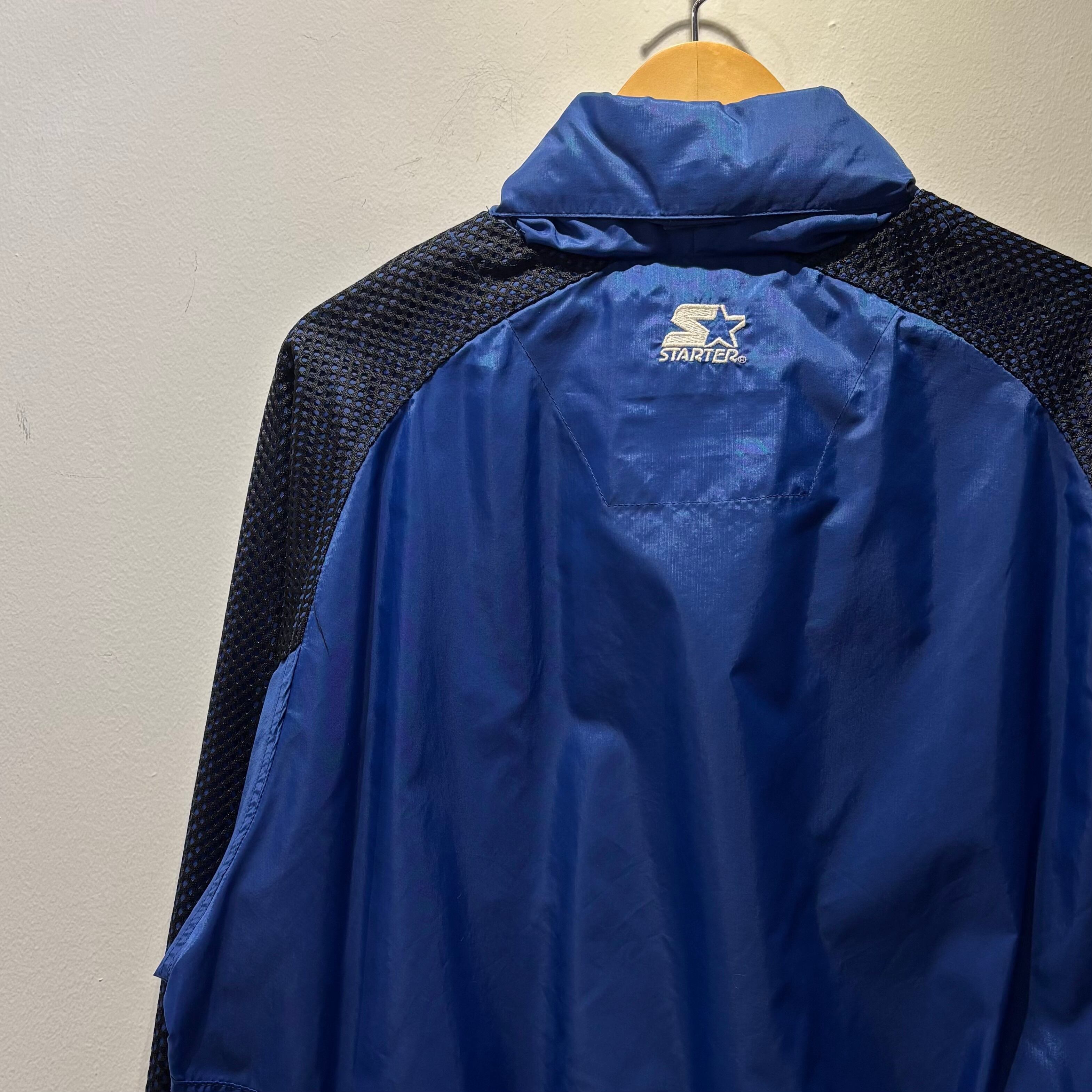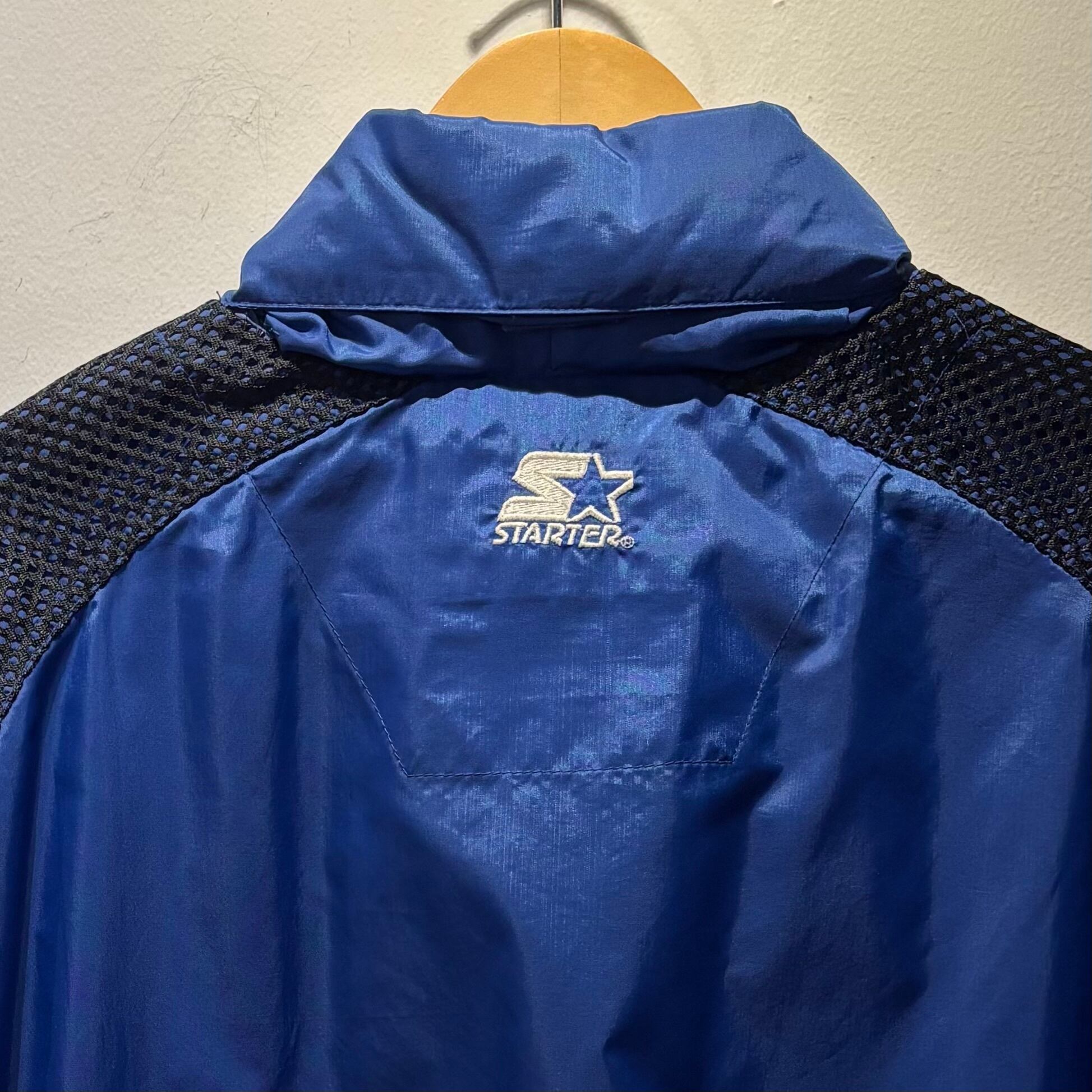 ブルーのナイロン素材xブラックメッシュ、左胸にロゴマーク刺繍、バック襟元と左袖にSTARTERロゴマーク刺繍、裾に紐入り、ハンドウォームポケットが付いたデザインです。