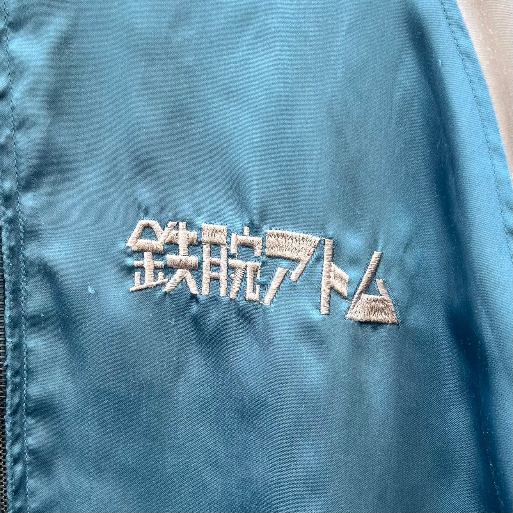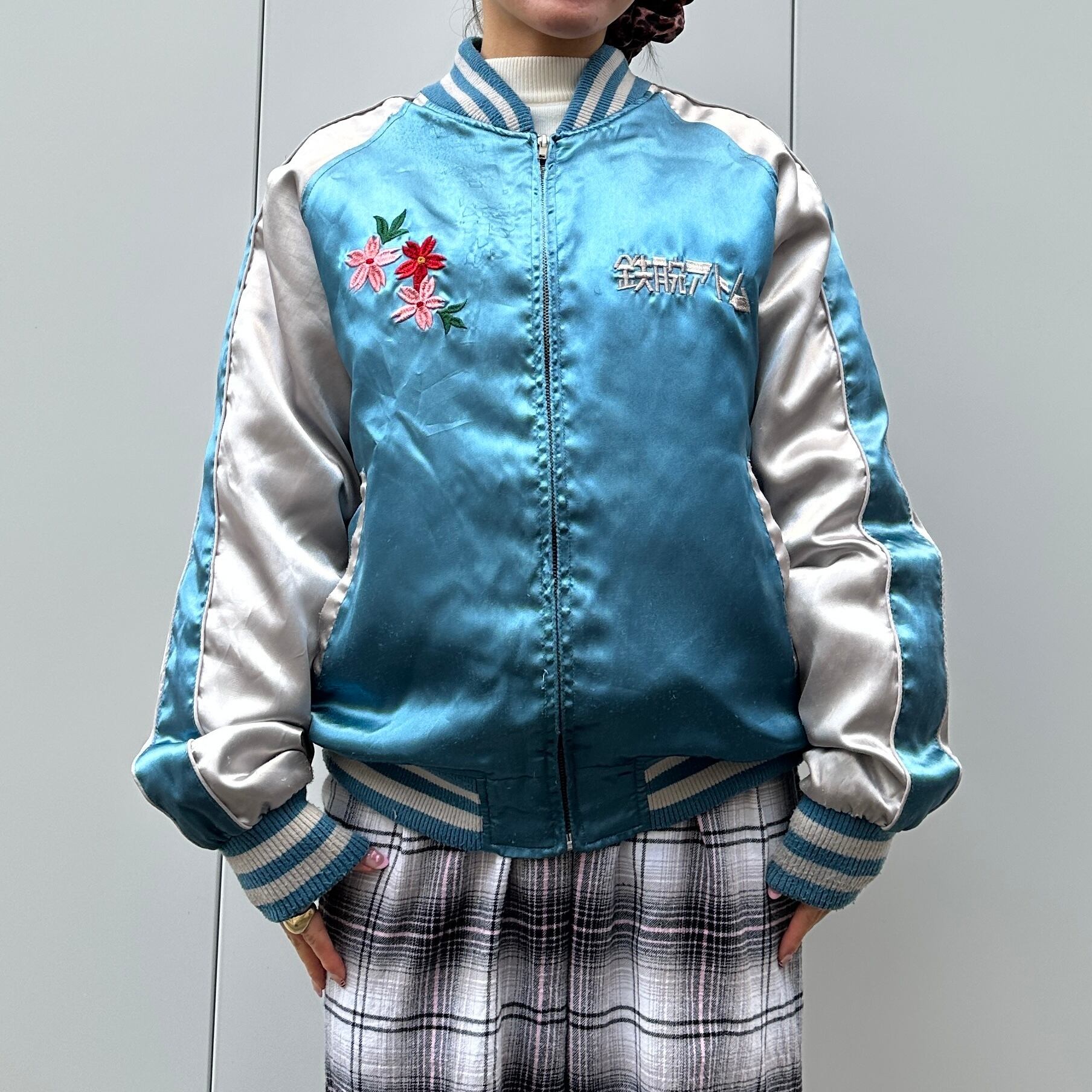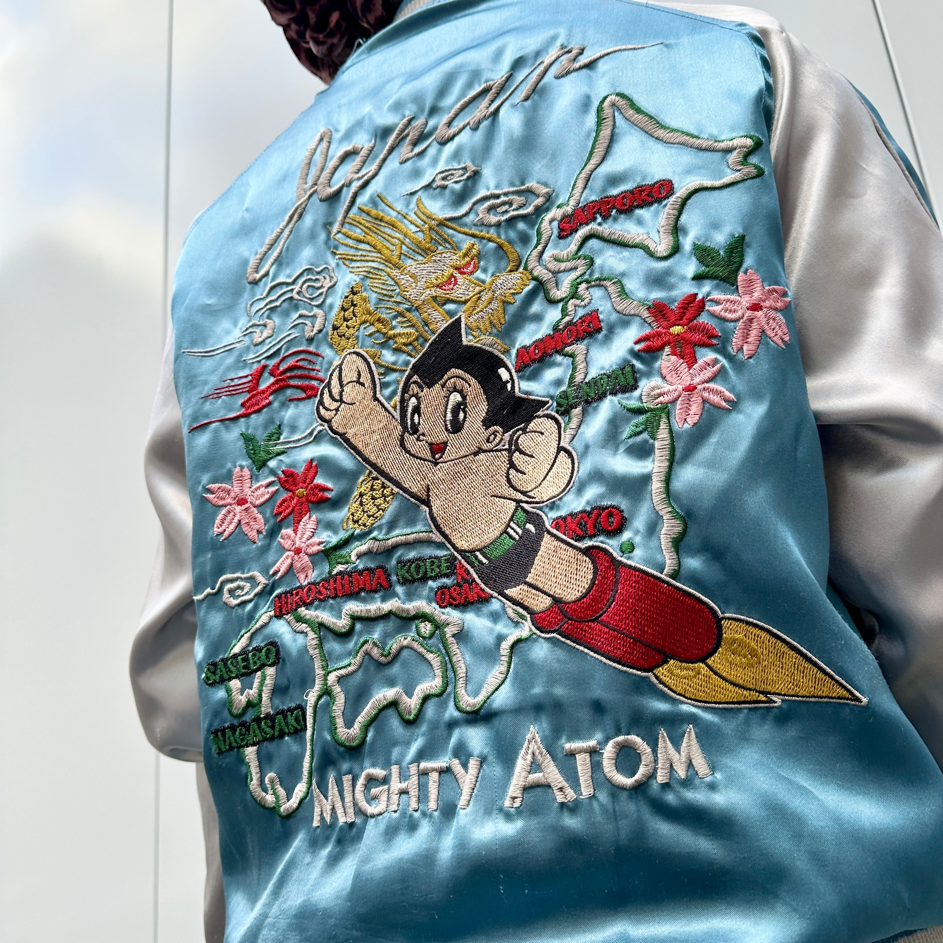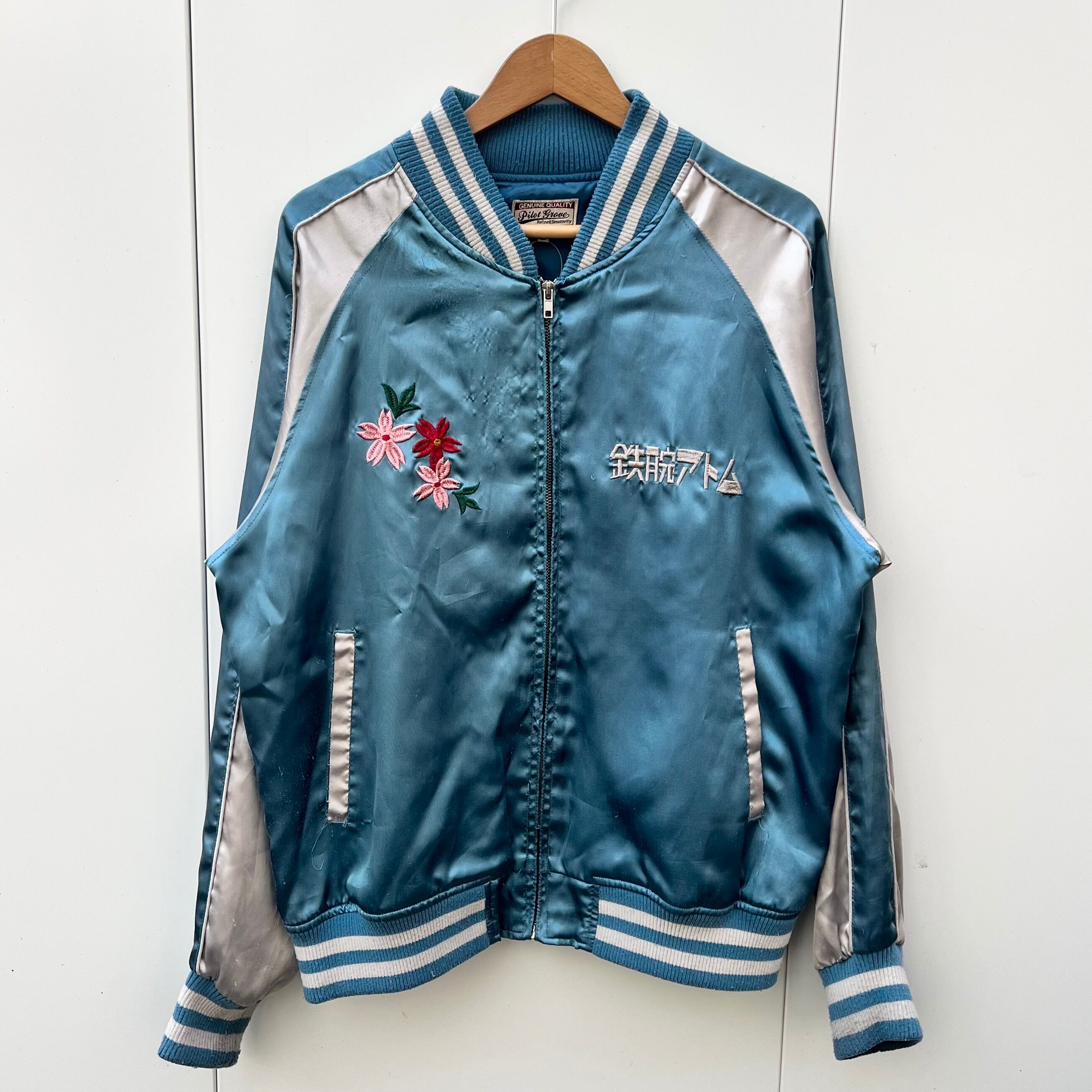 サックスブルーxシルバーのポリエステル素材、左胸に鉄腕アトム、右胸にサクラ刺繍、バックにJAPAN、日本、MIGHTY ATOM刺繍、ハンドウォームポケットが付いたデザインです。