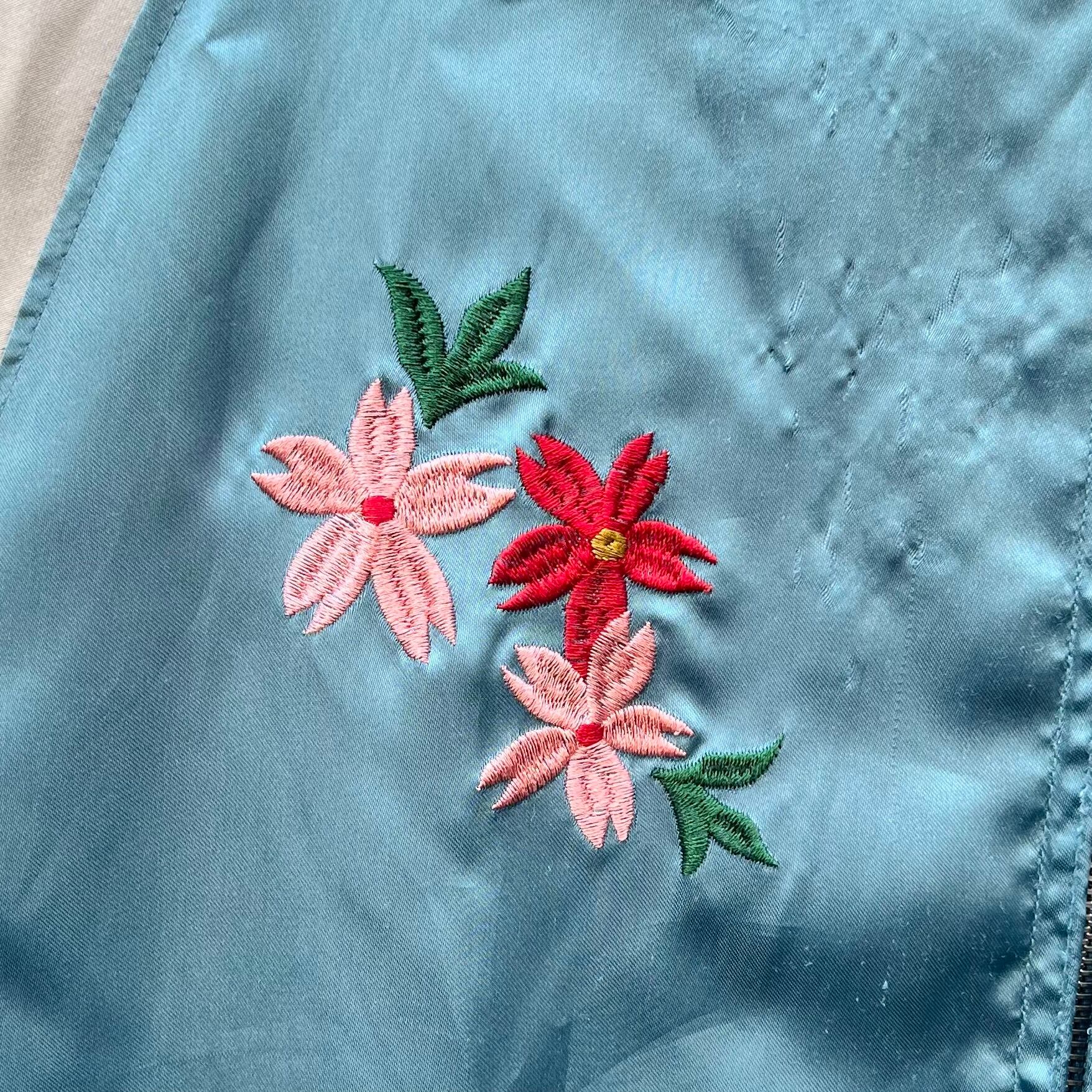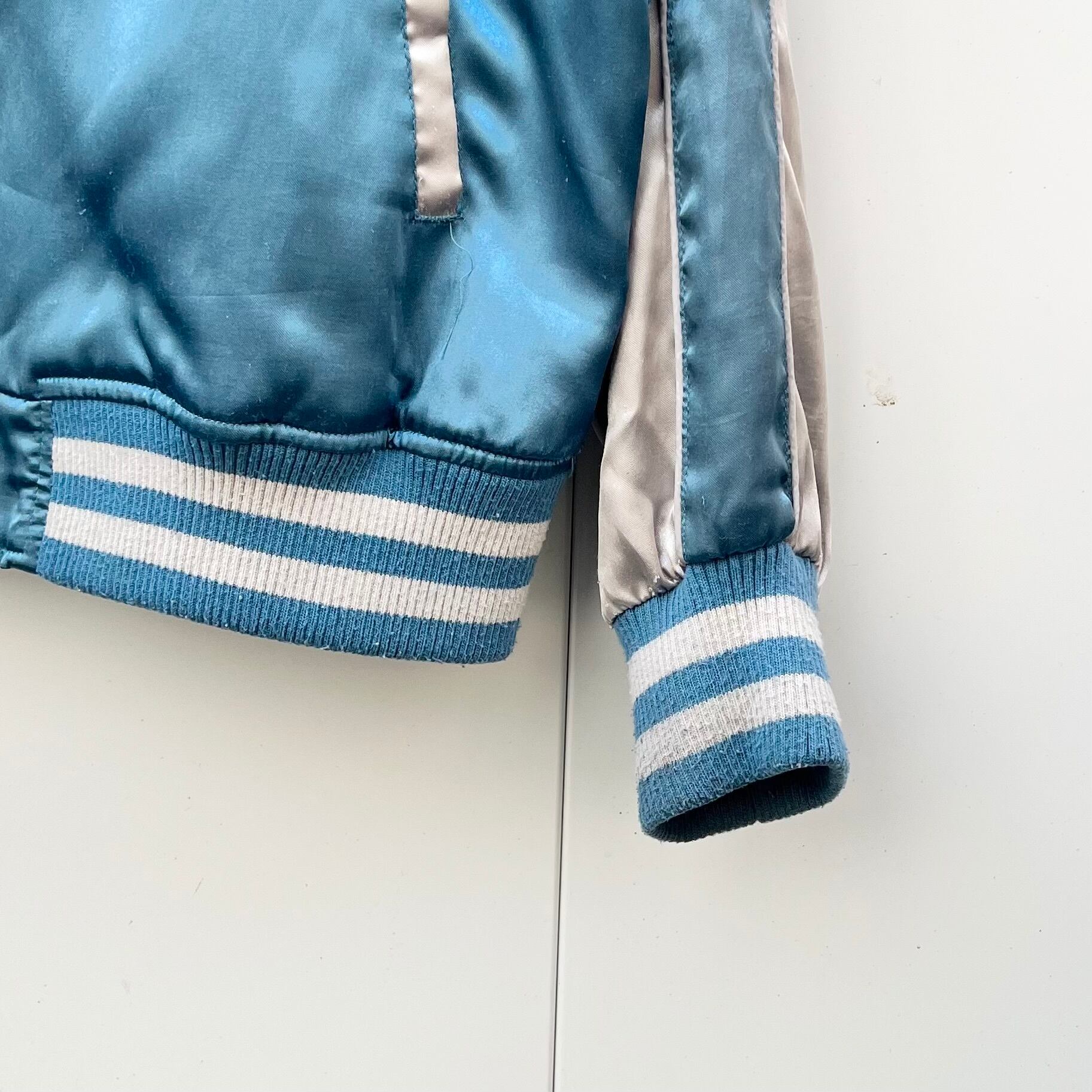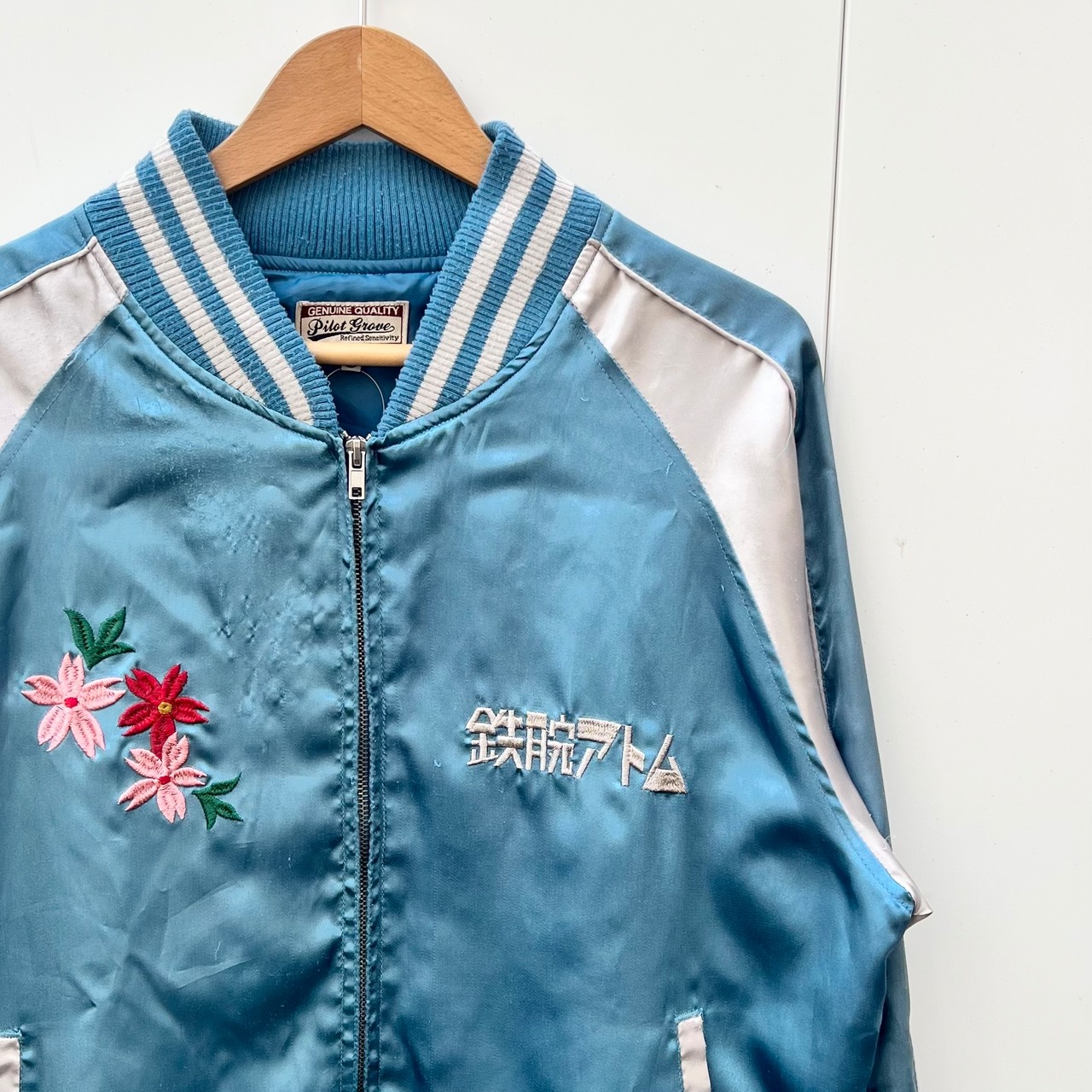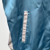 サックスブルーxシルバーのポリエステル素材、左胸に鉄腕アトム、右胸にサクラ刺繍、バックにJAPAN、日本、MIGHTY ATOM刺繍、ハンドウォームポケットが付いたデザインです。