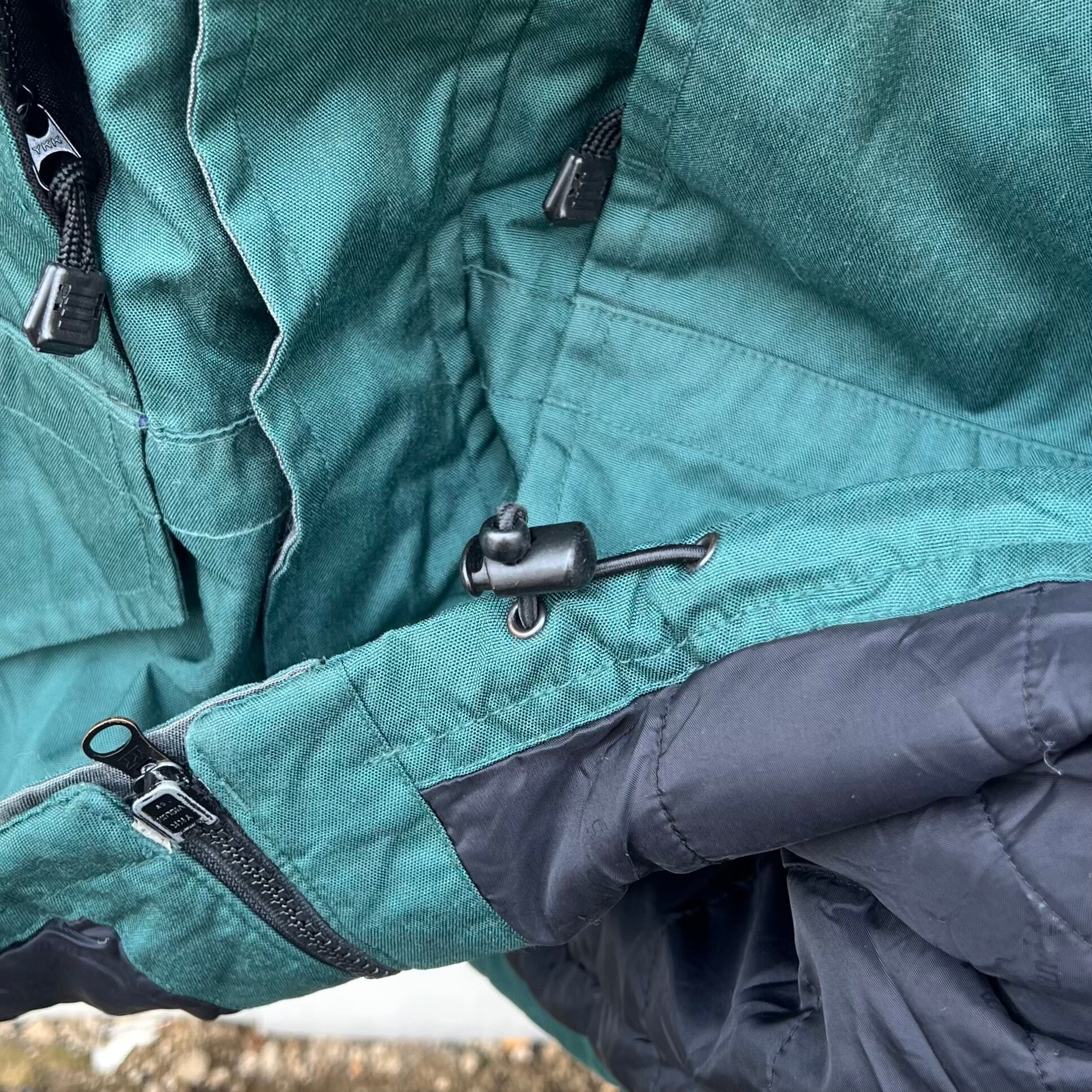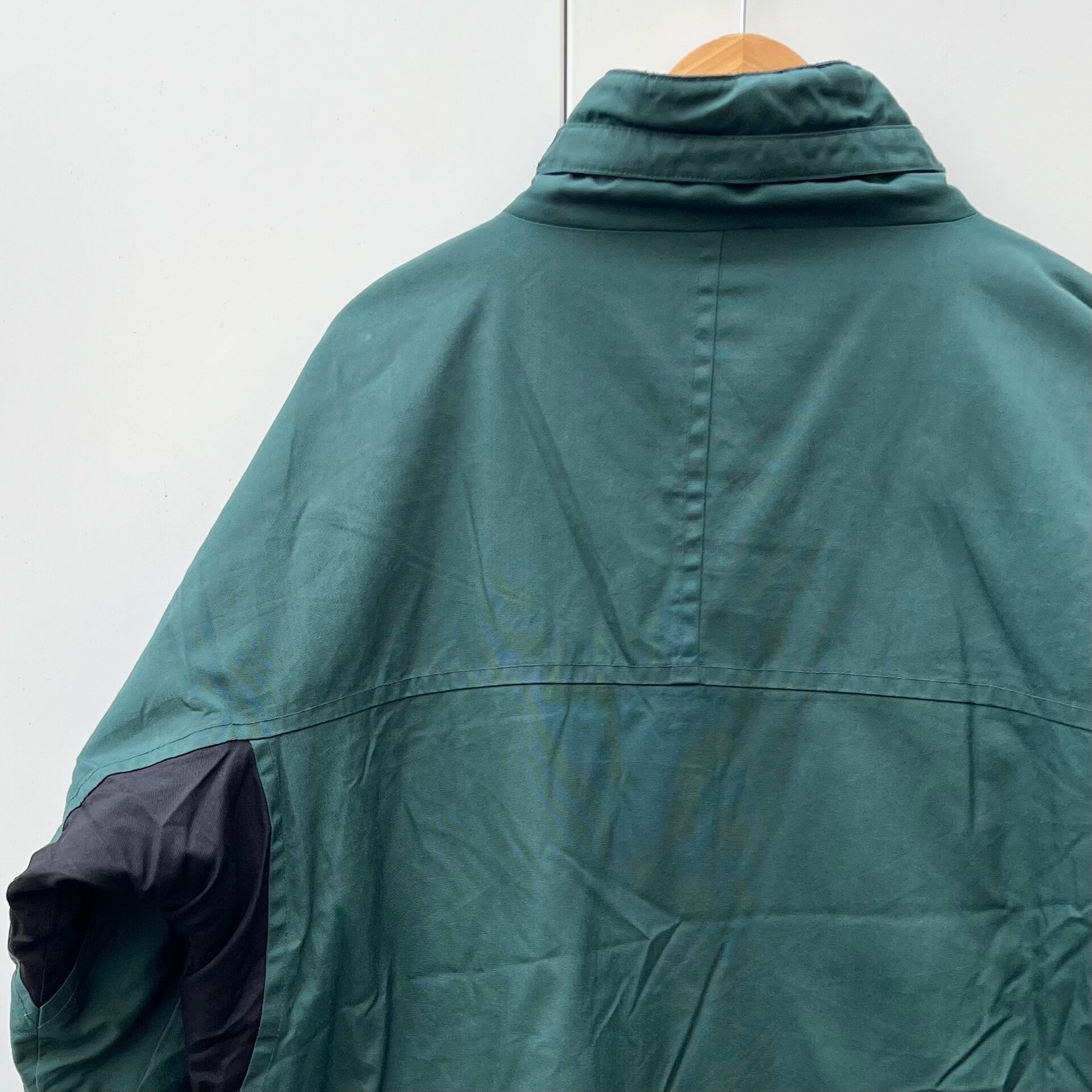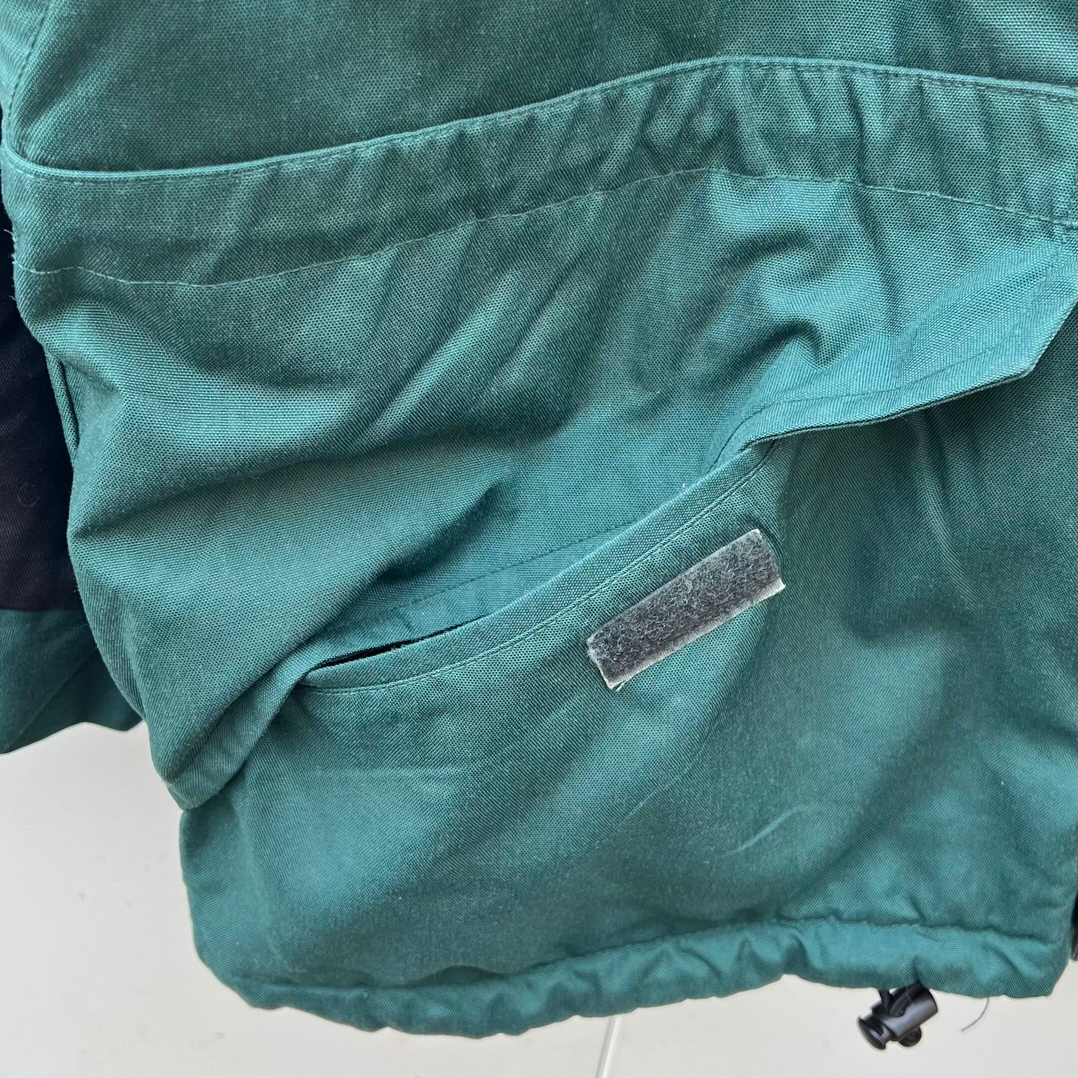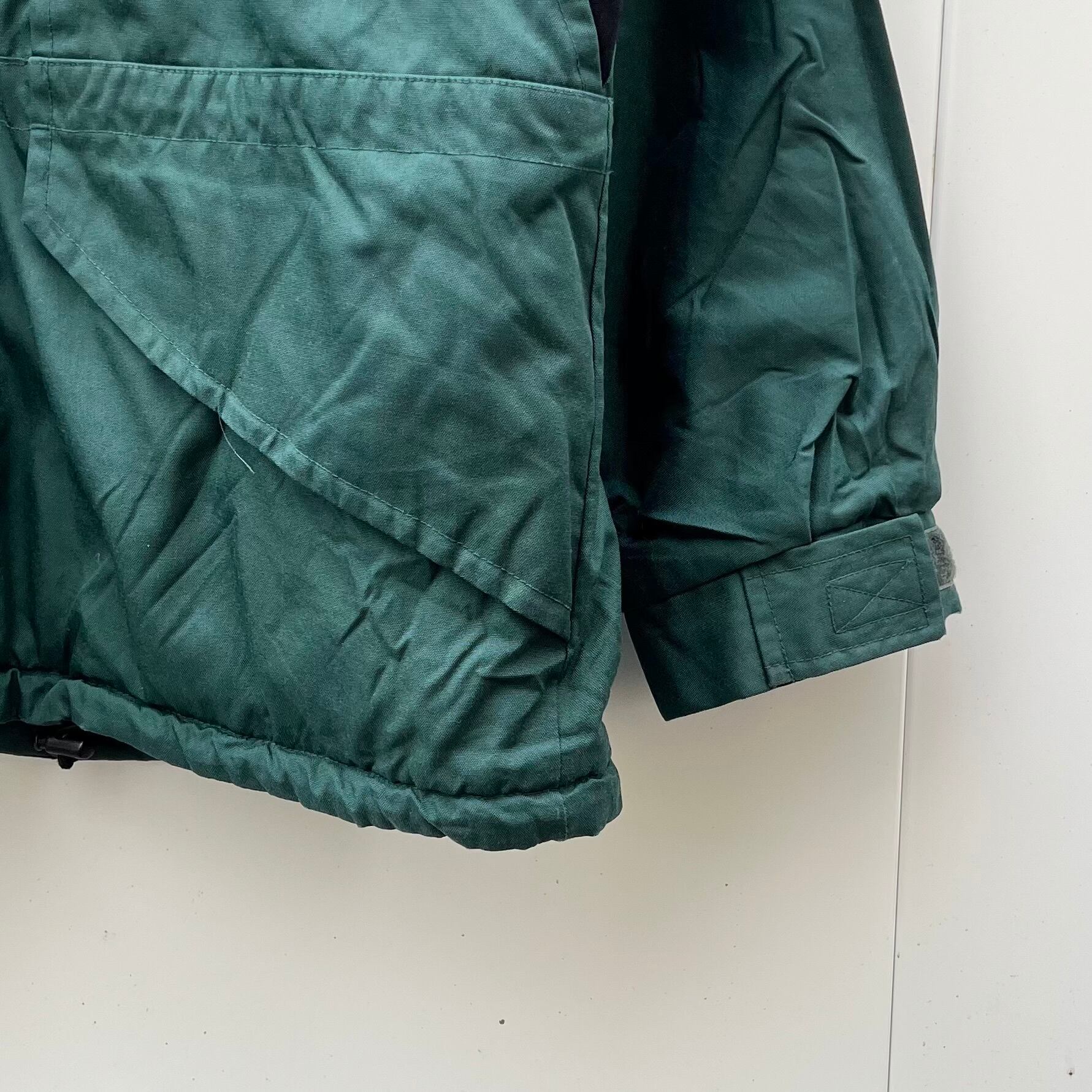 グリーンxブラックのナイロン素材、左胸にロゴマーク刺繍、右袖にロゴとロゴマーク刺繍、両胸にジッパー付きポケット、両サイドにベロクロ付きハンドウォームポケット、裾にドローコードが入るデザインです。