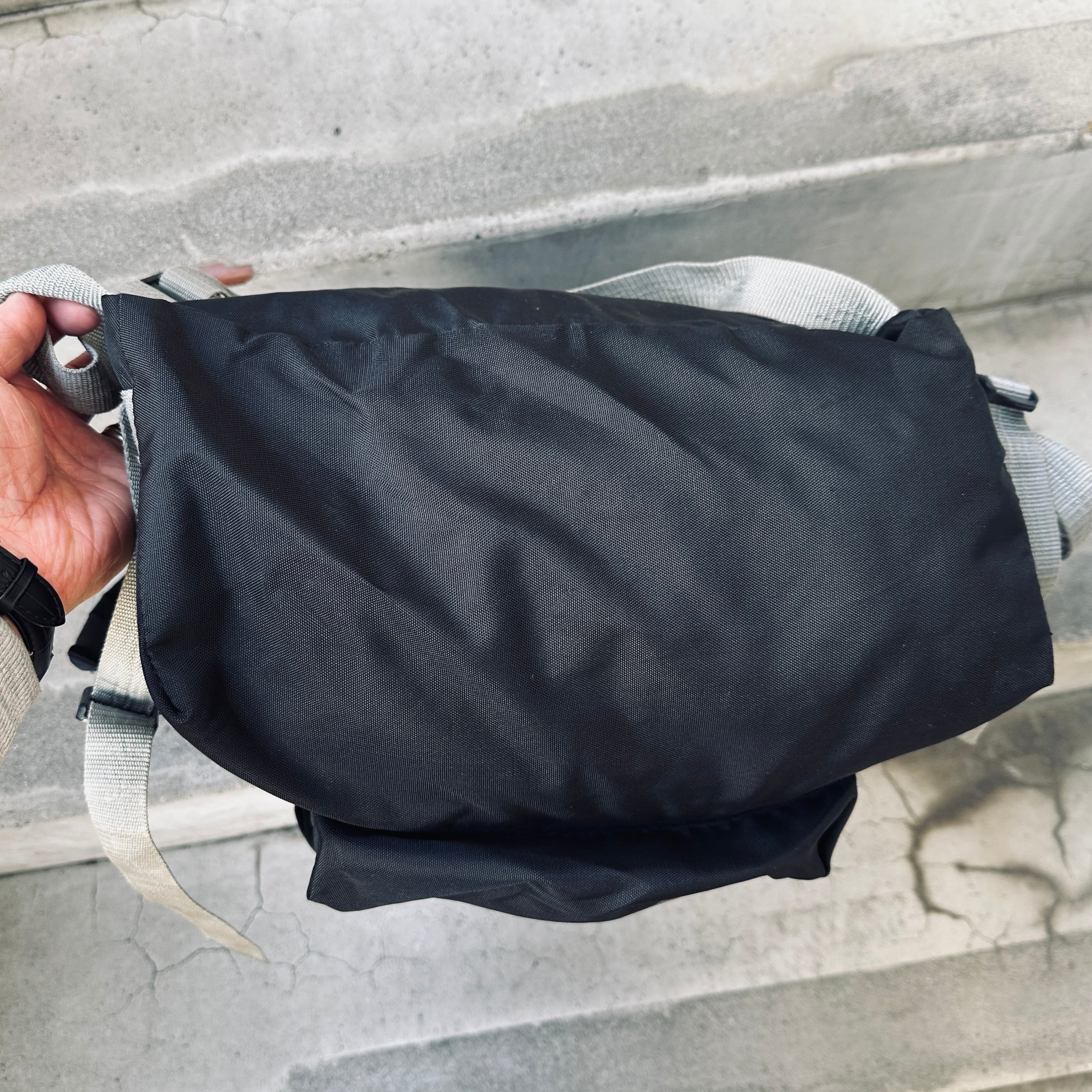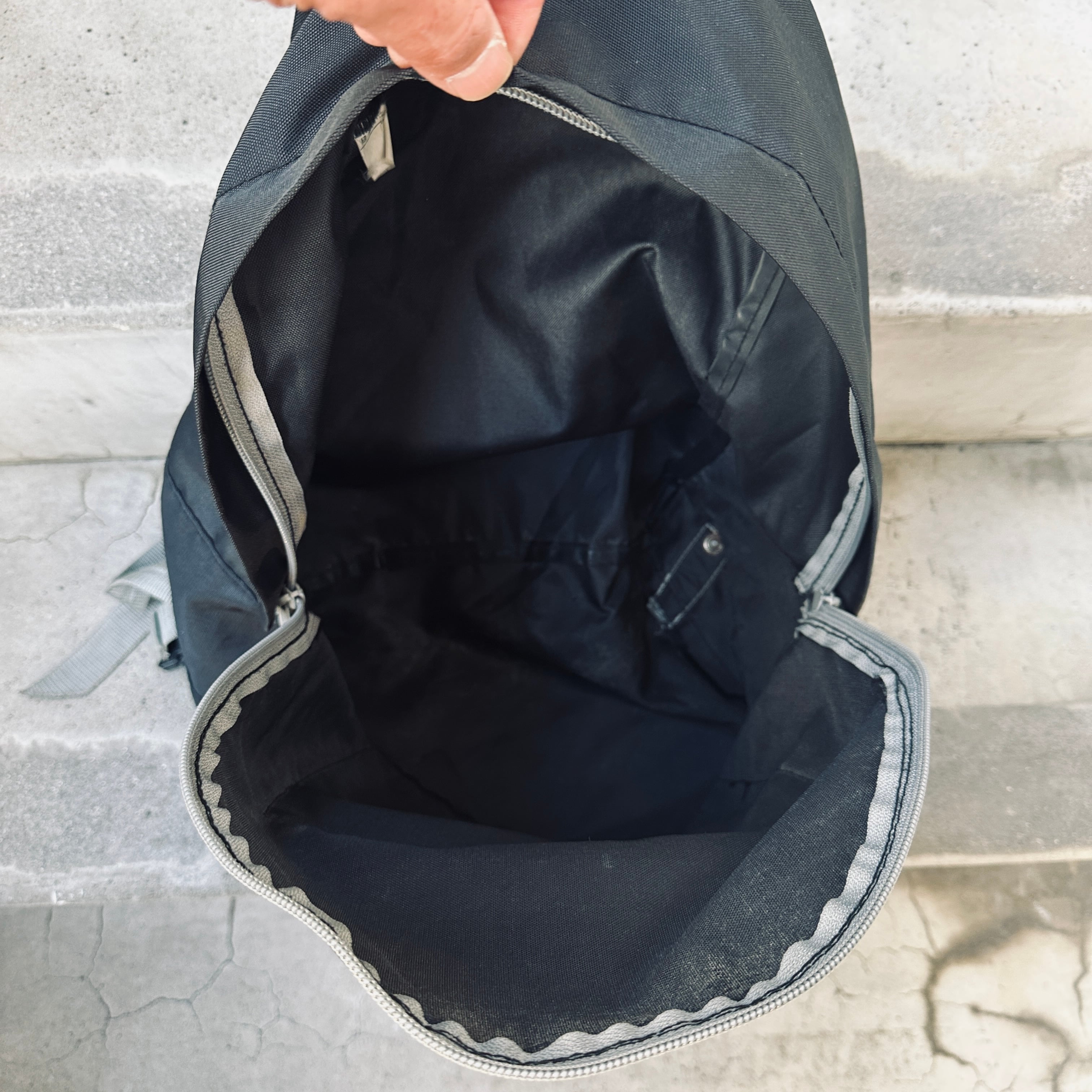 ブラックxグレーのナイロン系素材、フロントのサブポケットにロゴプリントが入るシンプルデザインです。