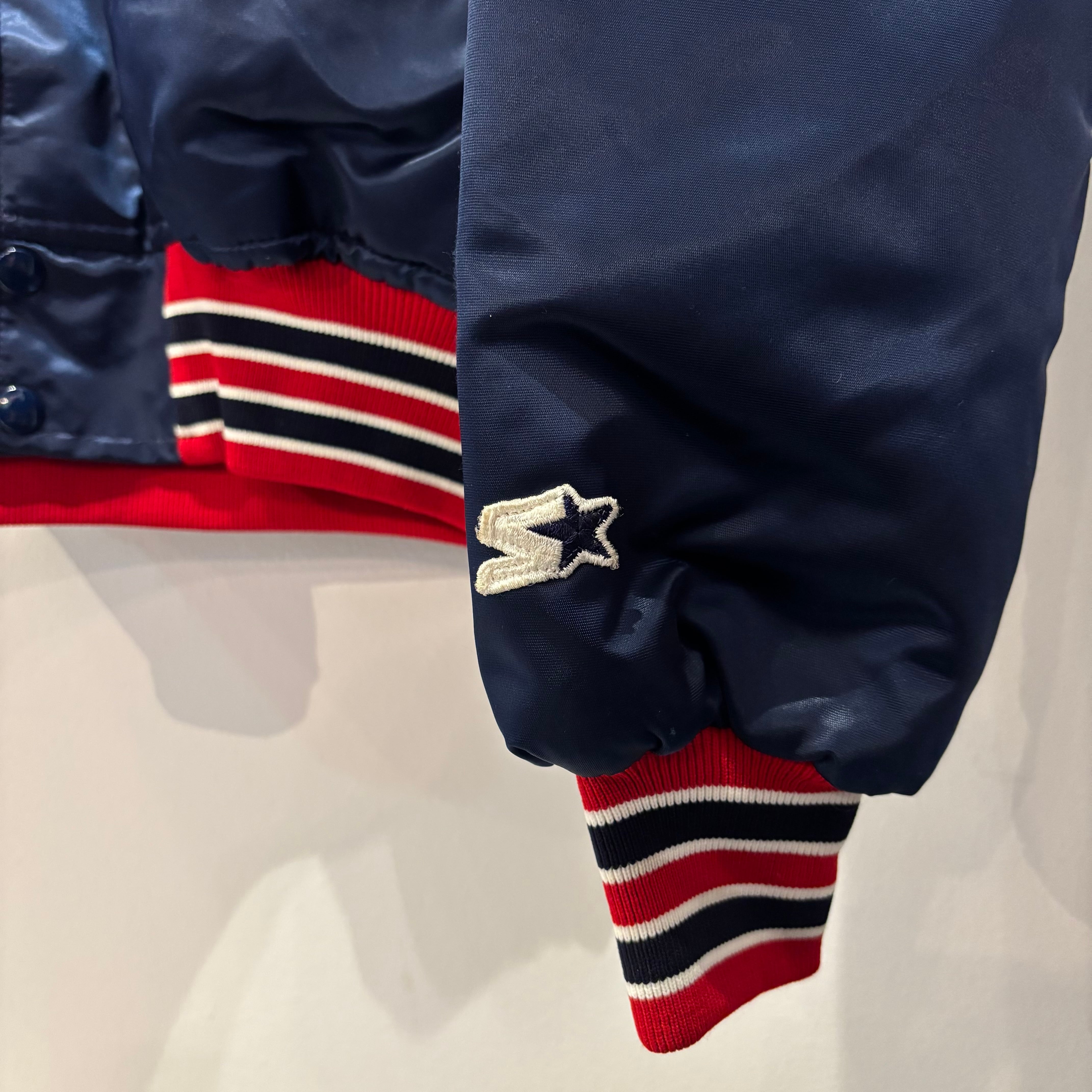 ネイビーのナイロンサテンxレッド/ブラック/ホワイトライン、左胸ソックスロゴマークワッペン、左袖にSTARTERロゴマークワッペンの付いたスタンダードデザインです。