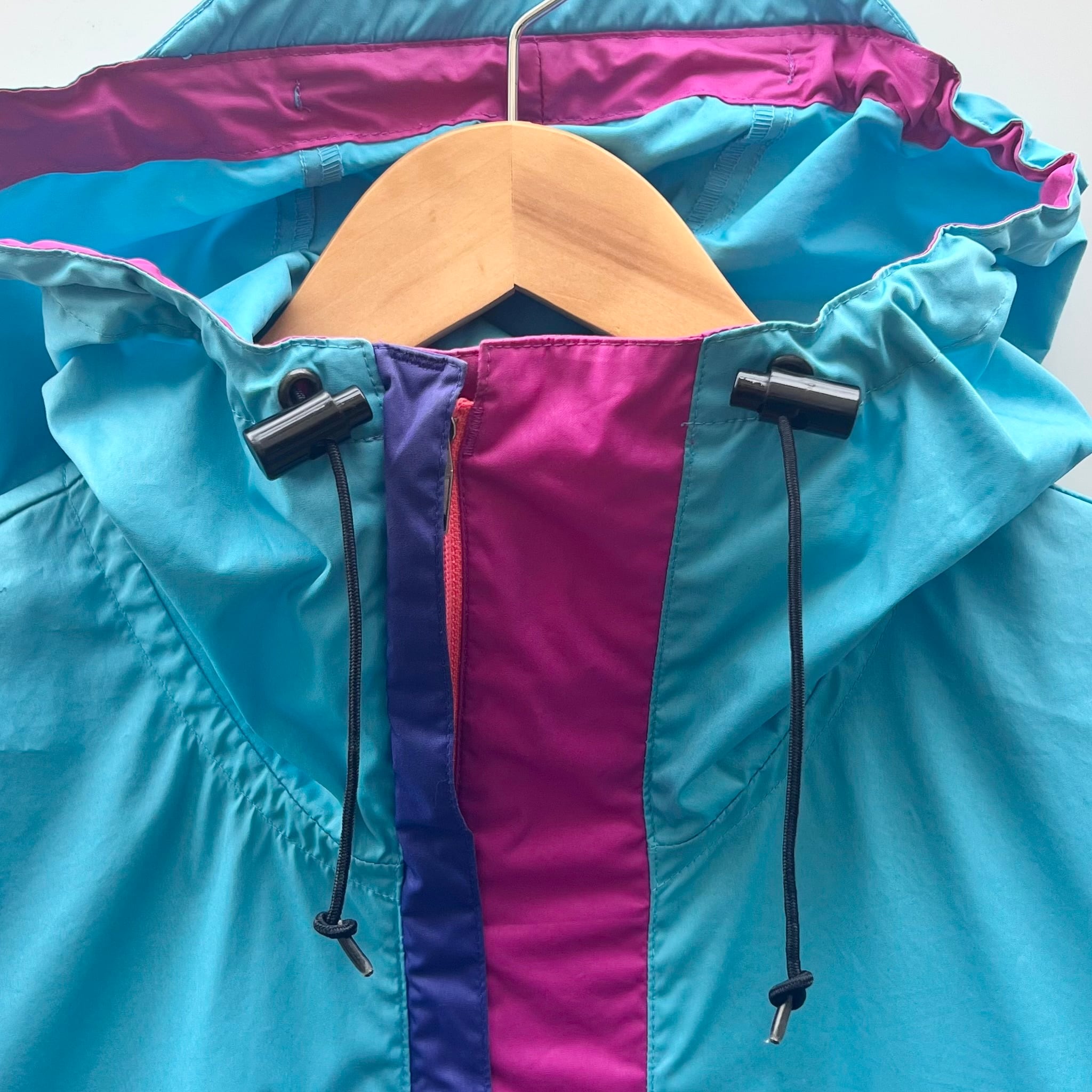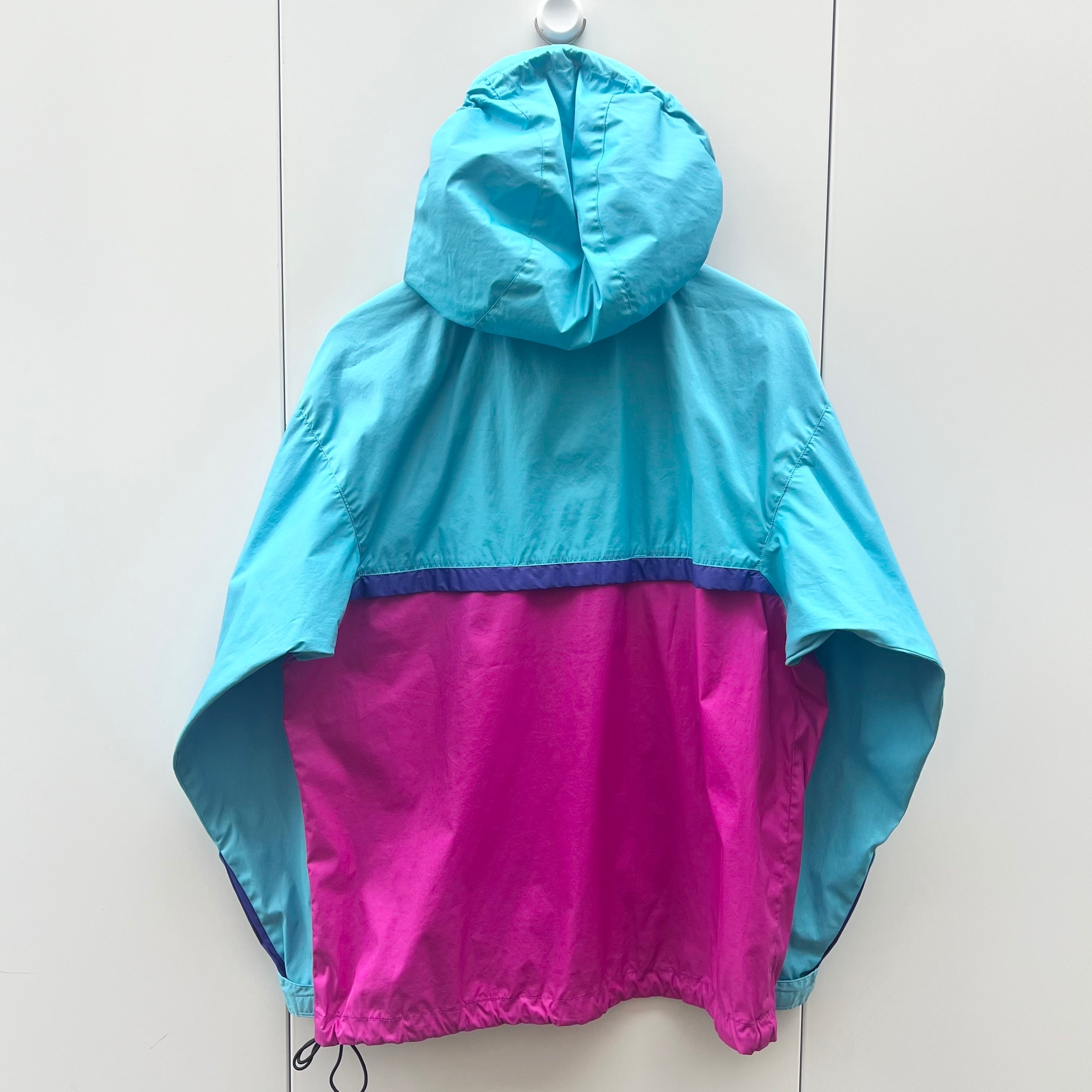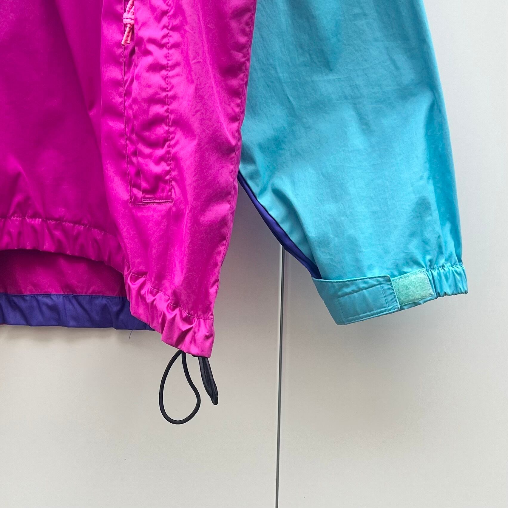 ターコイズブルーxダークピンクxパープルのポリエステル素材、左胸にロゴマーク刺繍、その下にジッパー付きポケット、ジッパー付きハンドウォームポケット、フードと裾にドローコードが入るデザインです。