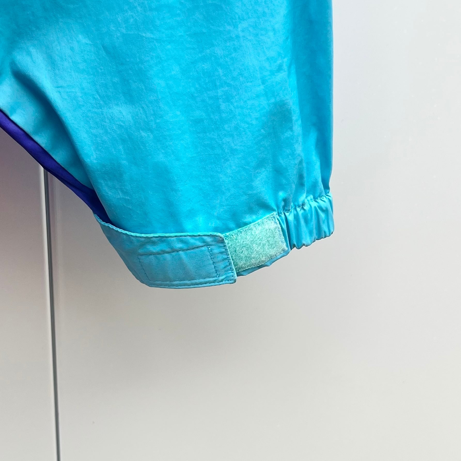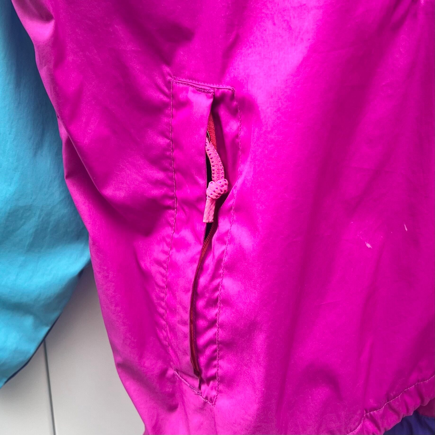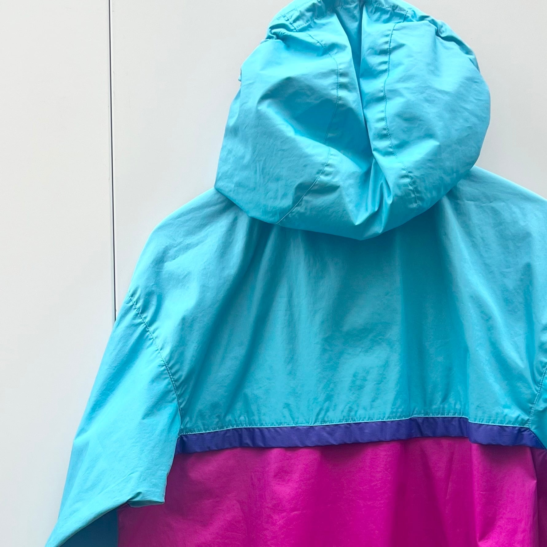 ターコイズブルーxダークピンクxパープルのポリエステル素材、左胸にロゴマーク刺繍、その下にジッパー付きポケット、ジッパー付きハンドウォームポケット、フードと裾にドローコードが入るデザインです。