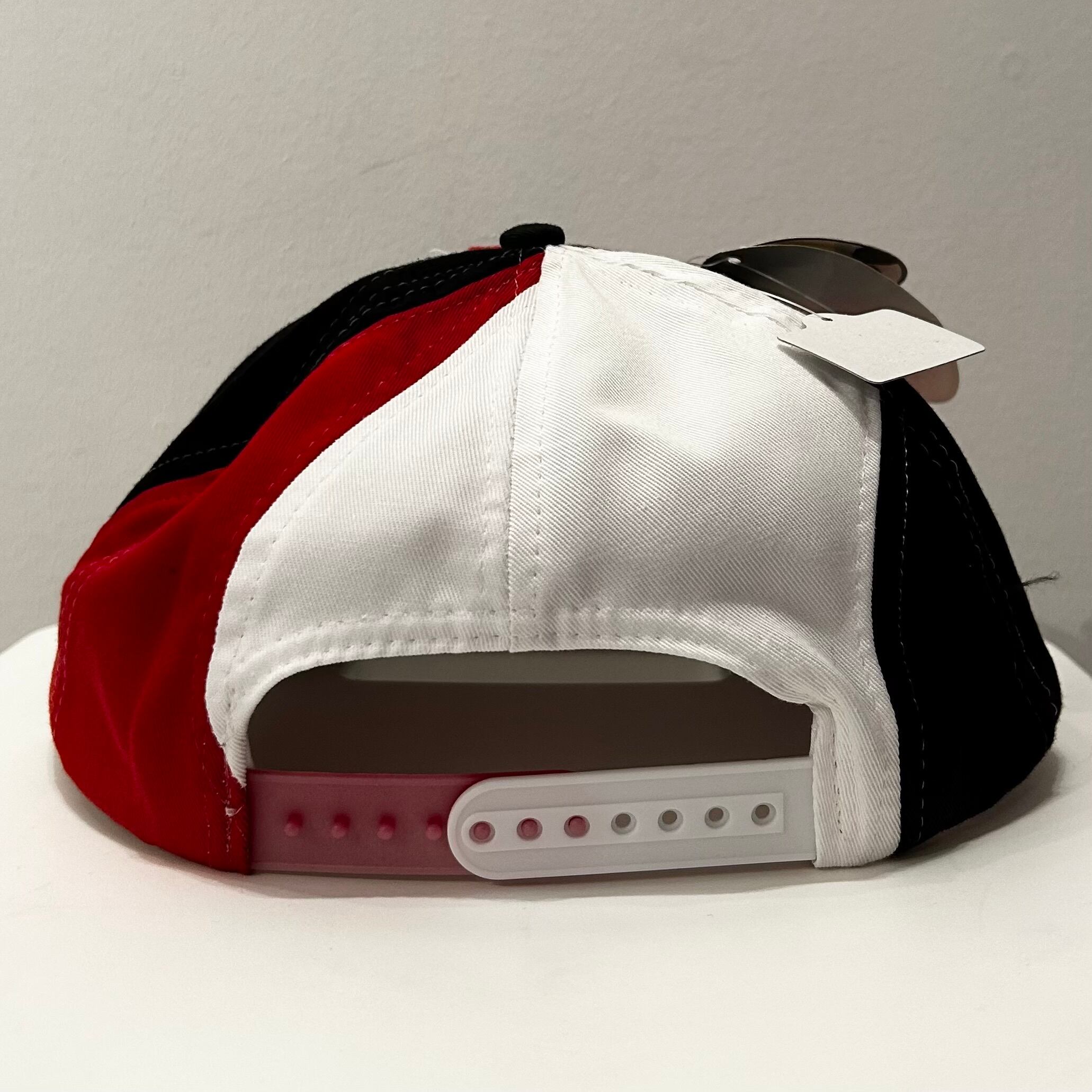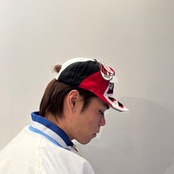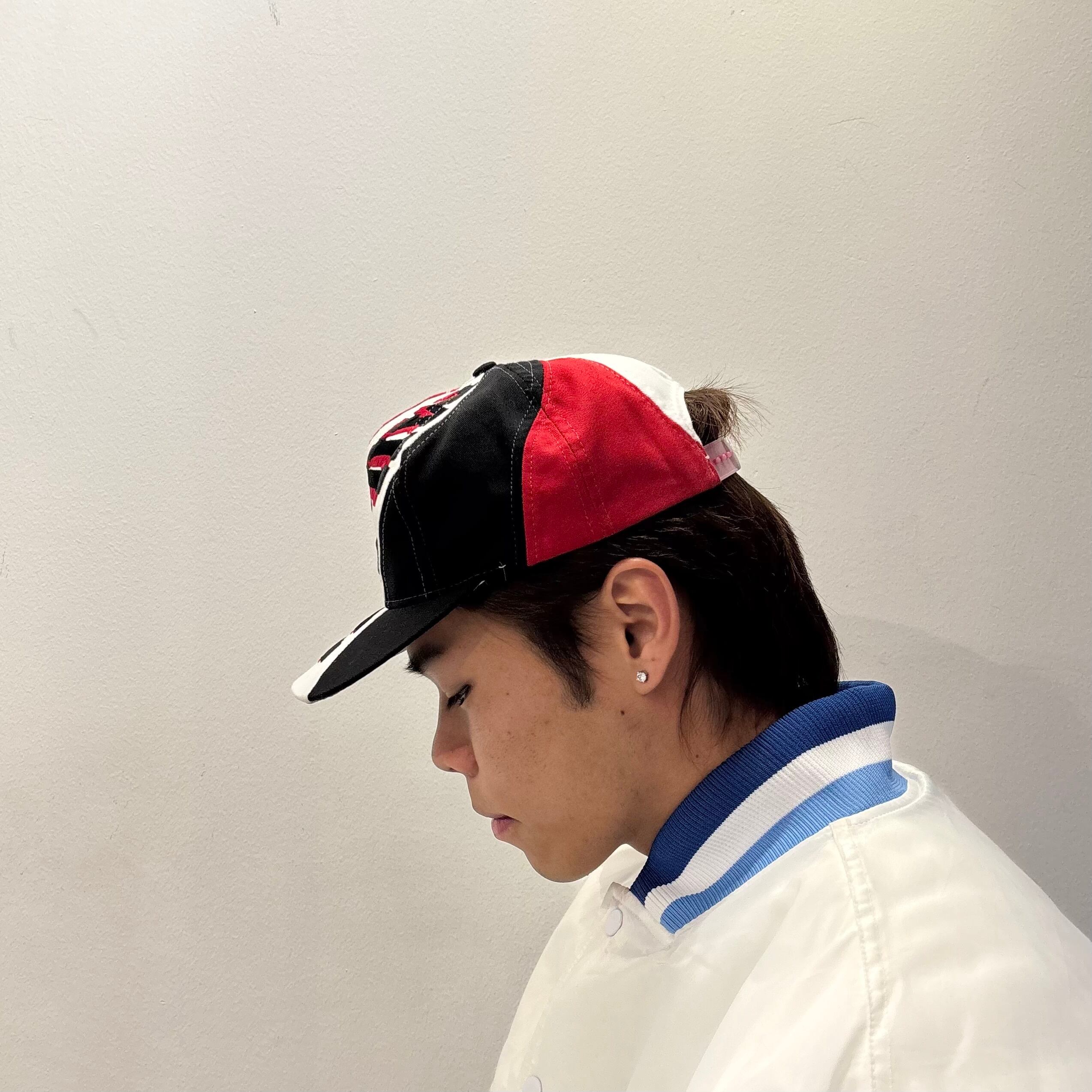 ホワイトxレッドxブラックのポリエステル混系素材、フロントロゴマーク、フロントパネルからツバにかけてMILAN刺繍、スナップバックアジャスターを使用いしたデザインです。