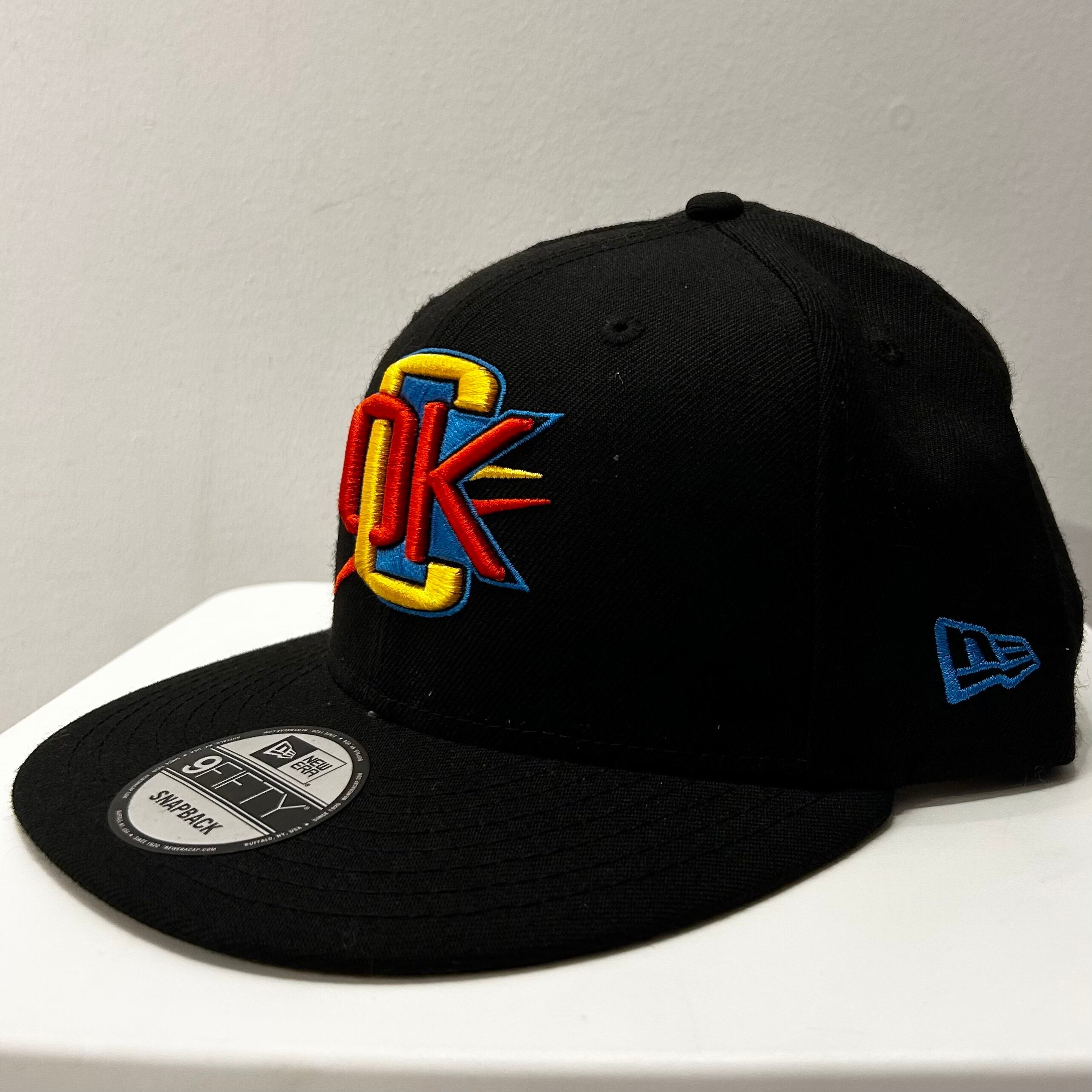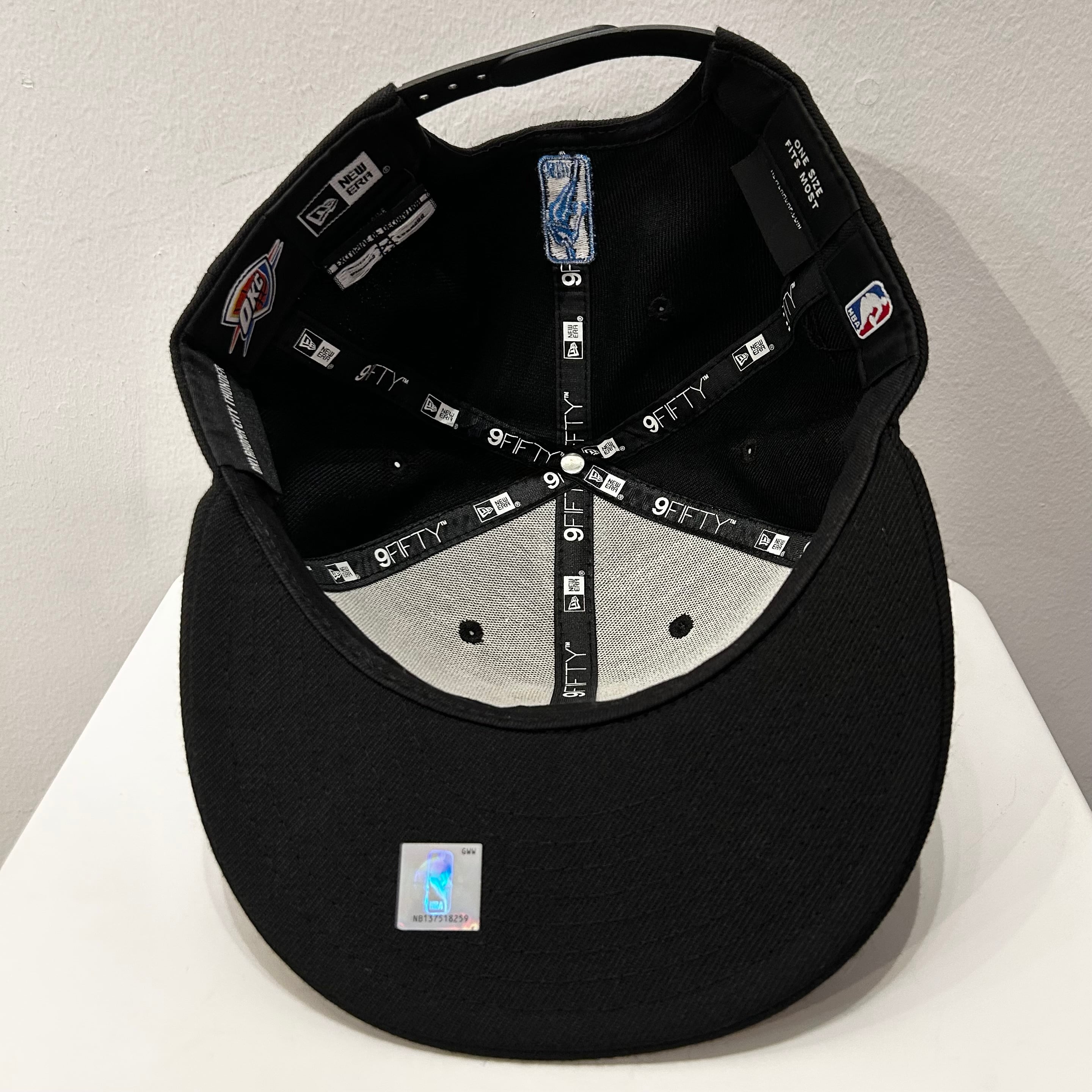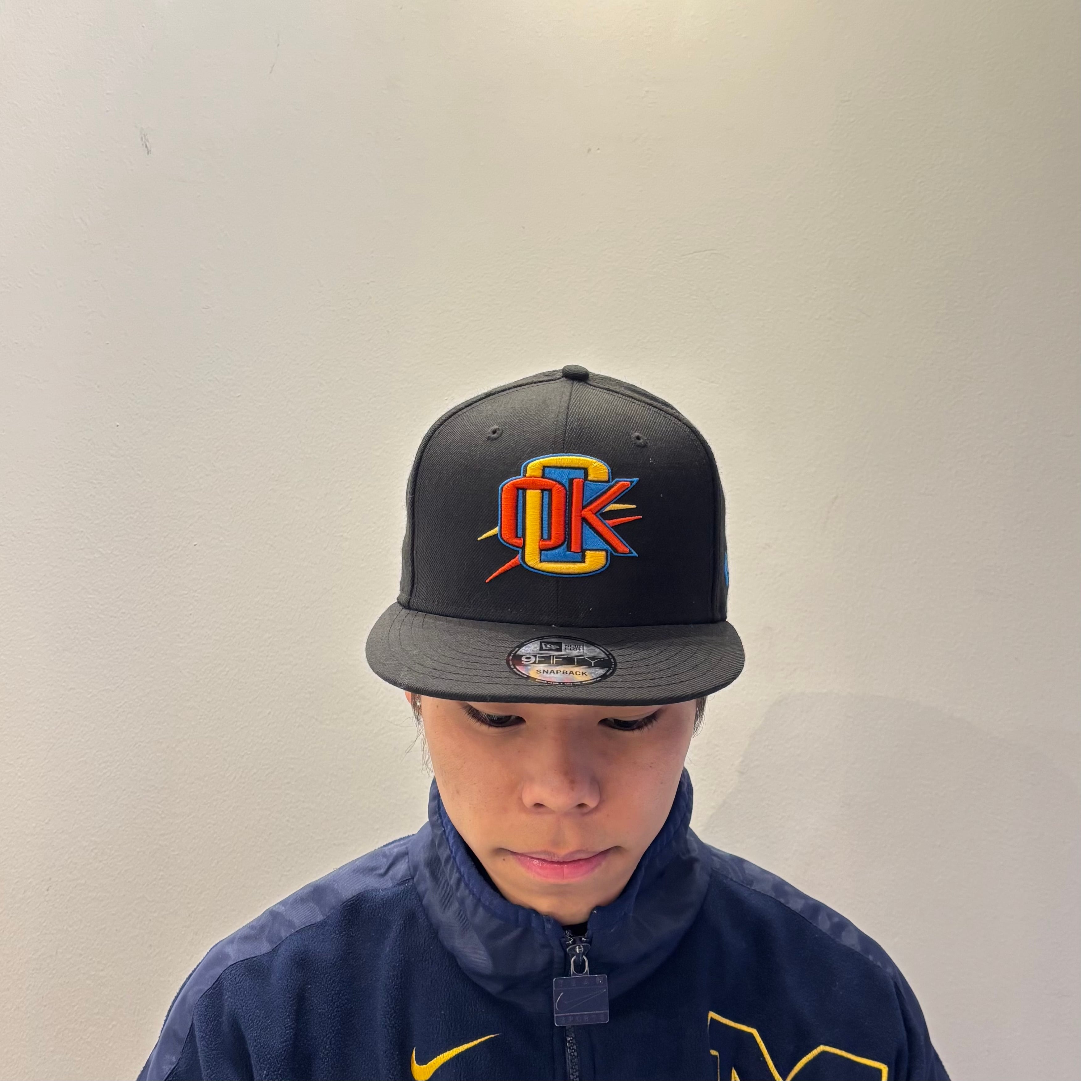 ブラックのウール素材、フロントにOKCロゴ刺繍、左サイドにNEWERAロゴマーク刺繍、バックにNBAロゴマーク刺繍、スナップバックアジャスターを使用したデザインです。