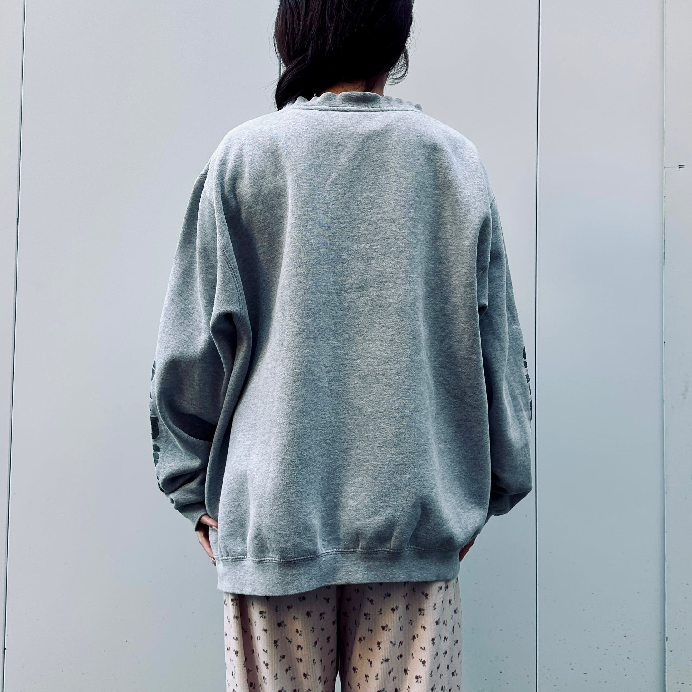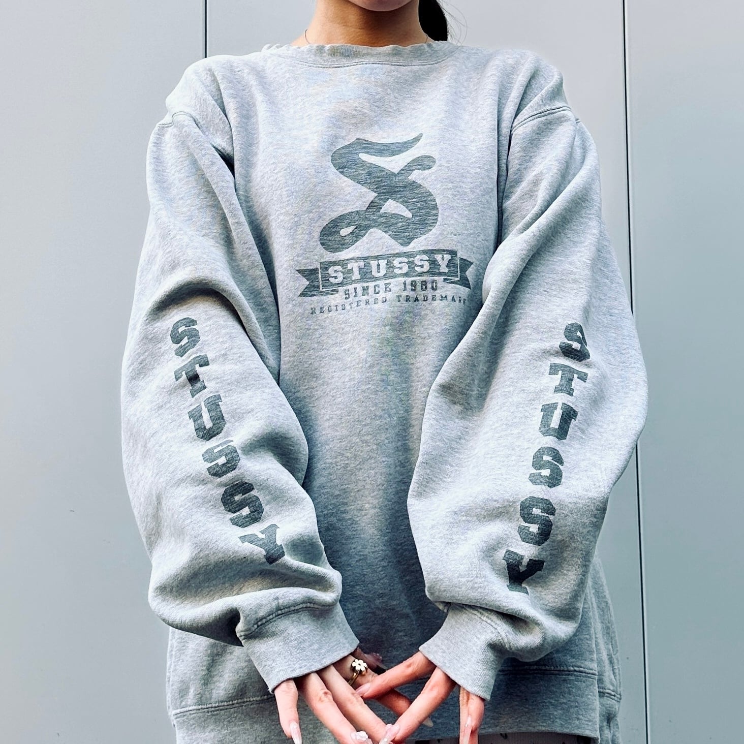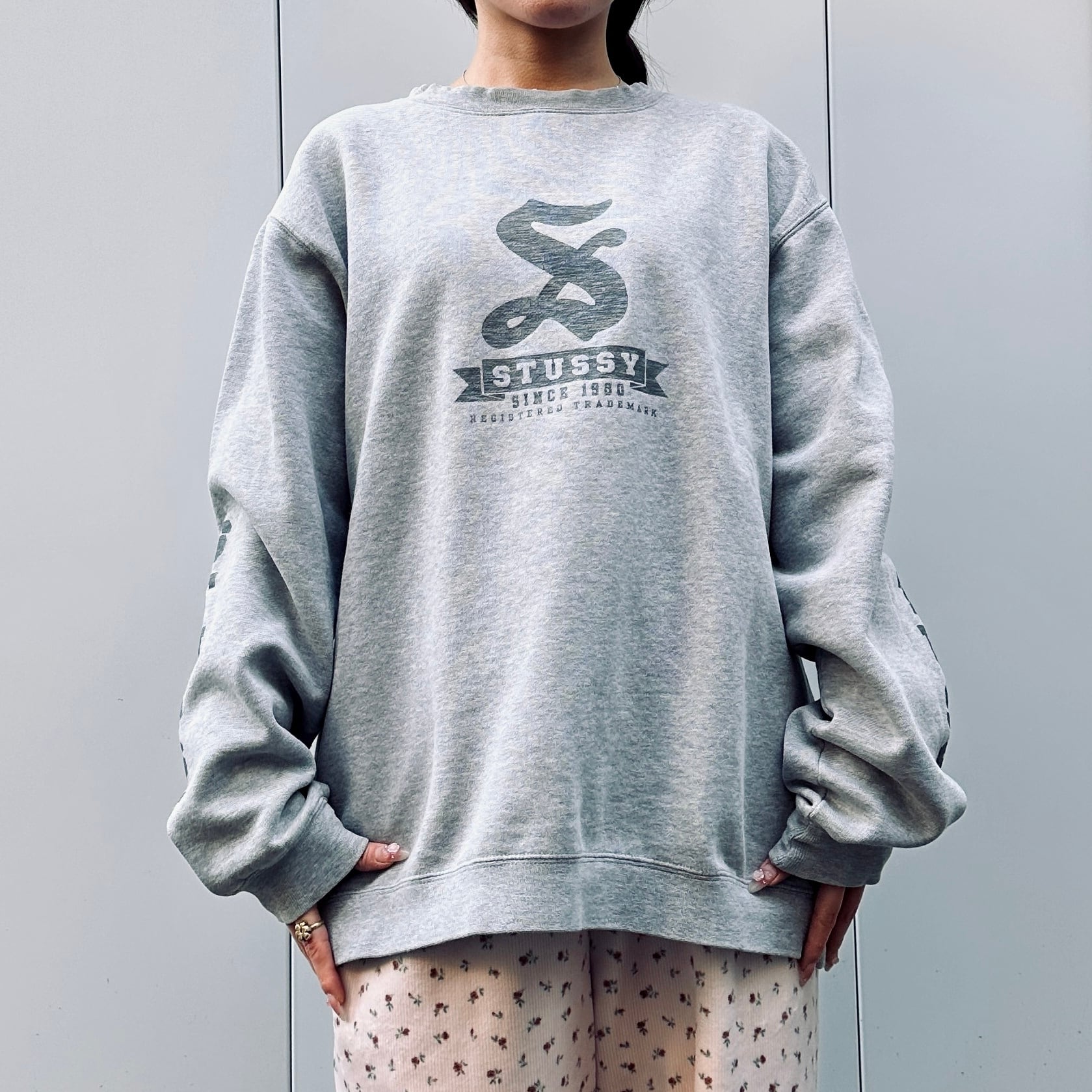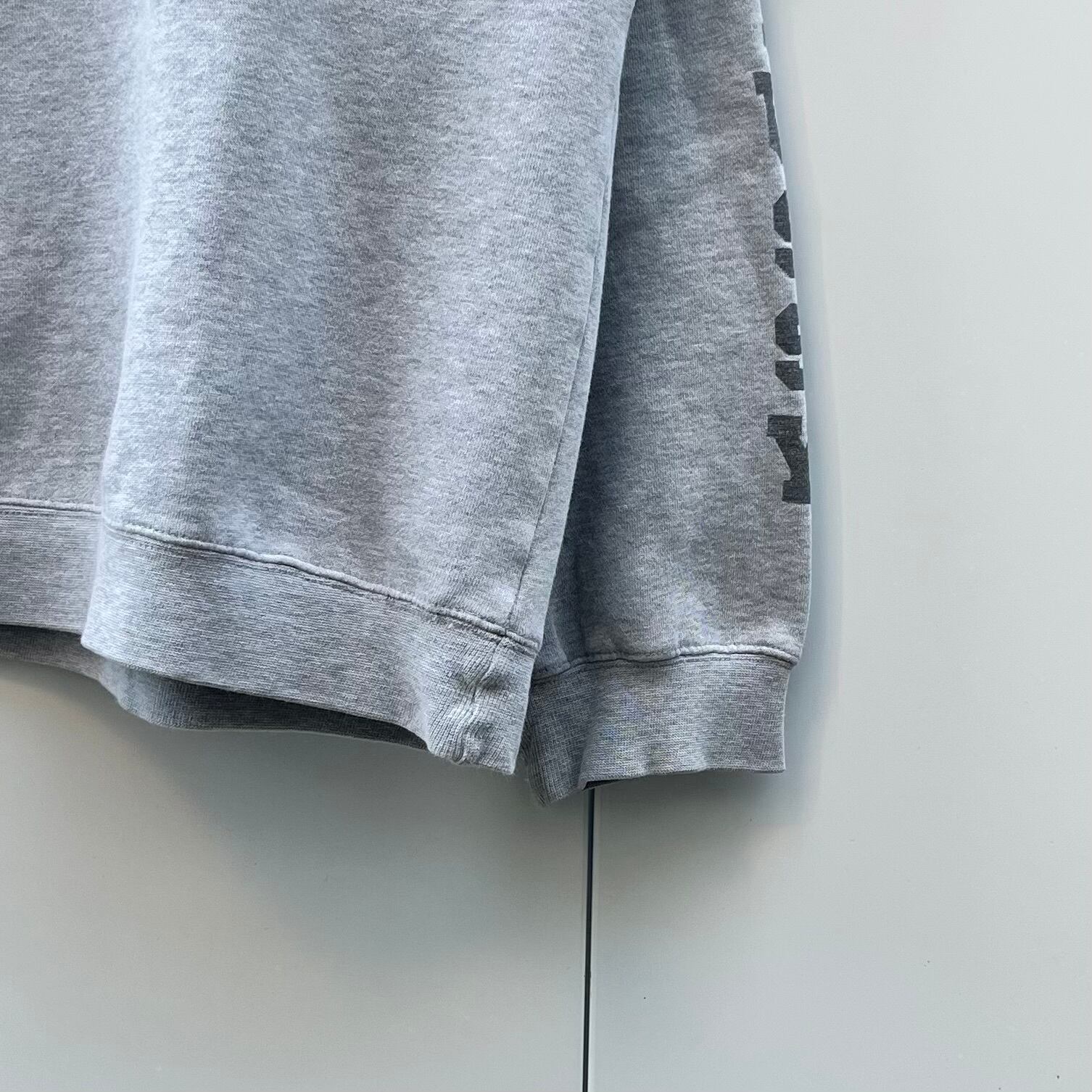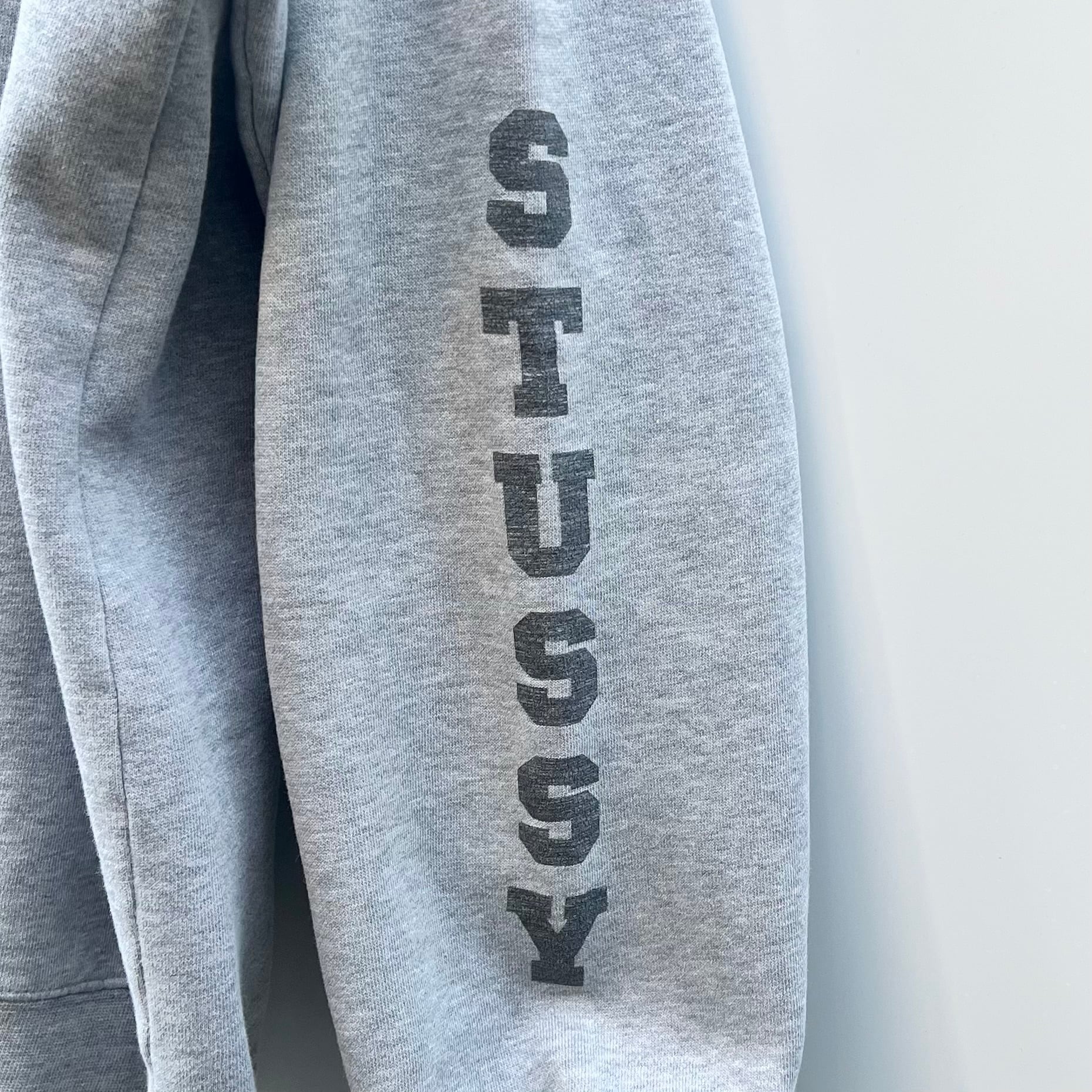 グレーの裏起毛素材、フロントにロゴプリント、両袖にSTUSSYプリントが入るデザインです。