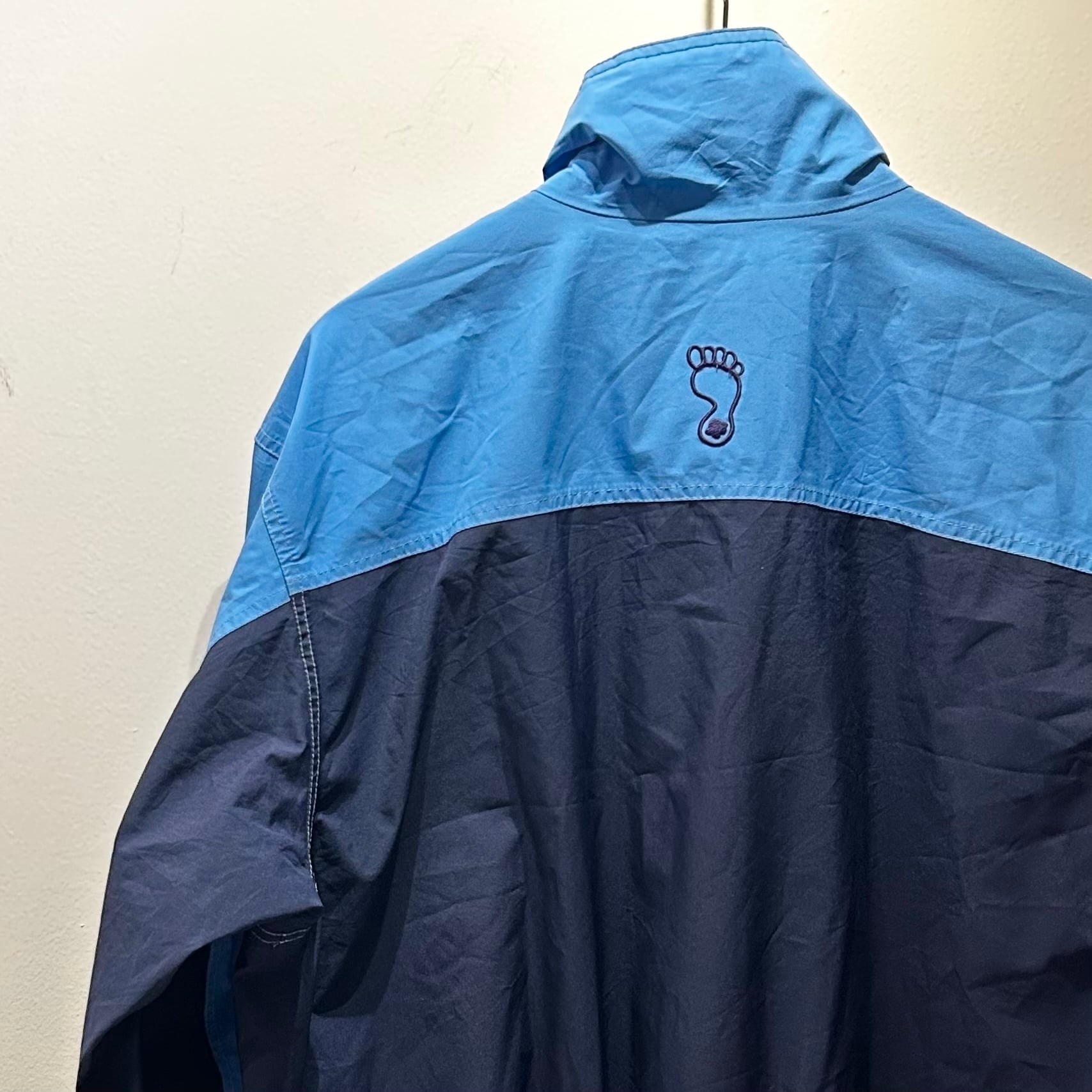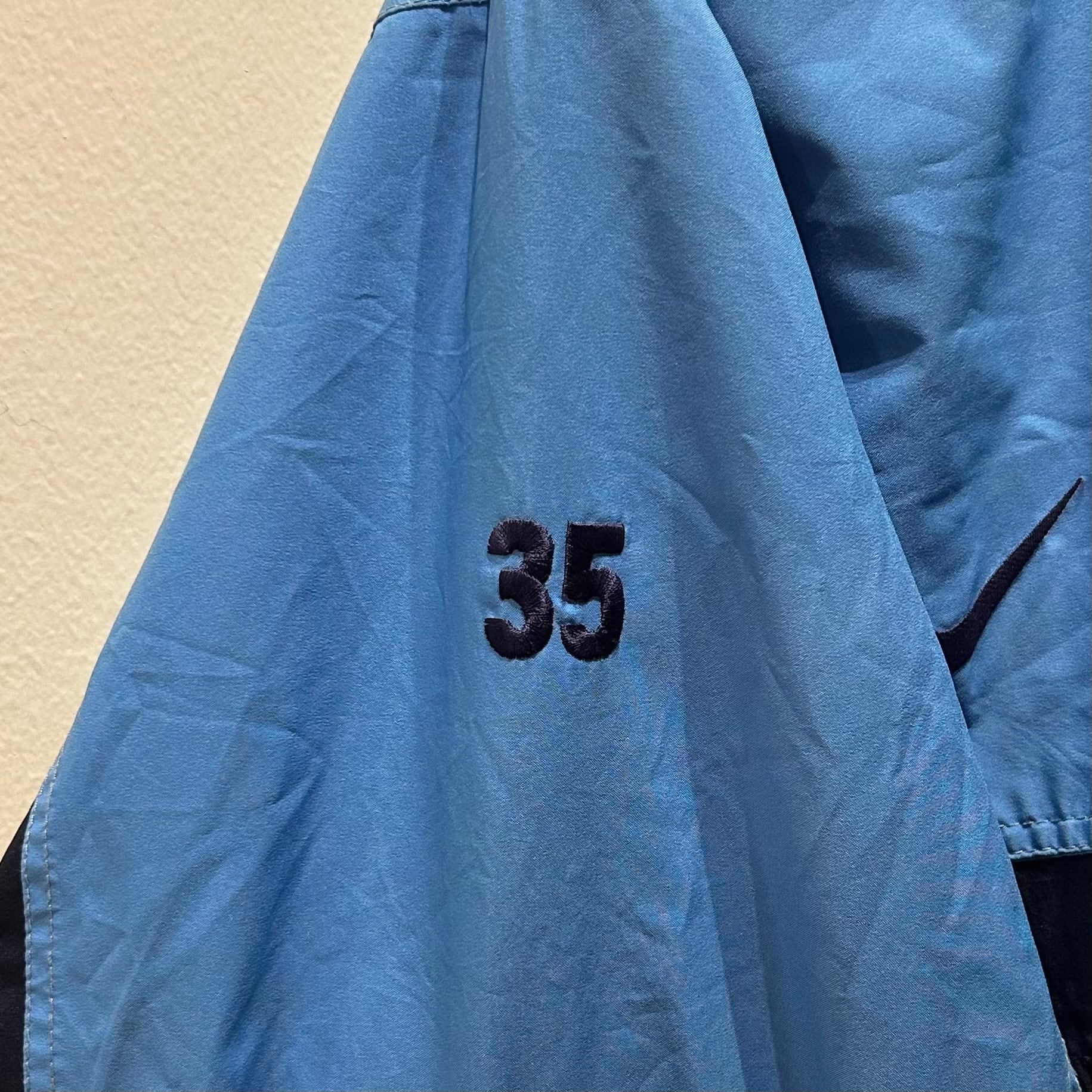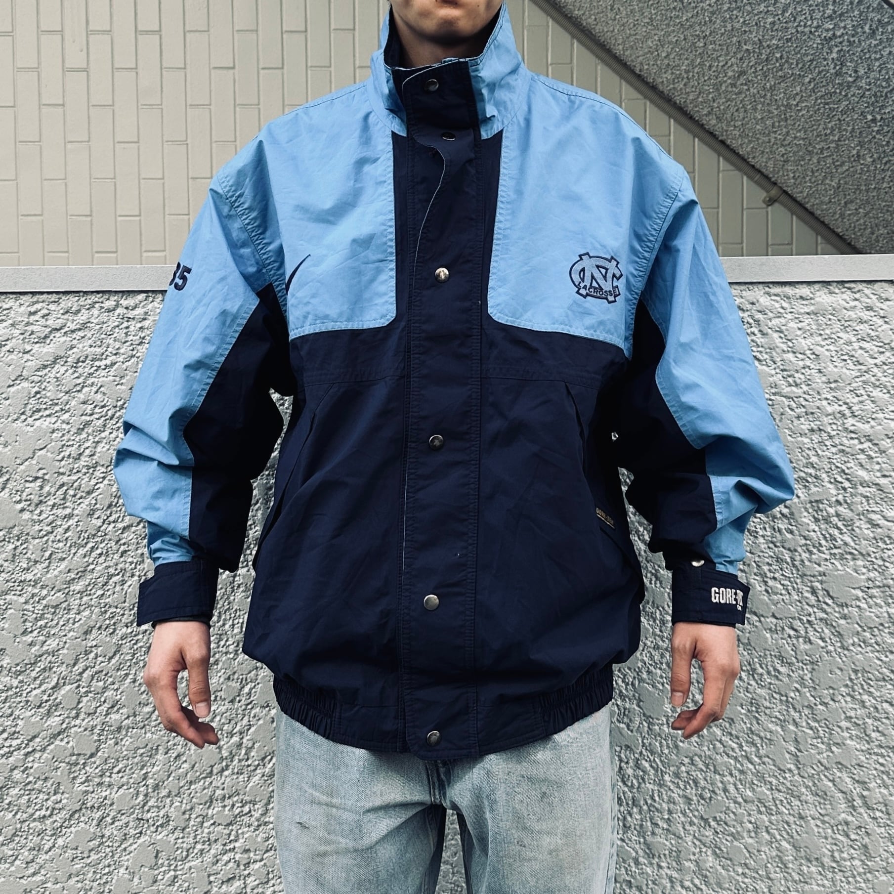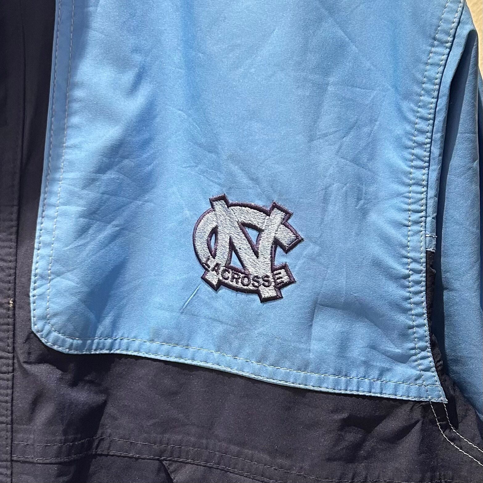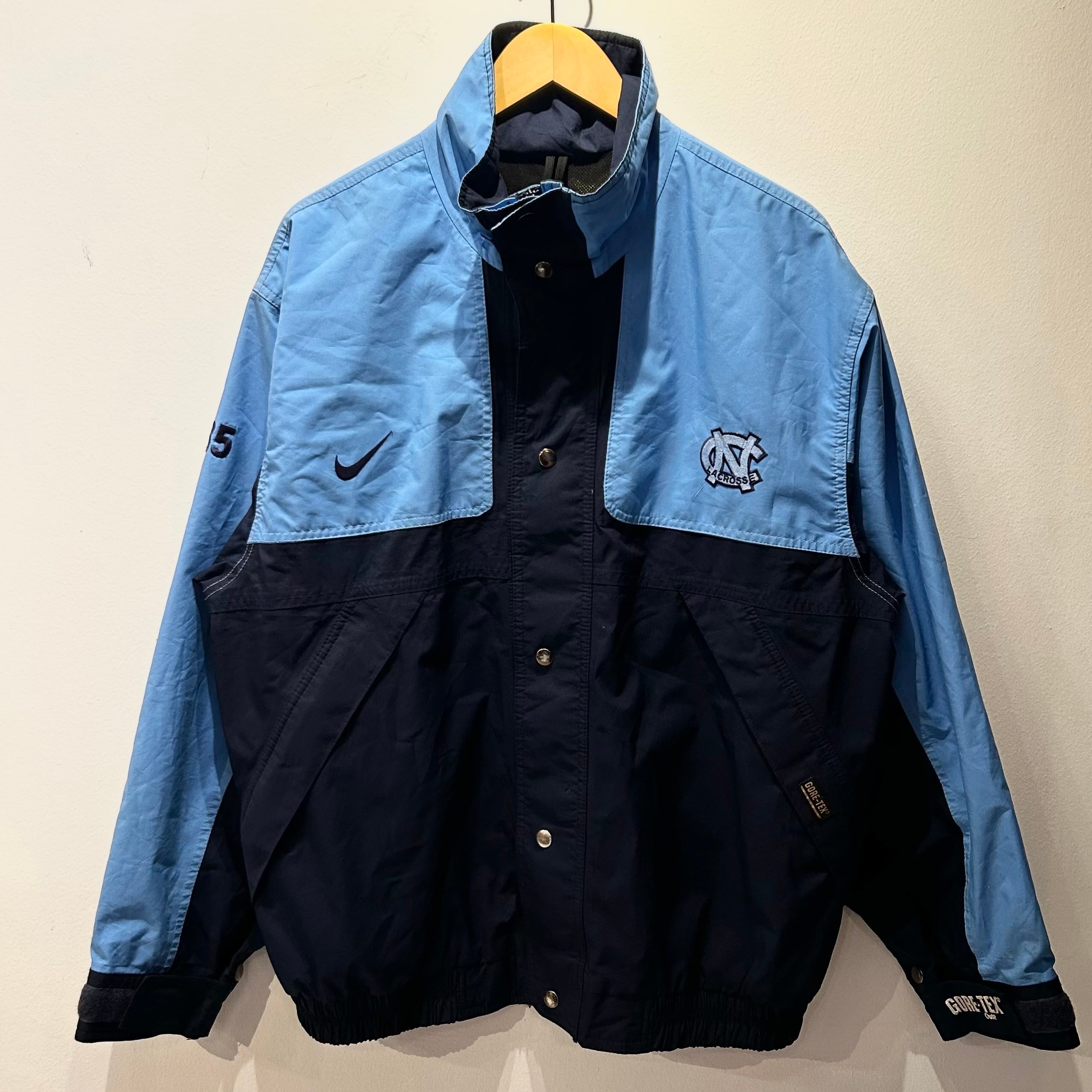 ネイビーxサックスブルーのゴアテックス素材、左胸にUNC LACROSSE刺繍、右胸にスウォシュ?刺繍、右袖に35刺繍、左袖先のベロクロにGORE-TEX刺繍、スナップボタンとジッパーで開閉、バック襟元にTERHEELSロゴマーク刺繍、フジッパー付きハンドウォームポケットが付くデザインです。