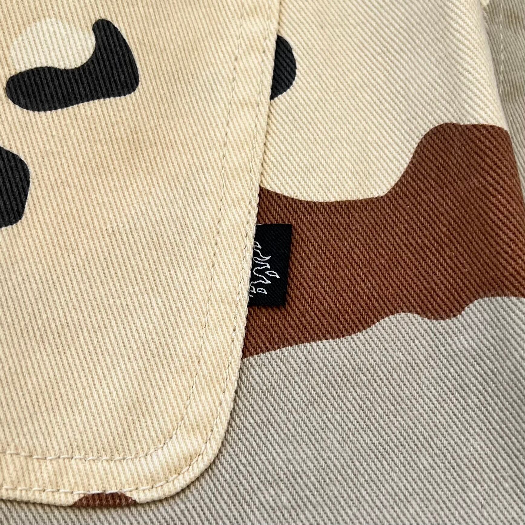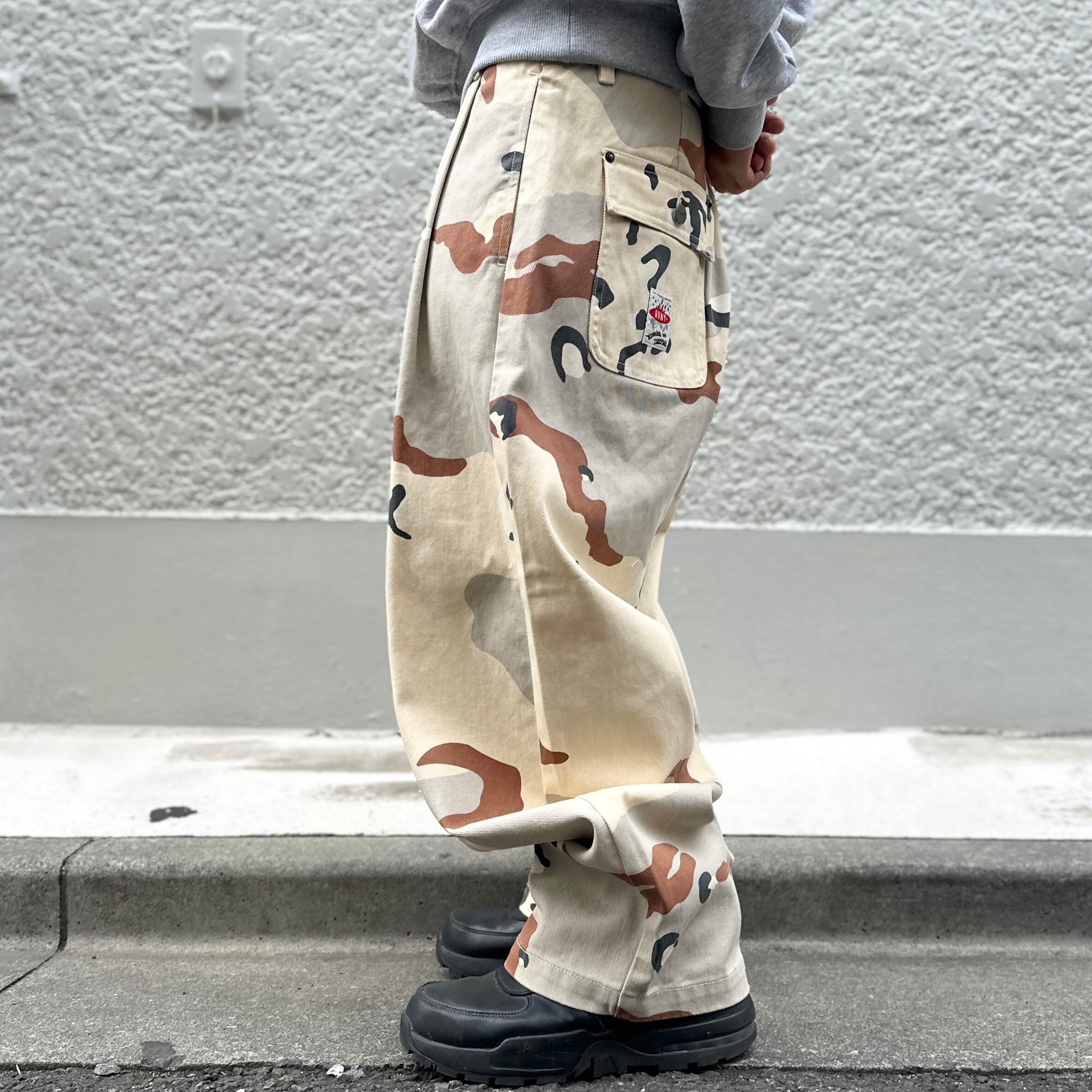 ロゴ入りチョコチップカモフラージュのコットン素材、左バックポケットにネーム、深めのタック、左バックポケットにネームが付いたデザインです。