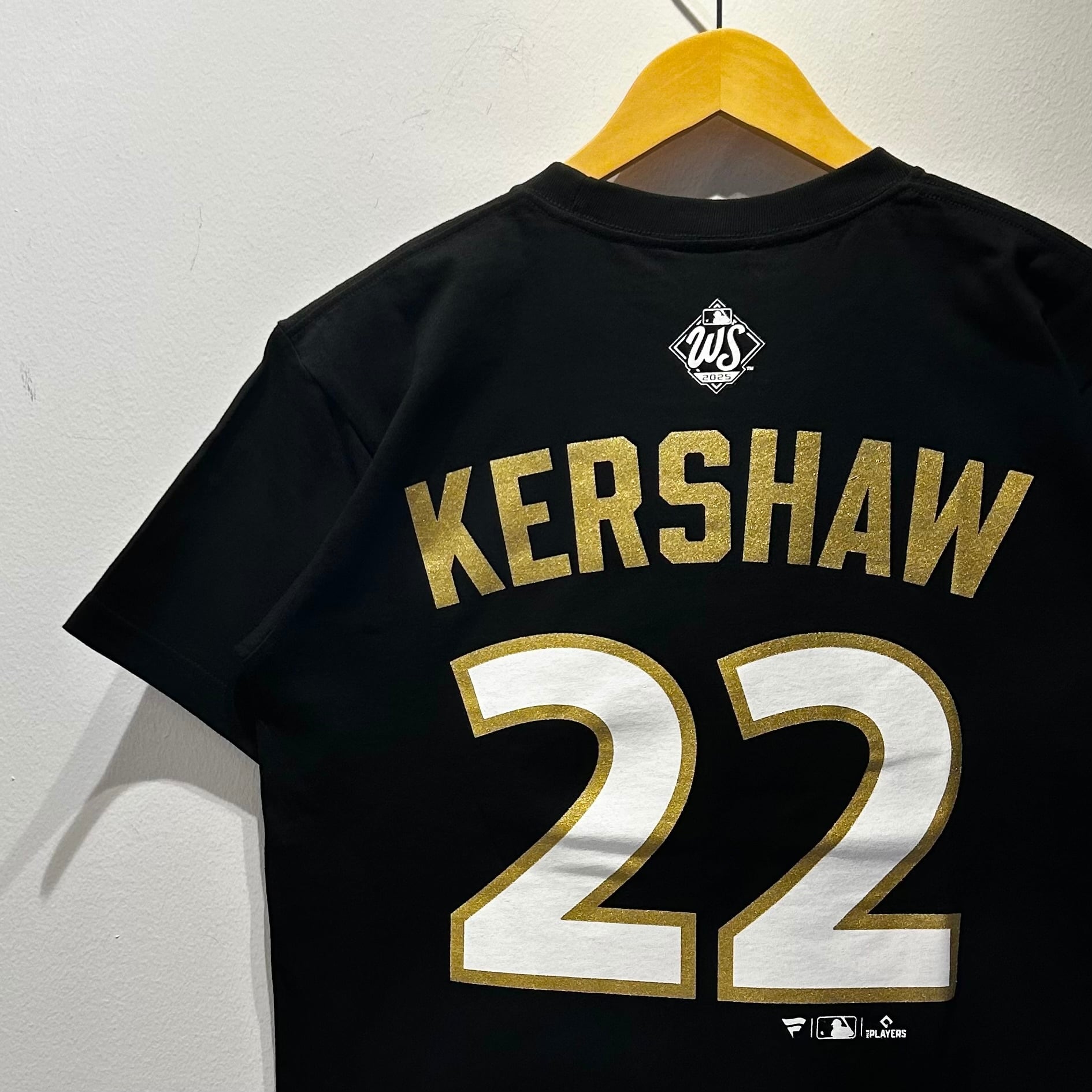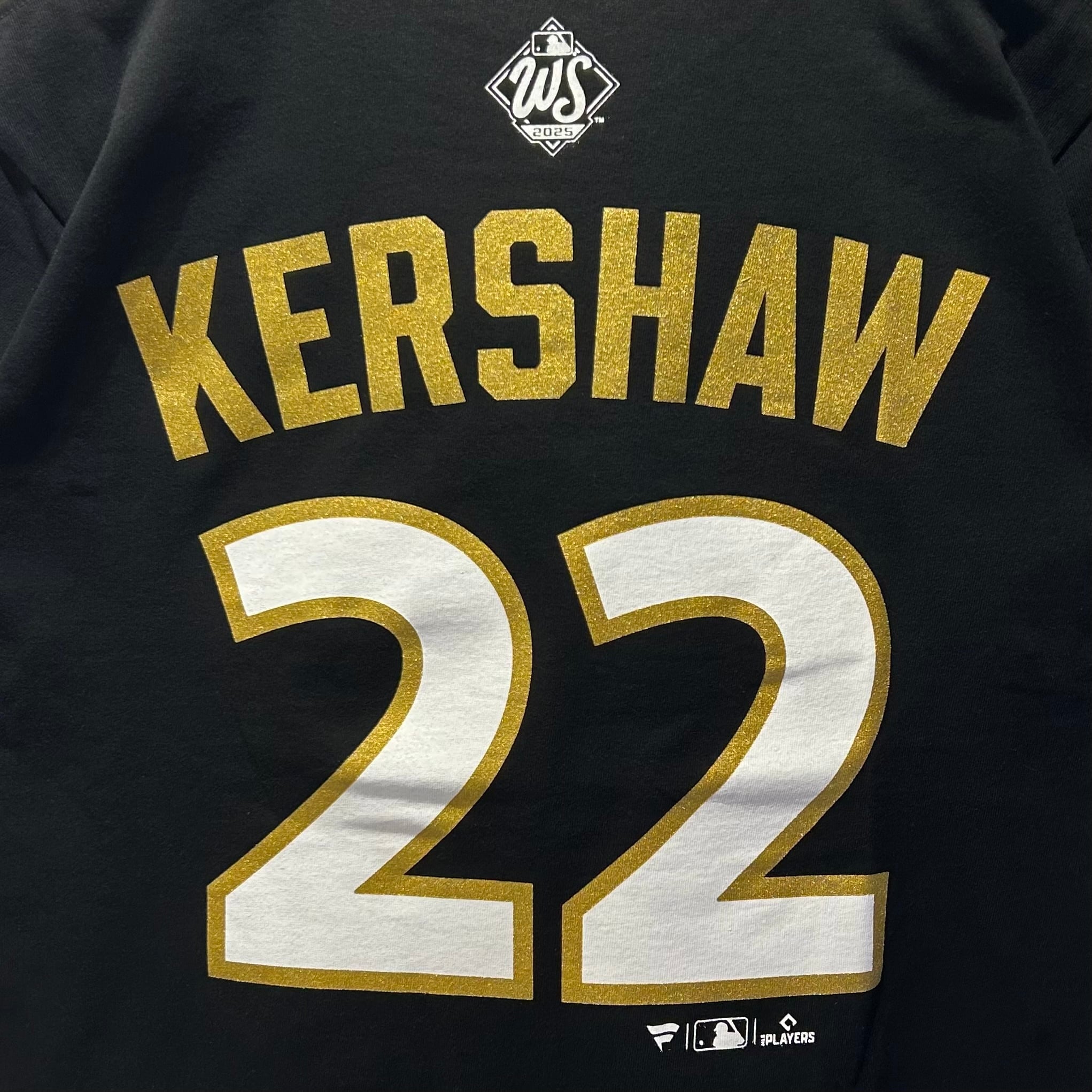 ブラックのコットン素材、フロントに2025World Series Champions LAプリント、バックに大きくKERSHAW22プリントの入るデザインです。