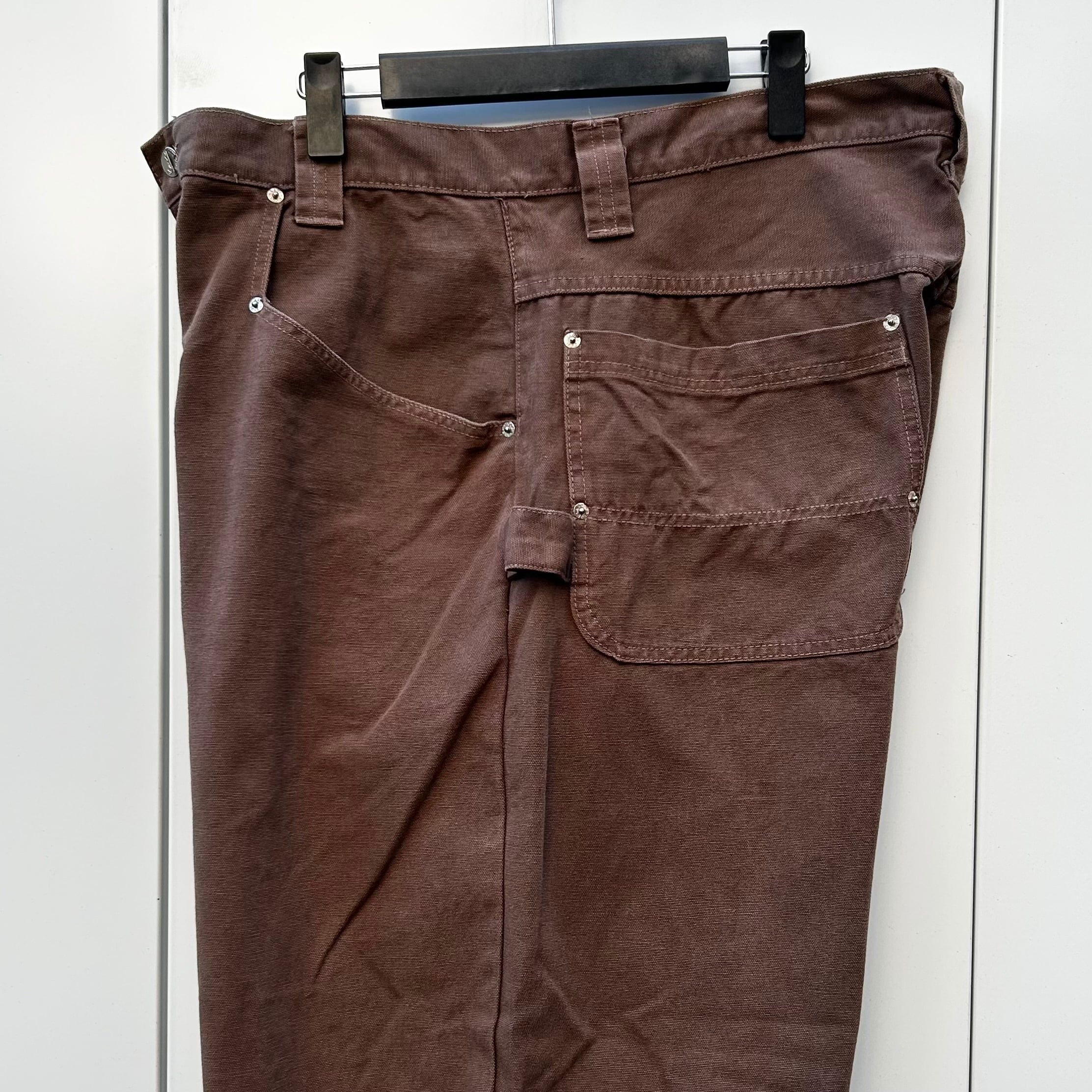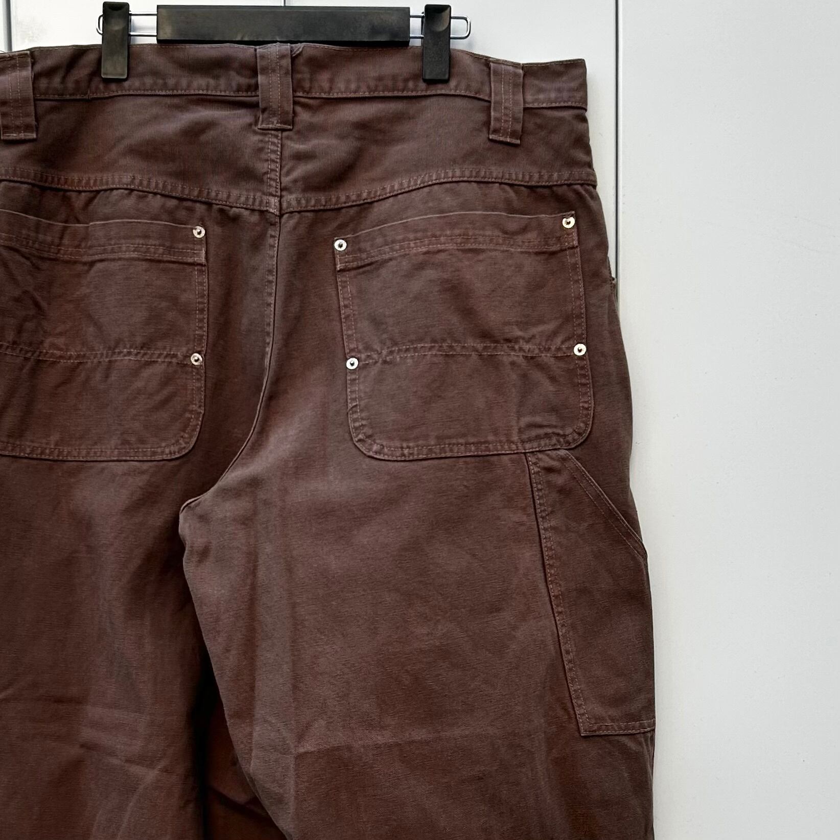ブラウンのダック素材、左にサイドポケット、ハンマーループ、ロゴ入りボタン、リベット、ペインター型のデザインです。