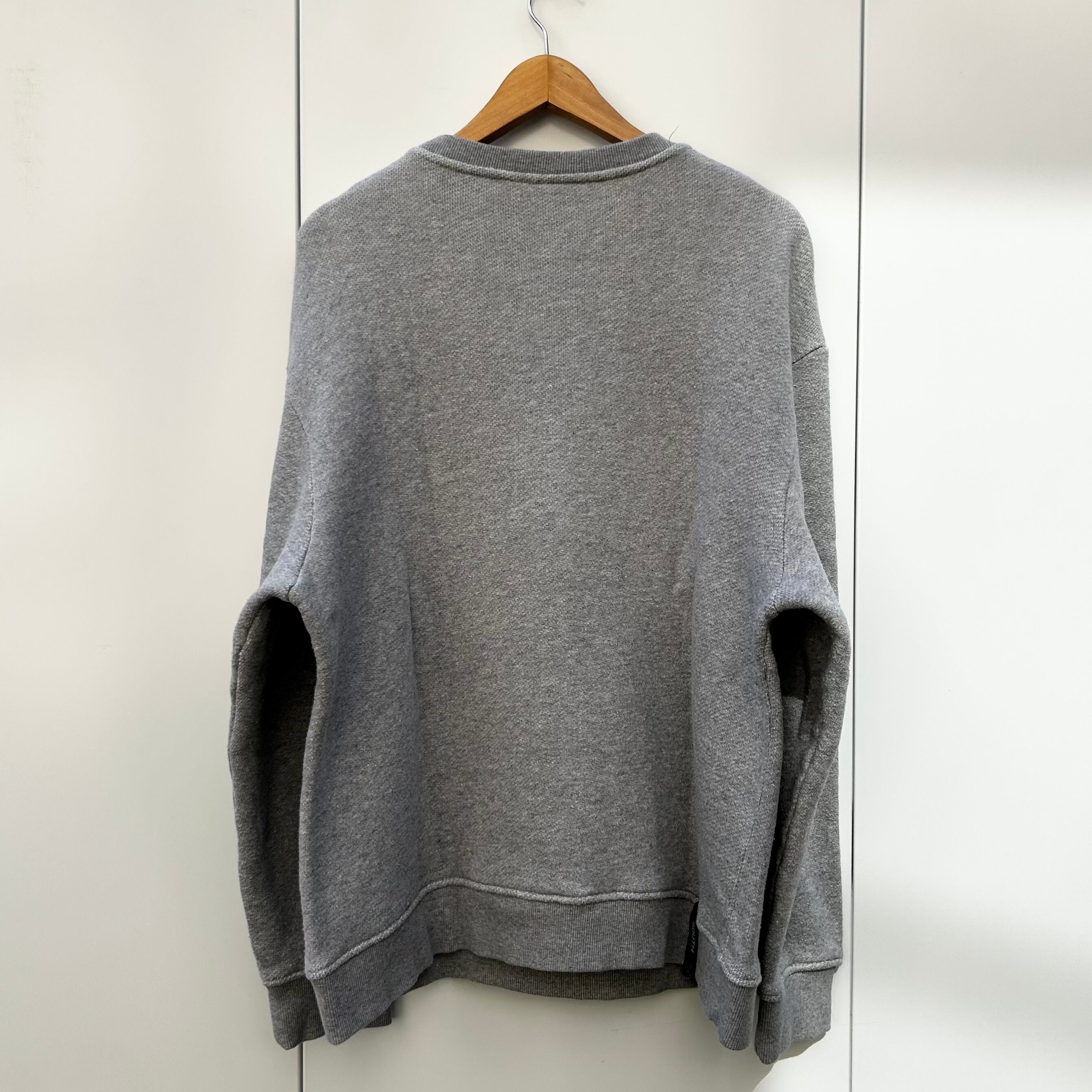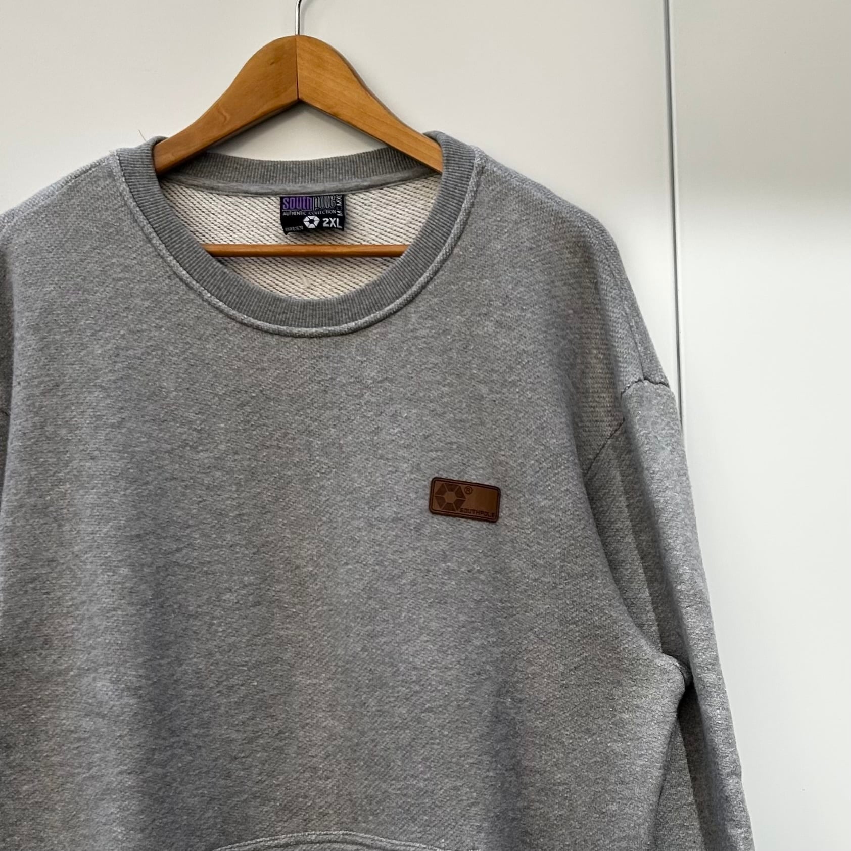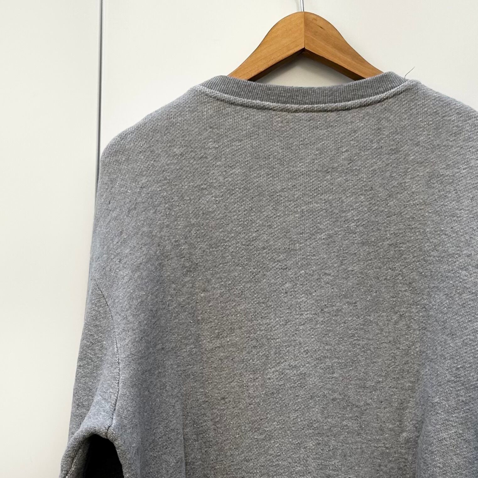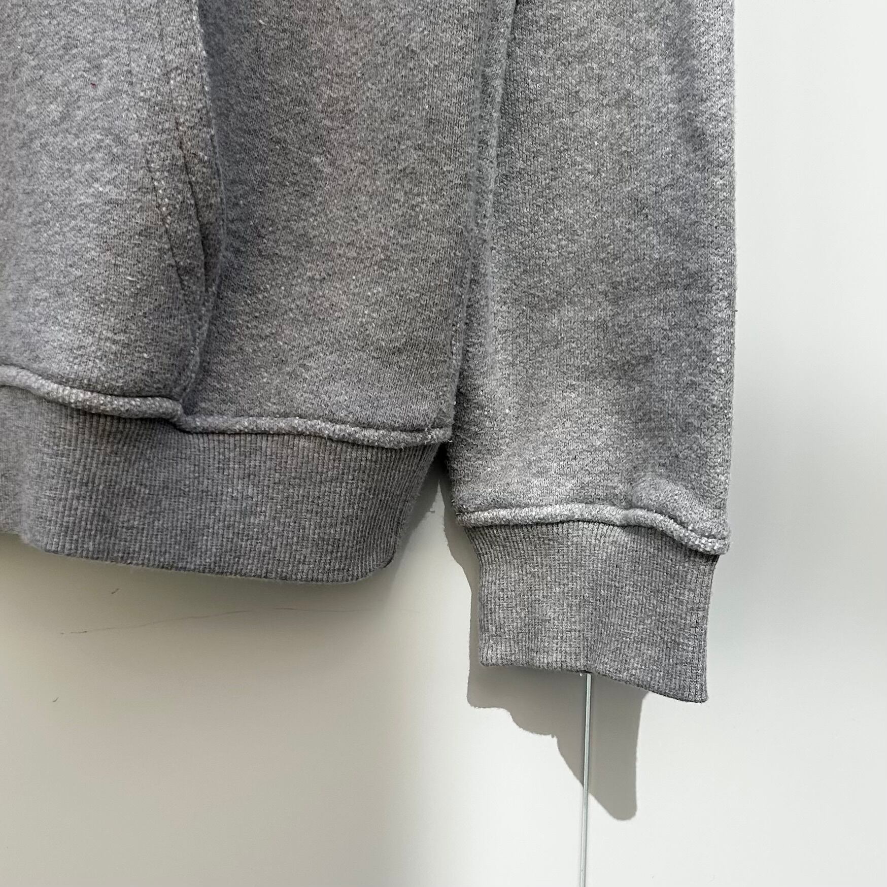 グレーの裏起毛素材、左胸にロゴマークワッペン、カンガルーポケット、バック右裾にネームが付いたデザインです。