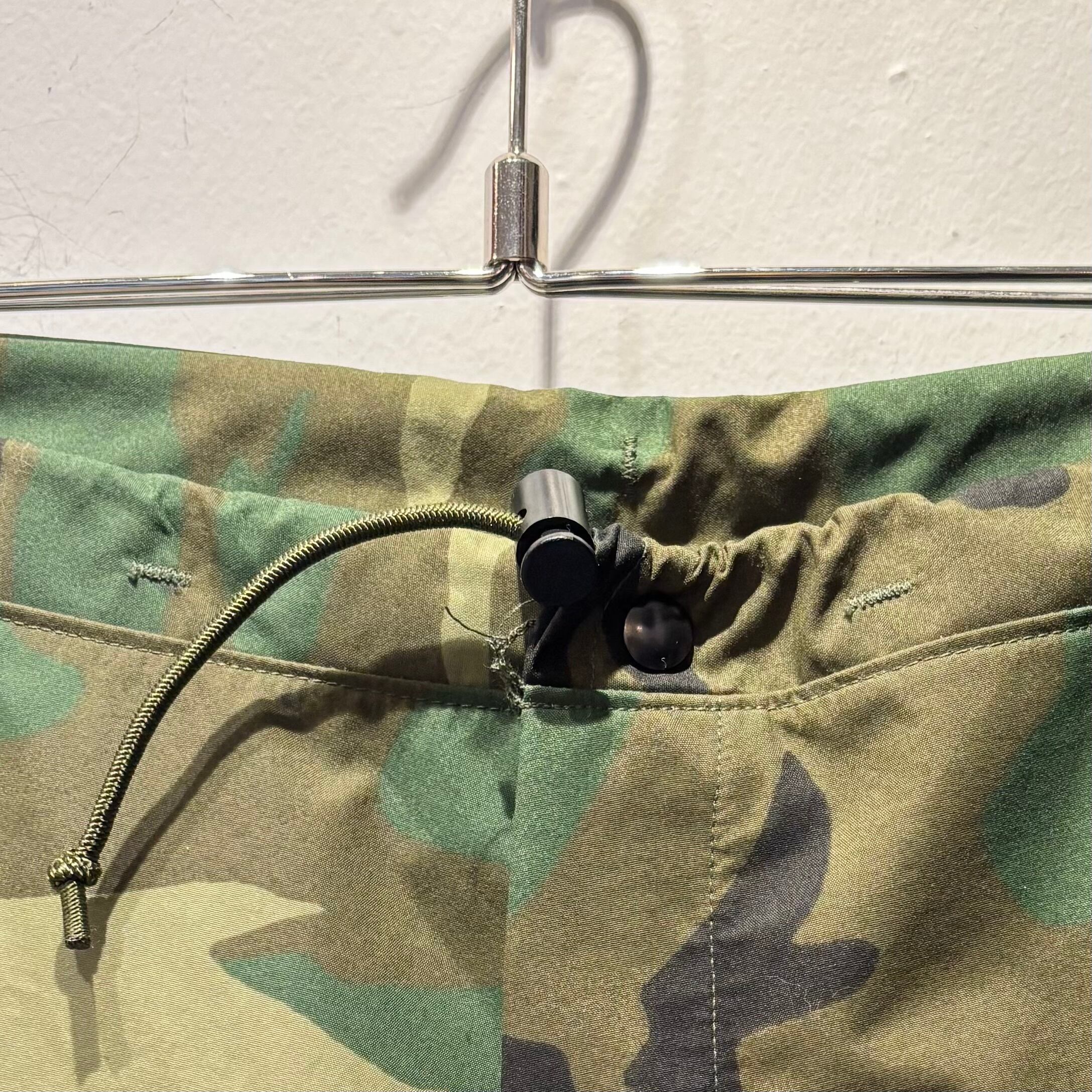 ウッドランドカモのナイロン素材、ウェストゴムで調節、裾の両サイドにジッパーとベロクロで開閉するデザインです。