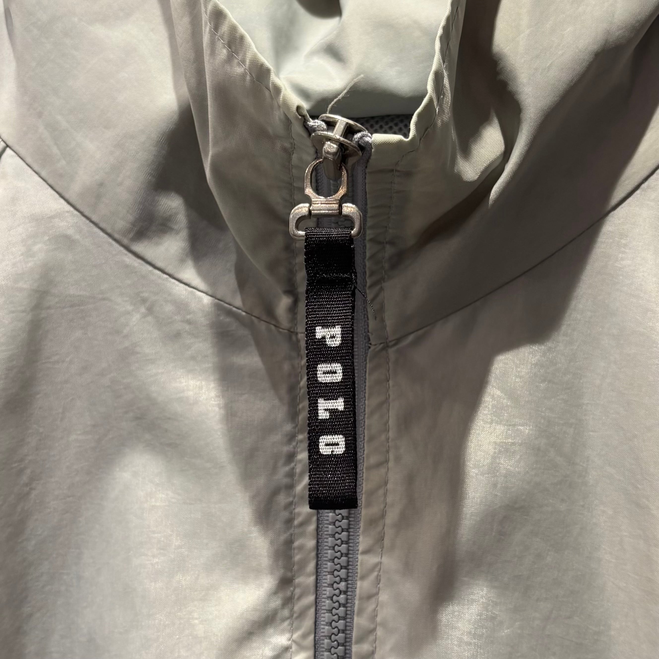 グレーxブラックのナイロン素材/レッドパイピング、左胸にロゴ刺繍、両袖にロゴプリント、POLOロゴのジッパースライダー、ハンドウォームポケット、裾にドローコードが付いたデザインです。