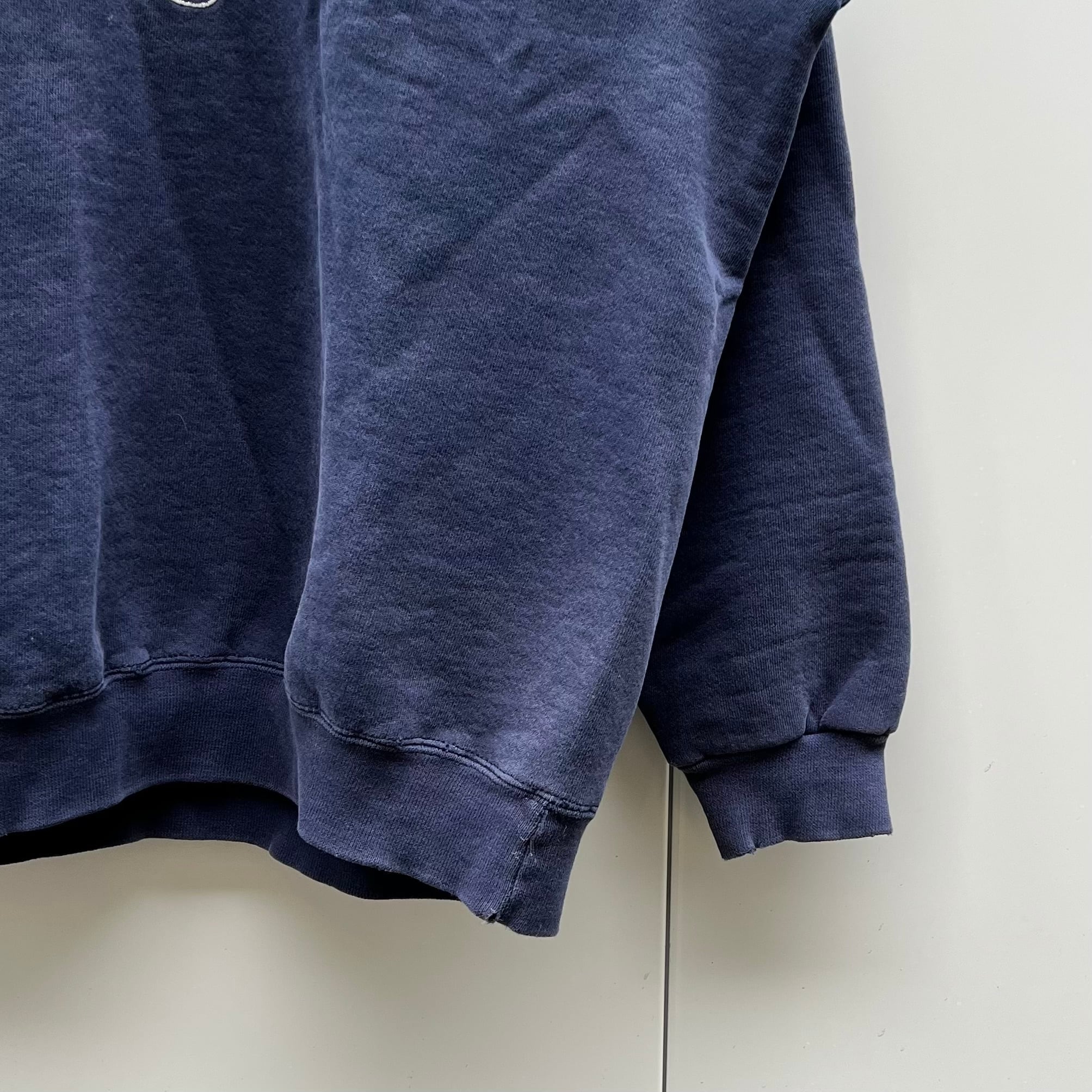 ネイビーの裏起毛素材、フロントにロゴとロゴマークの刺繍が入るシンプルデザインです。