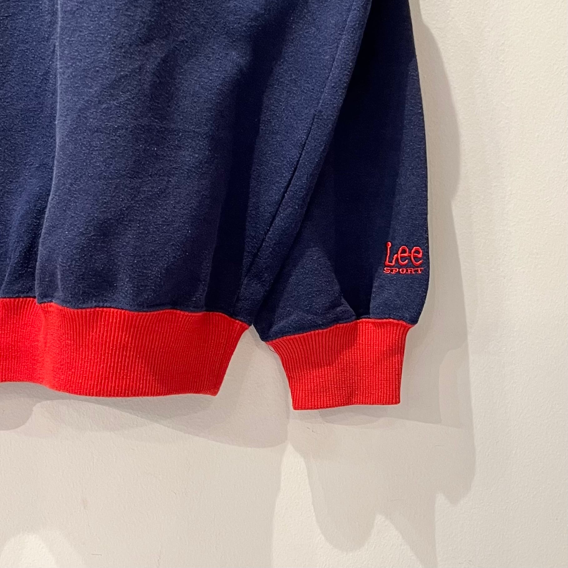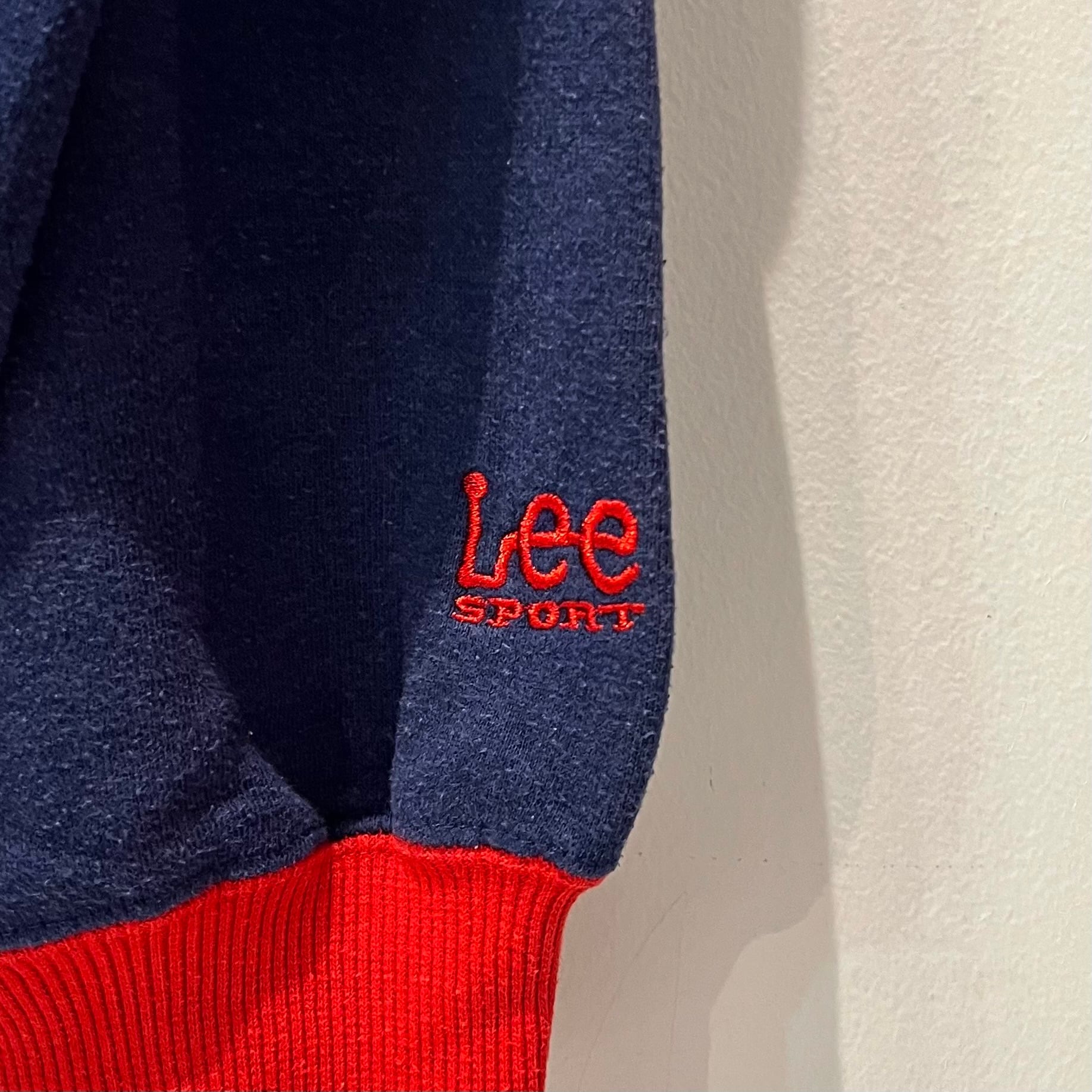 ネイビーの裏起毛素材xレッドリブ、フロントにINDIANSロゴ刺繍とワフー酋長ワッペンが付いたデザインです。