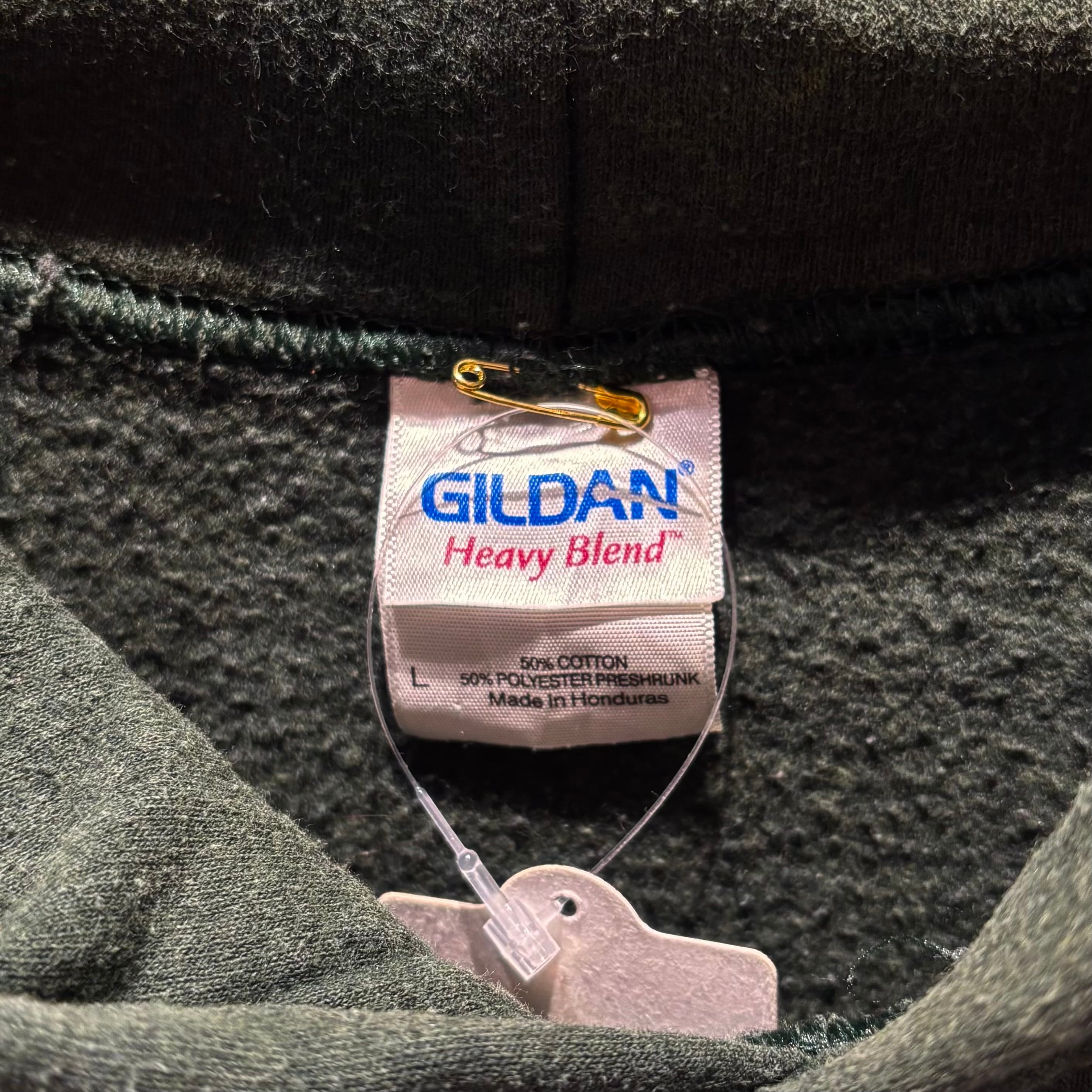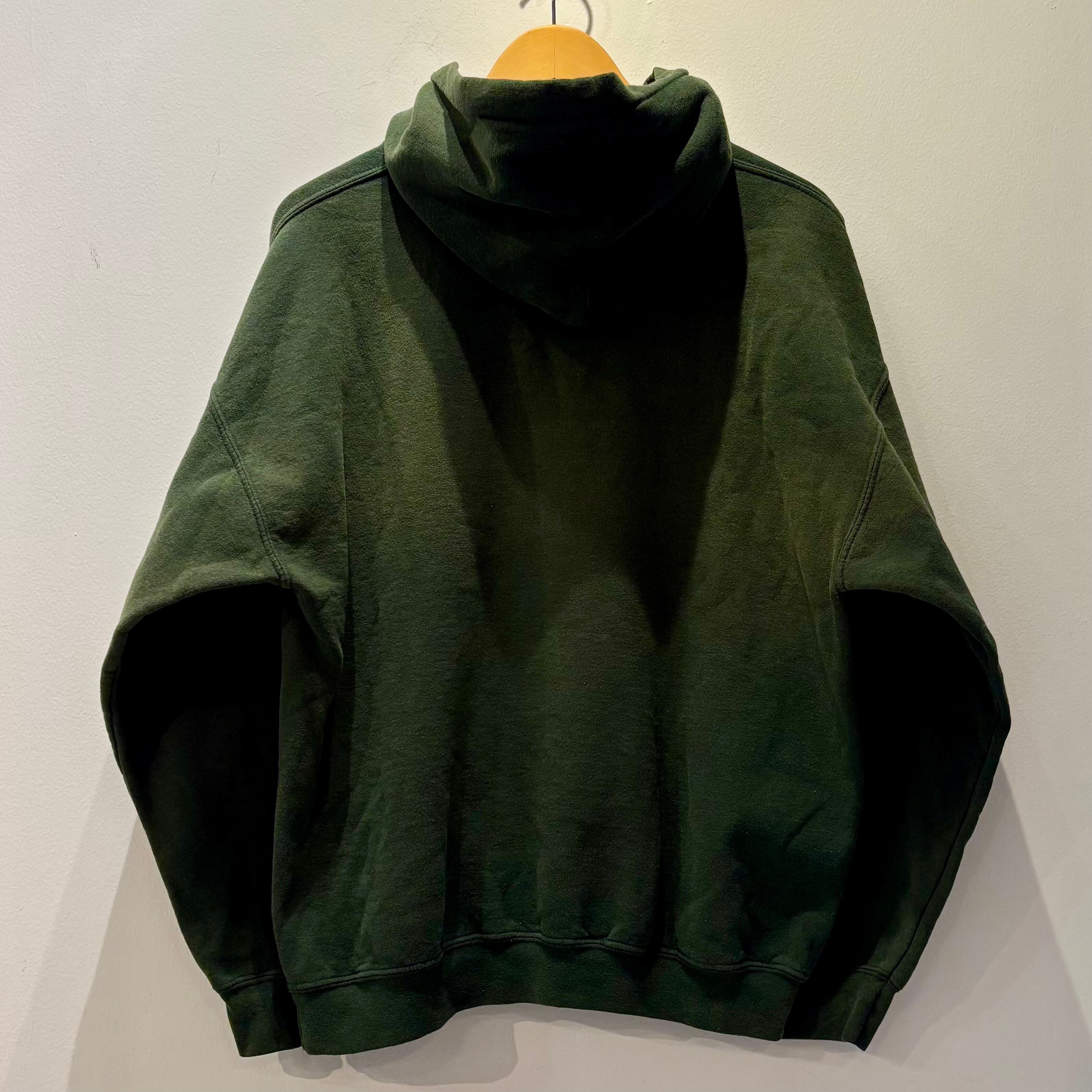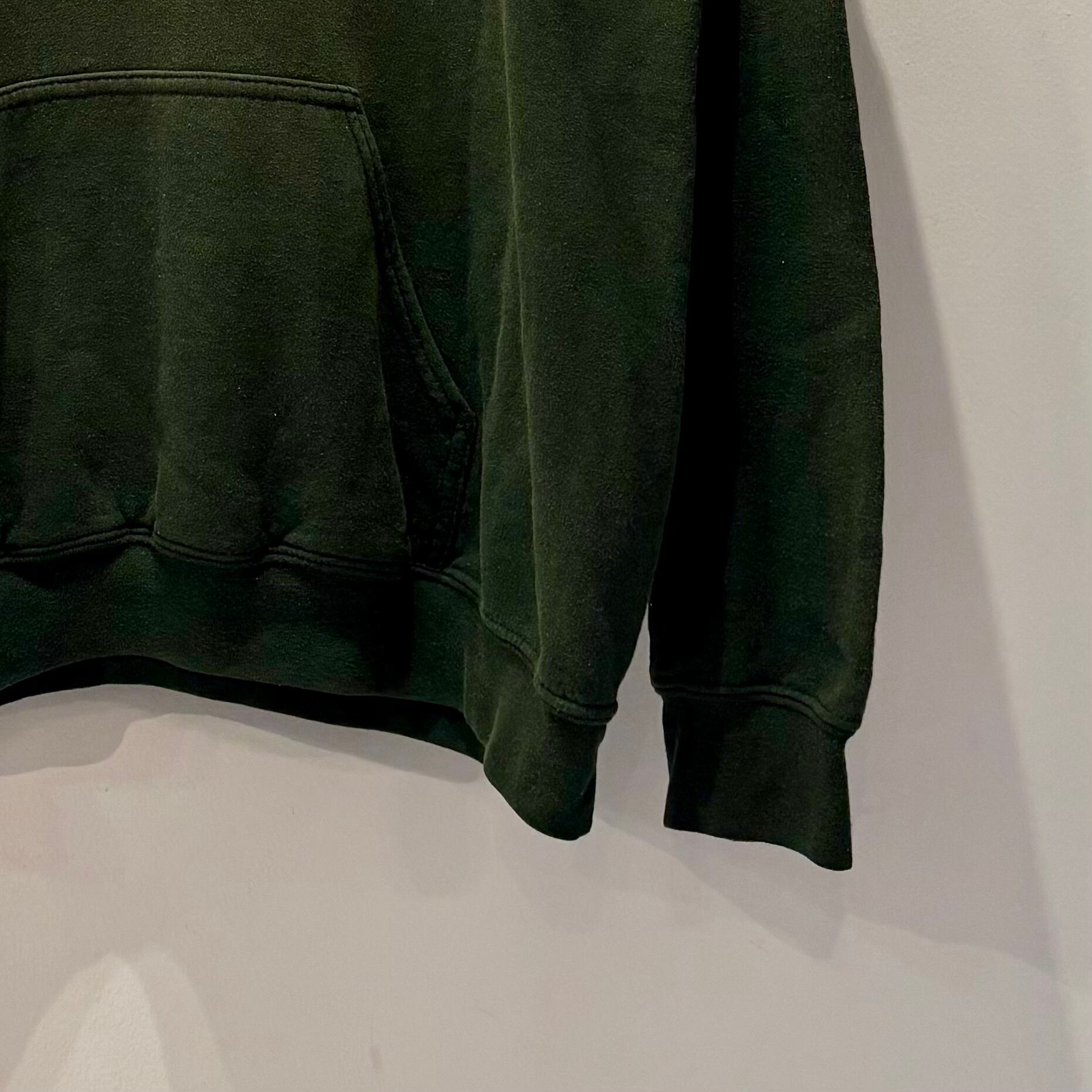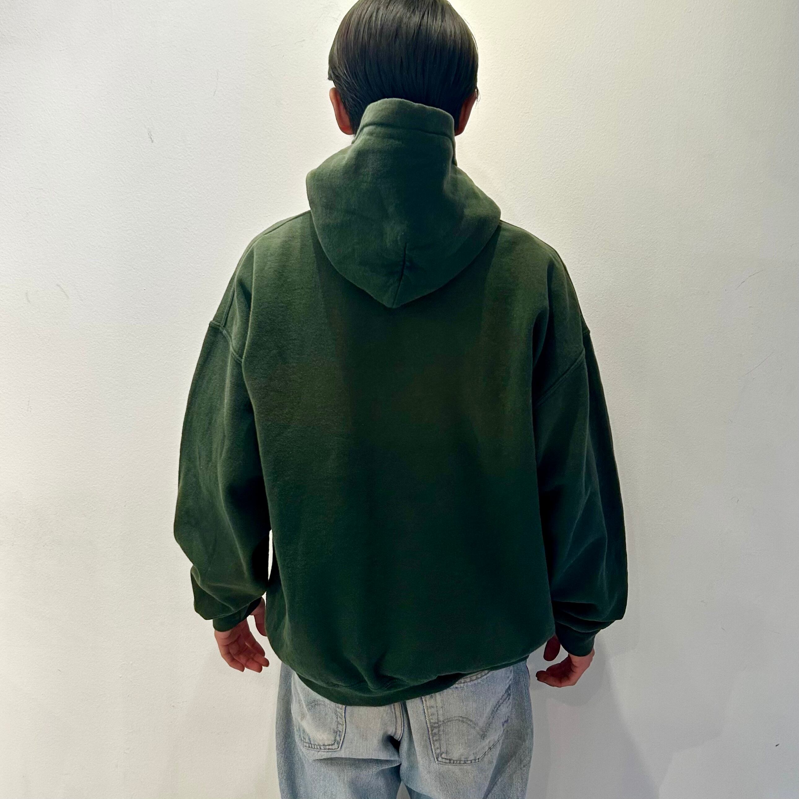 ダークグリーンの裏起毛素材、フロントにロゴとロゴマーク、ALL INプリントが入るシンプルデザインです。