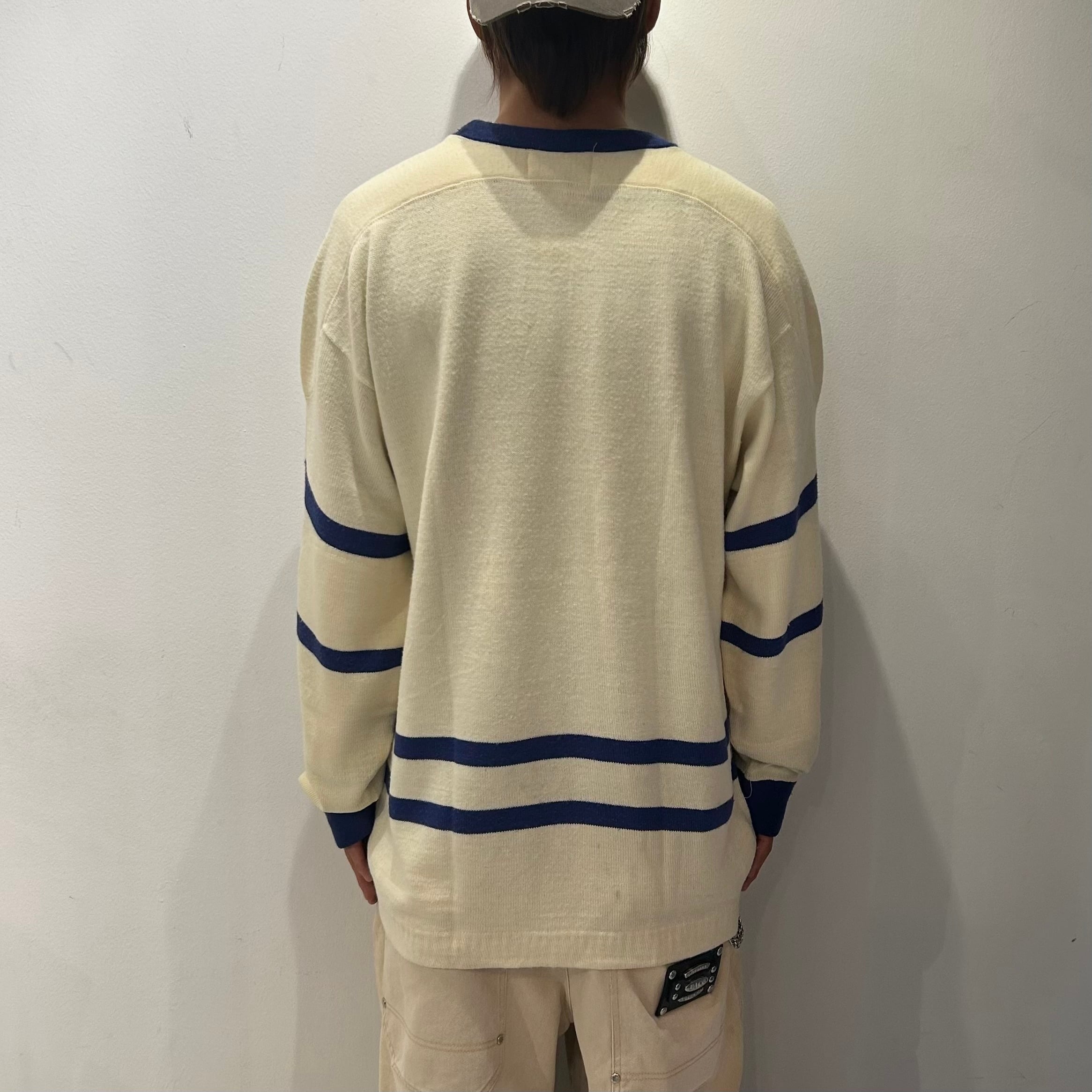 ホワイトxブルーのアクリル混素材、フロントに大きくロゴマークのフェルトワッペン、左裾にCirca1950とネーム、エルボーパッドの付いたジャージ型デザインです。