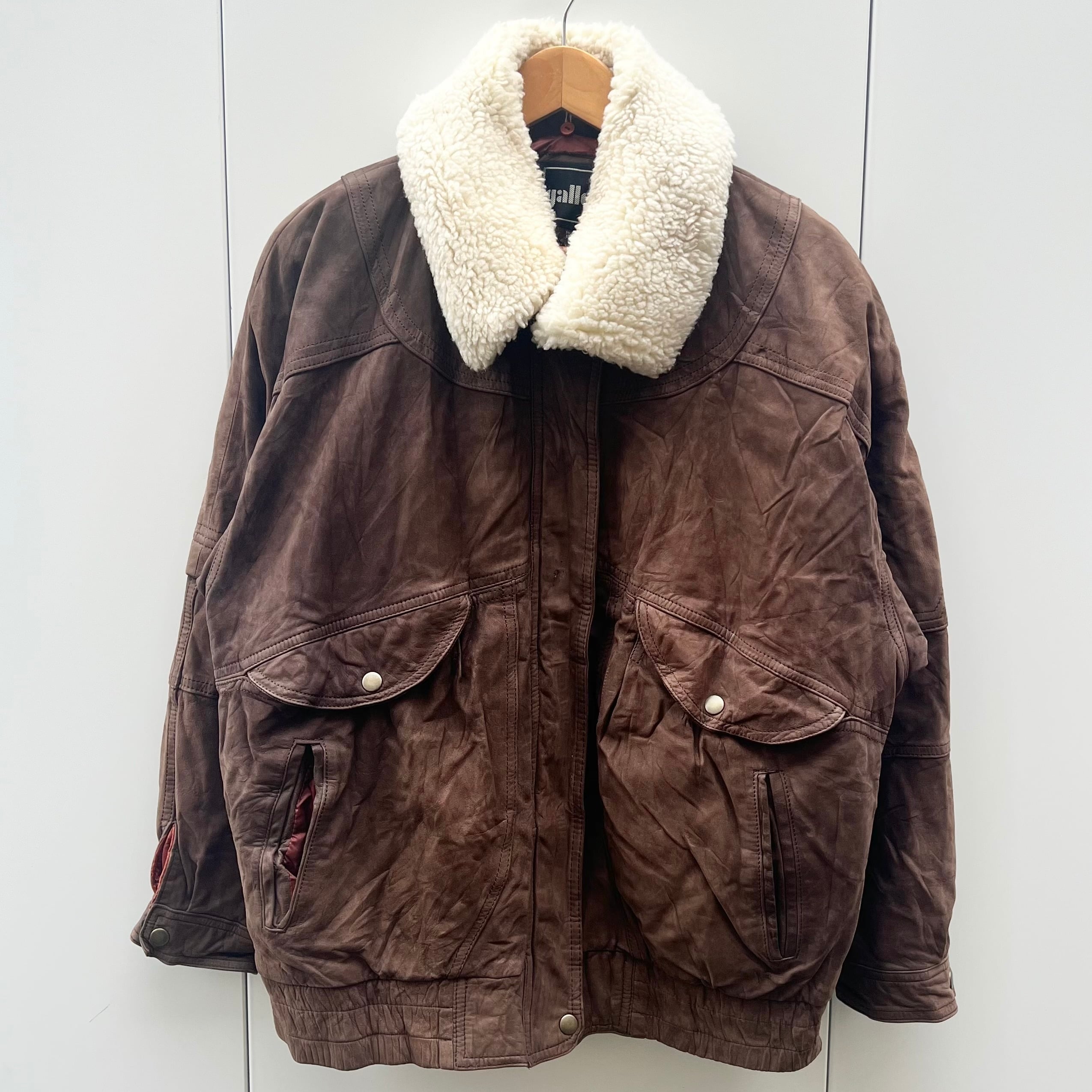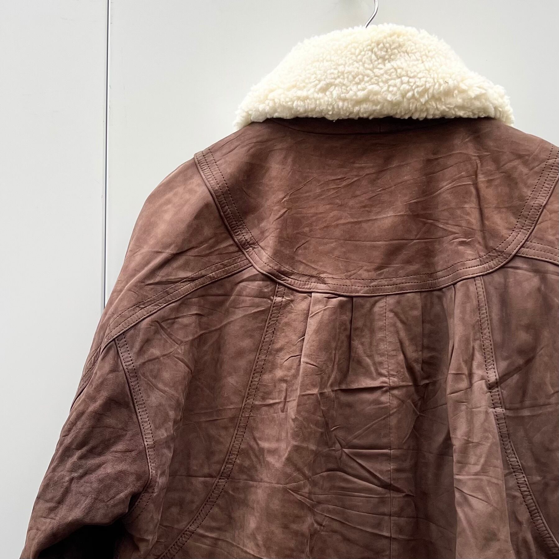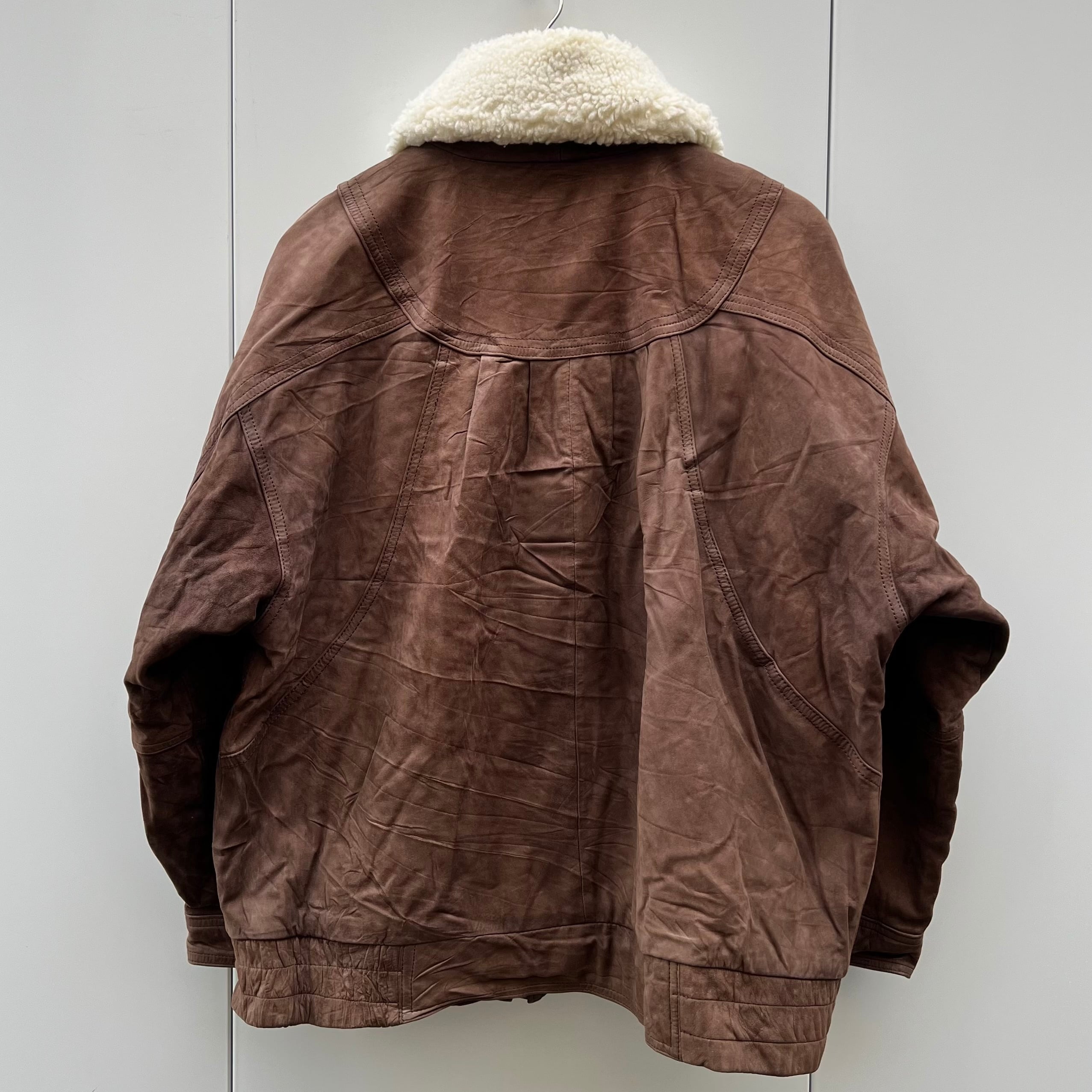 ブラウンヌバックのレザー、フラップ付きとハンドウォームのダブルポケット、脱着可能な襟ボア、比翼の付いたボンバー型デザインです。
