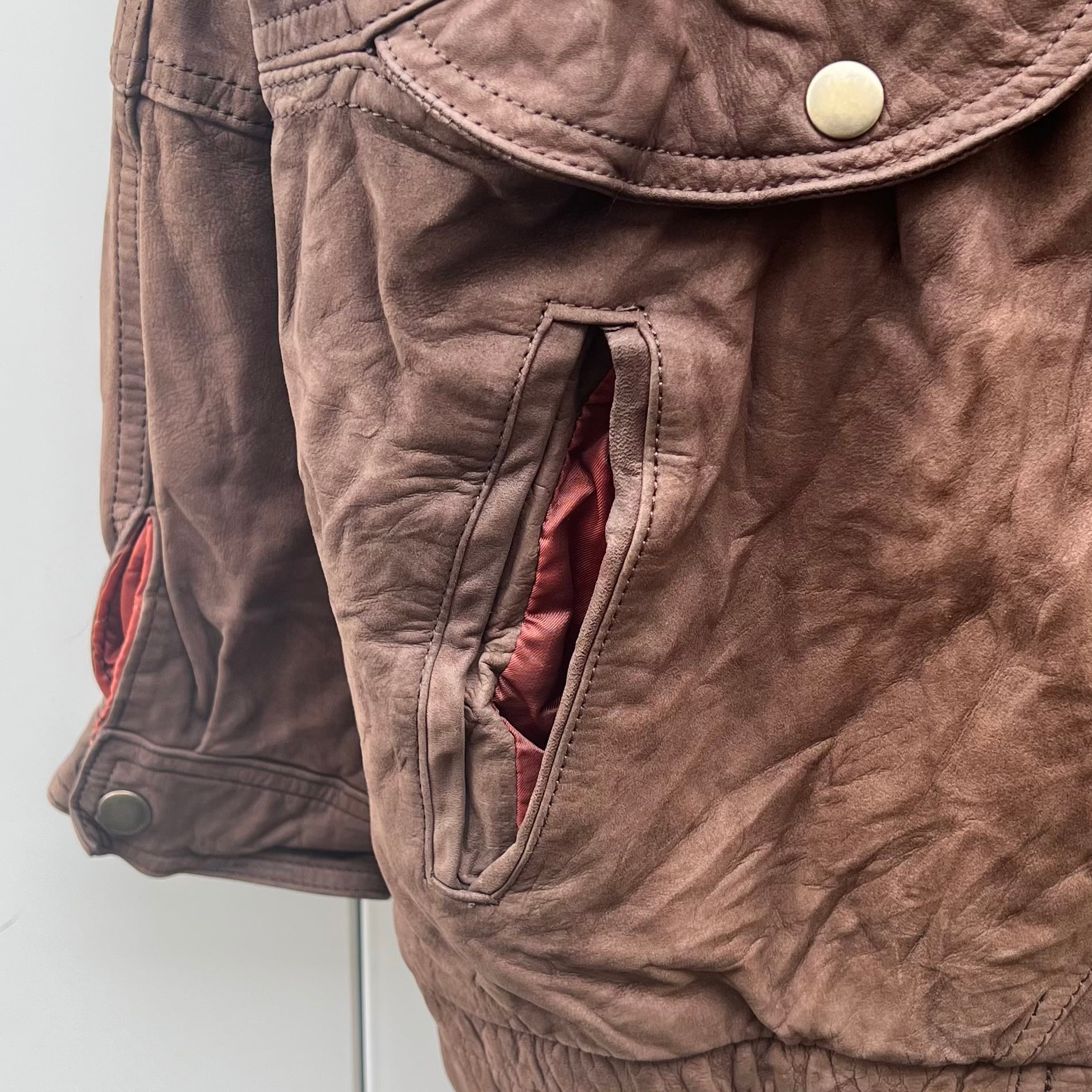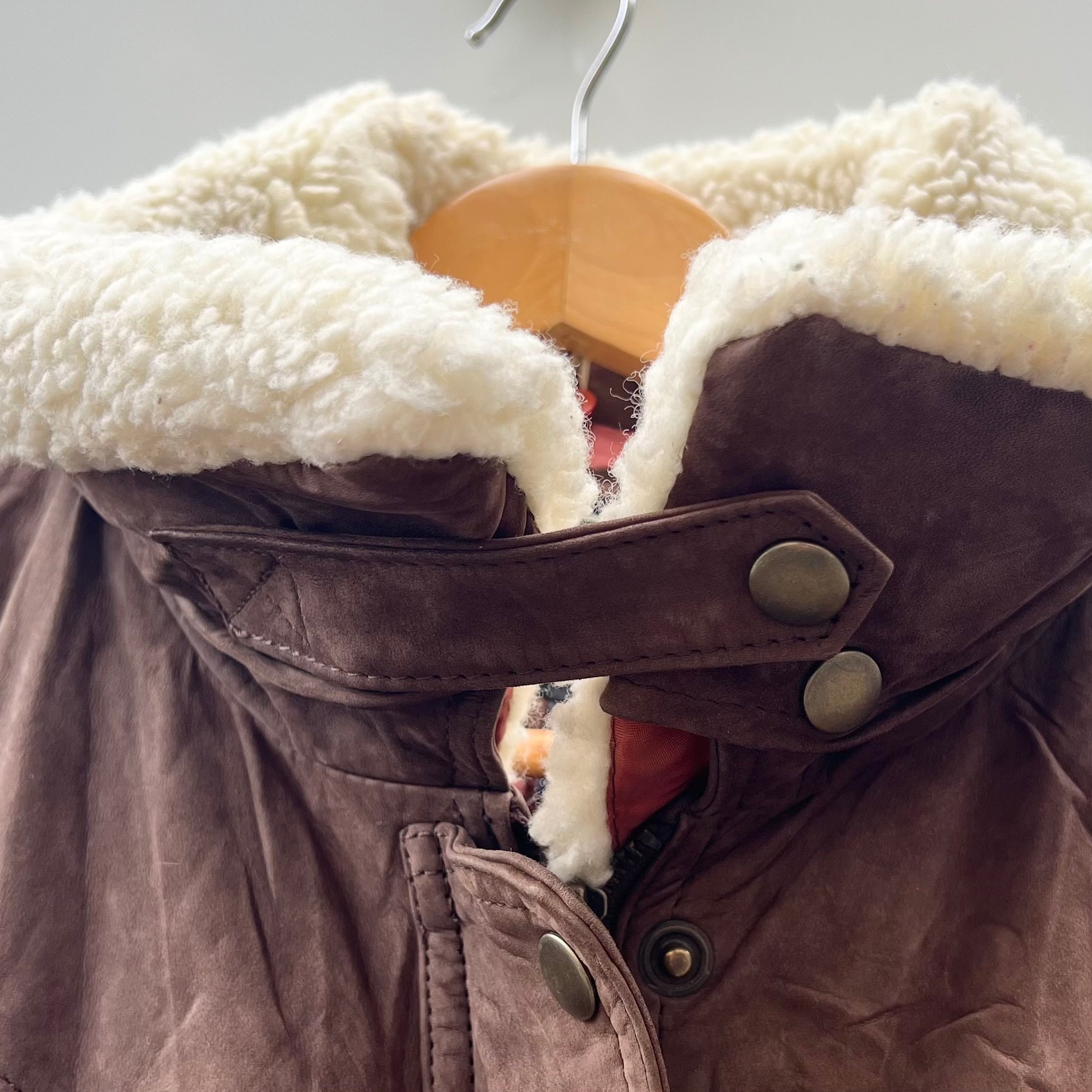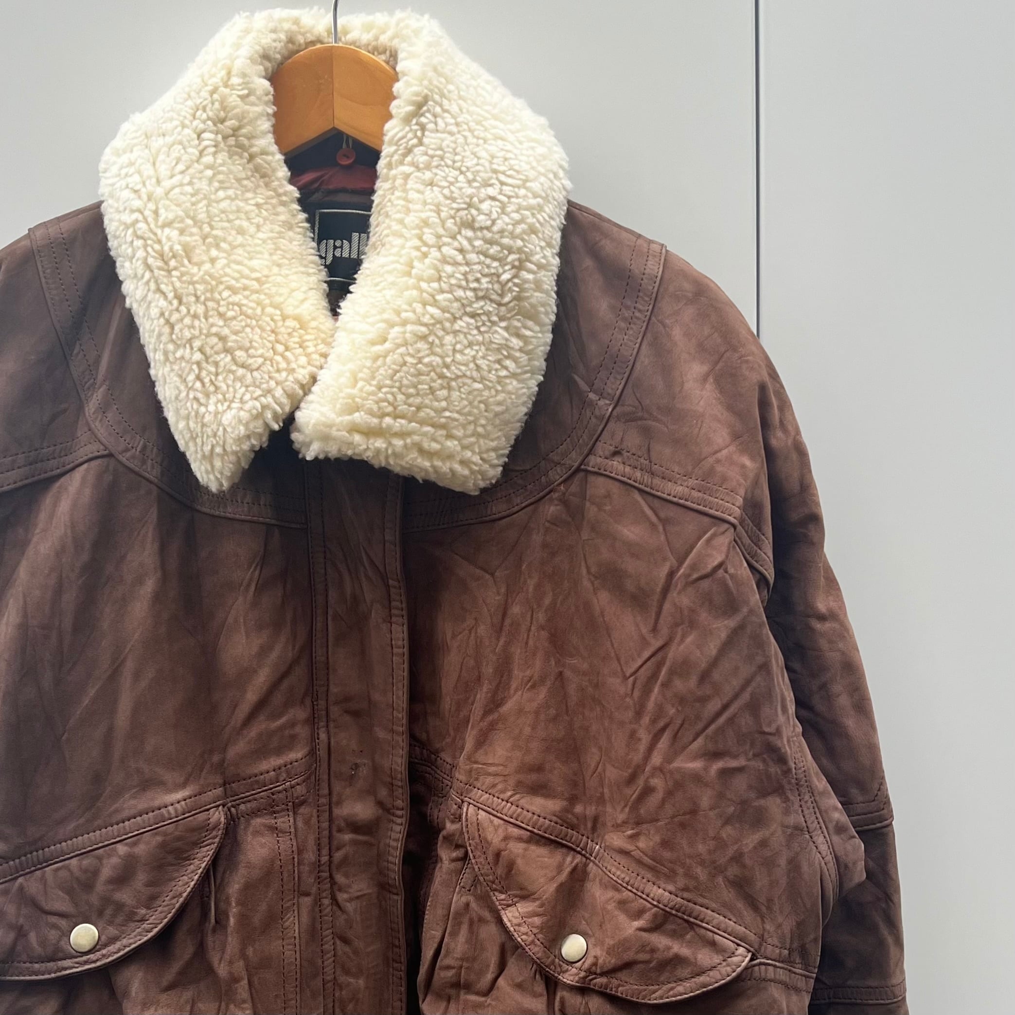 ブラウンヌバックのレザー、フラップ付きとハンドウォームのダブルポケット、脱着可能な襟ボア、比翼の付いたボンバー型デザインです。