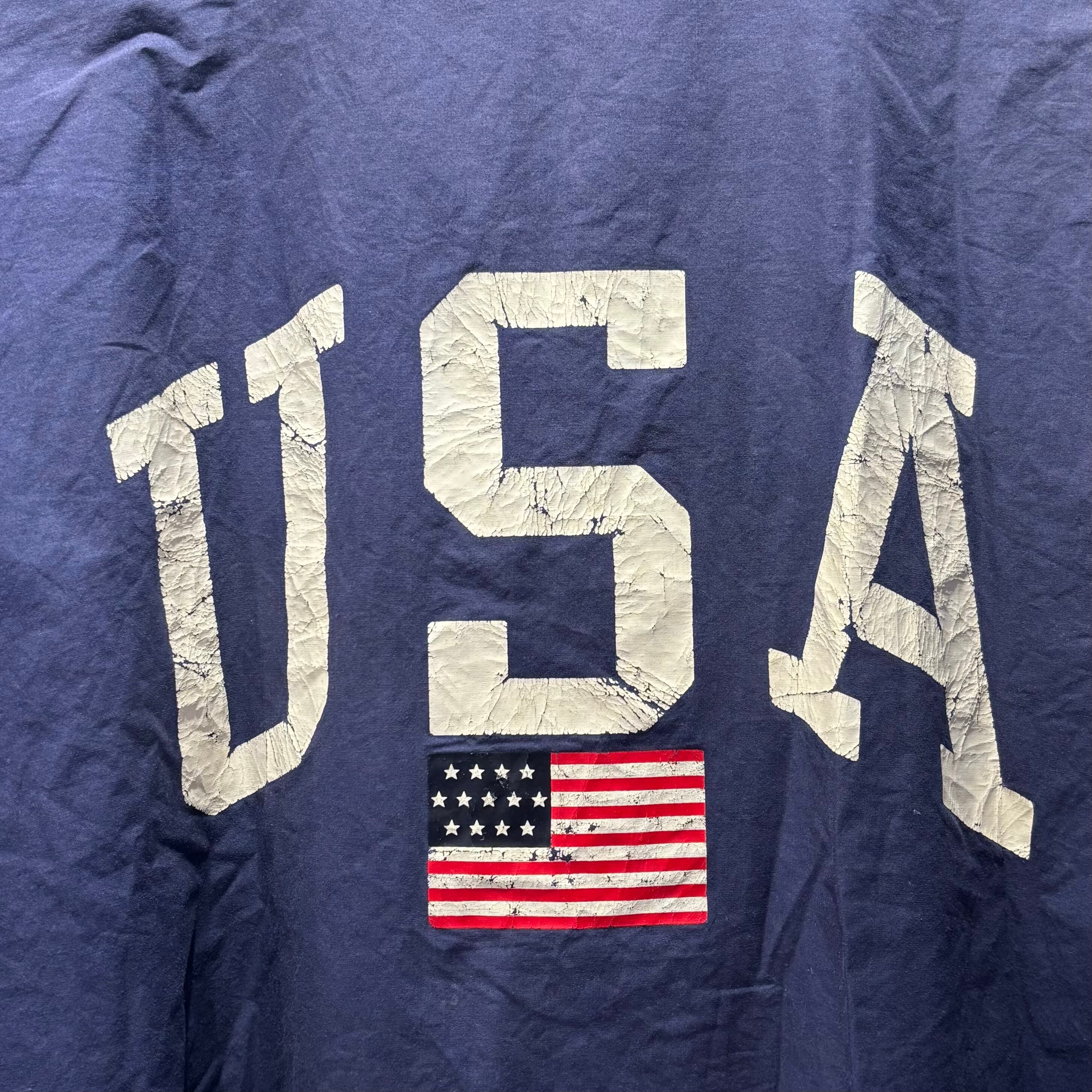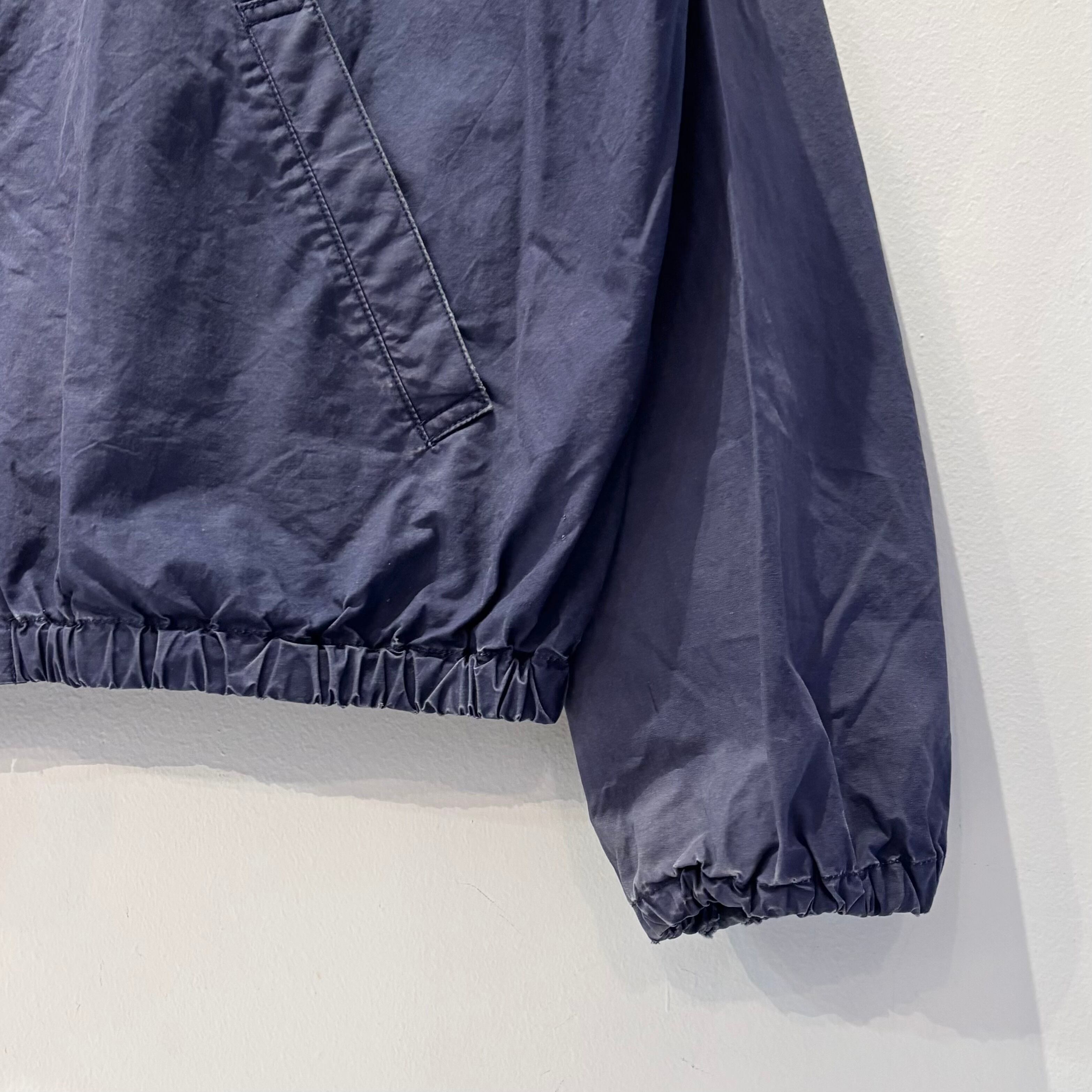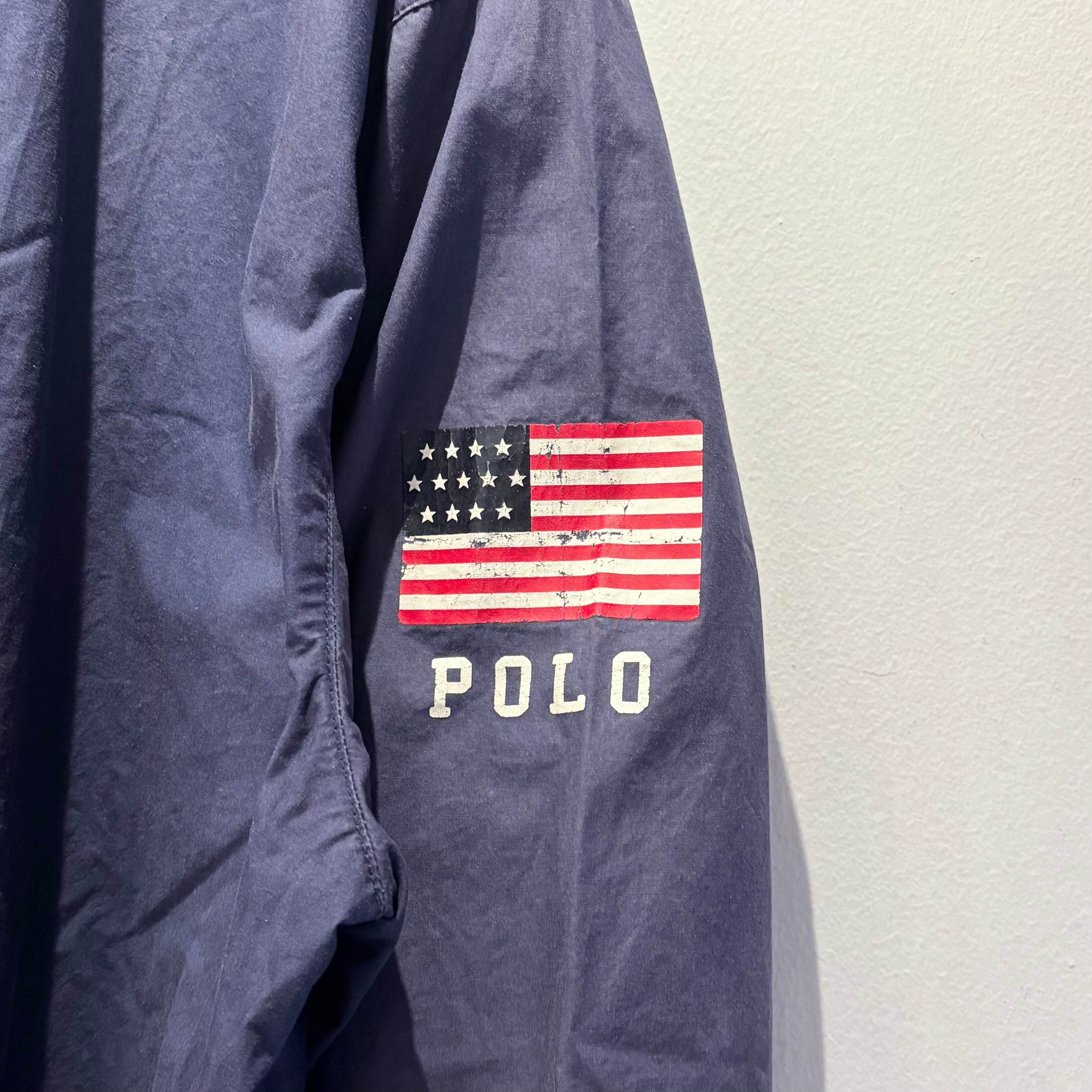 ネイビーのコットン素材、左腕に星条旗とPOLOプリント、バックに大きくUSAと星条旗プリント、ハンドウォームポケット、チンストラップ、袖と裾にゴムが入るデザインです。