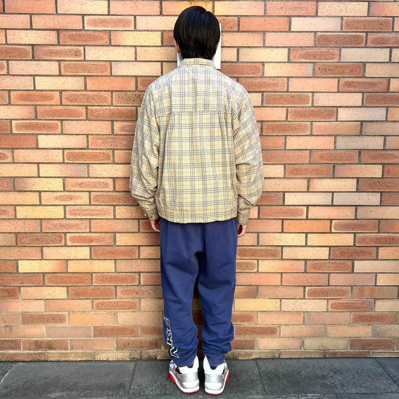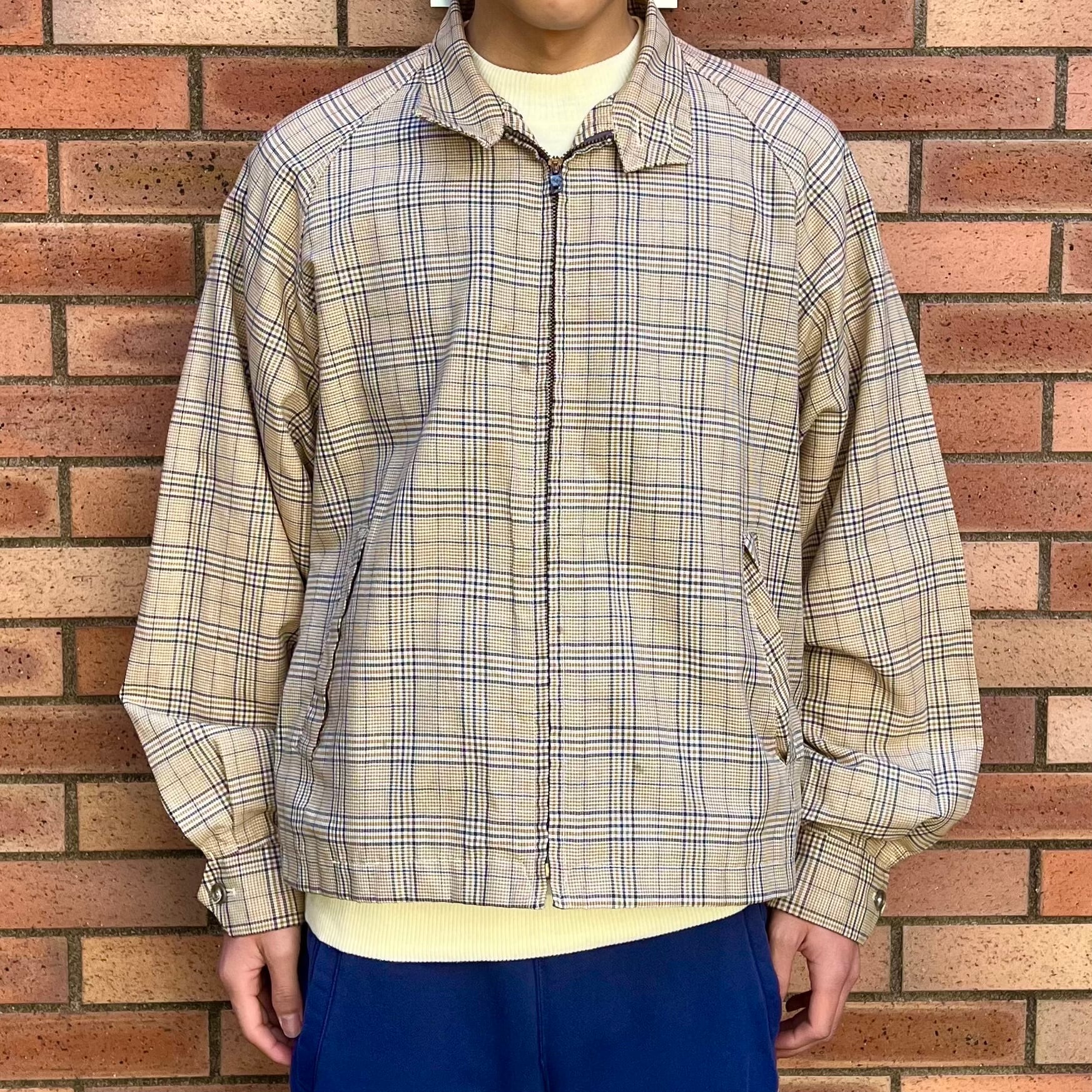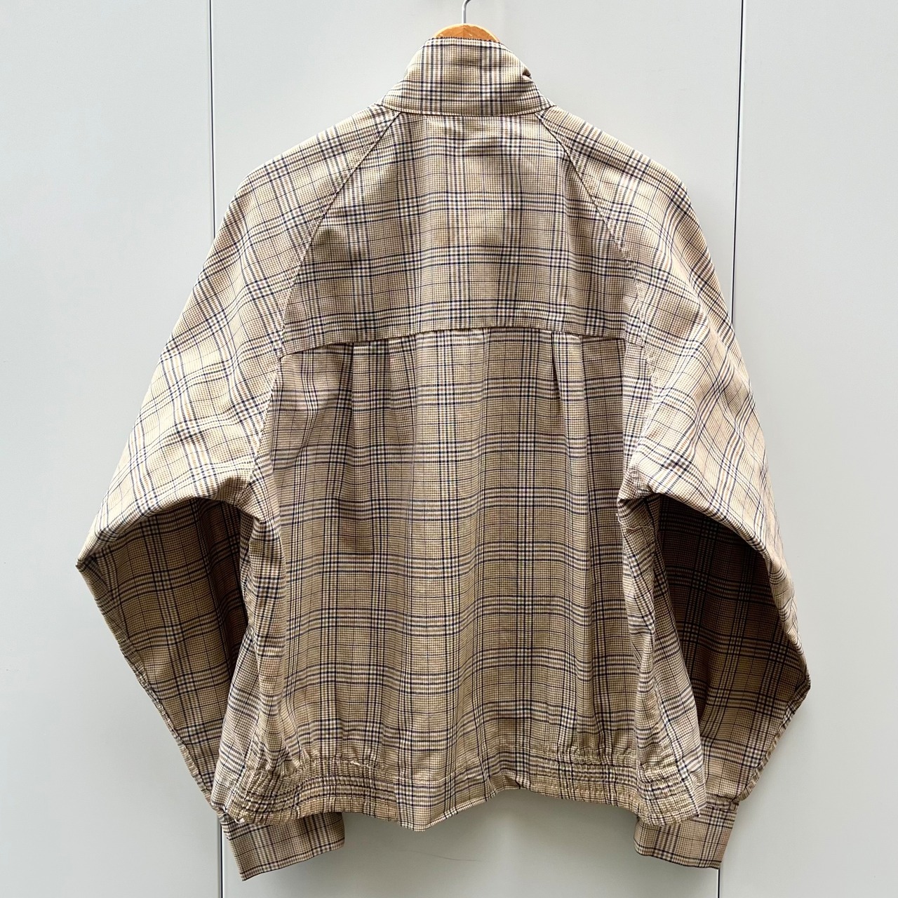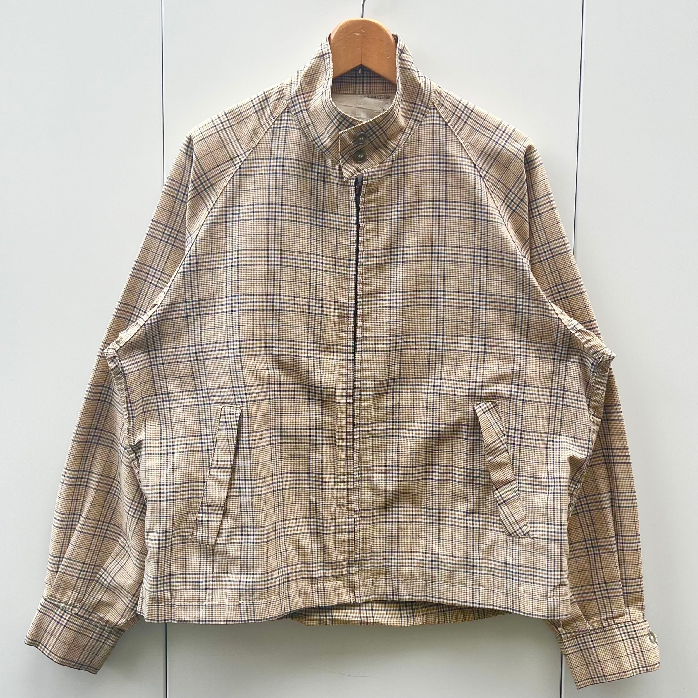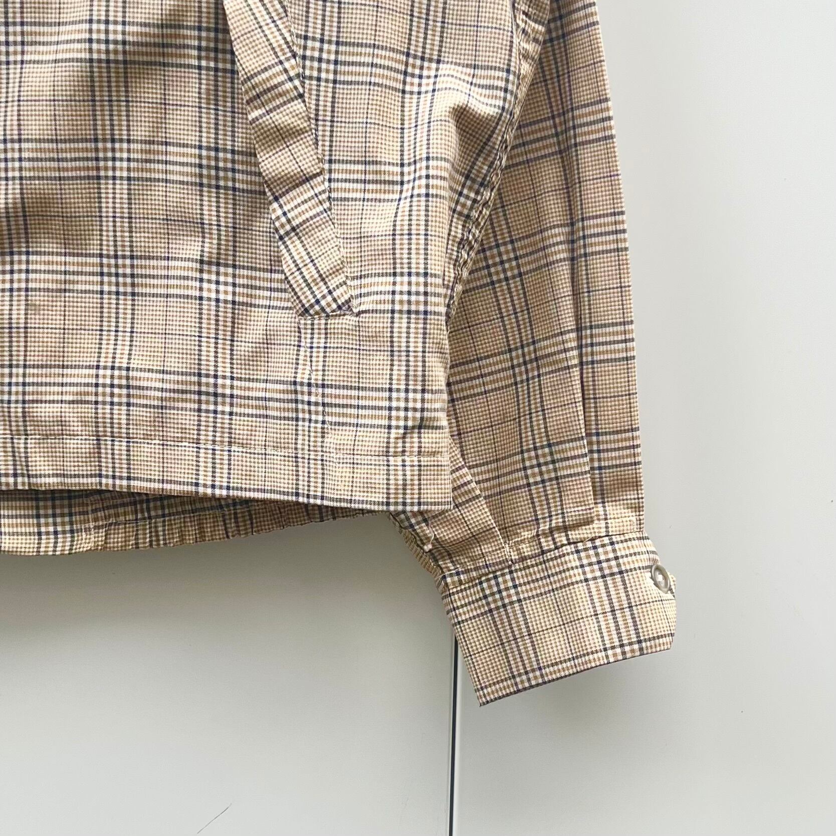 ベージュ系チェックのポリエステル混系素材、GENERALジッパー、ハンドウォームポケット、両サイドにゴムアジャスターの付いたシンプルデザインです。