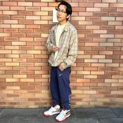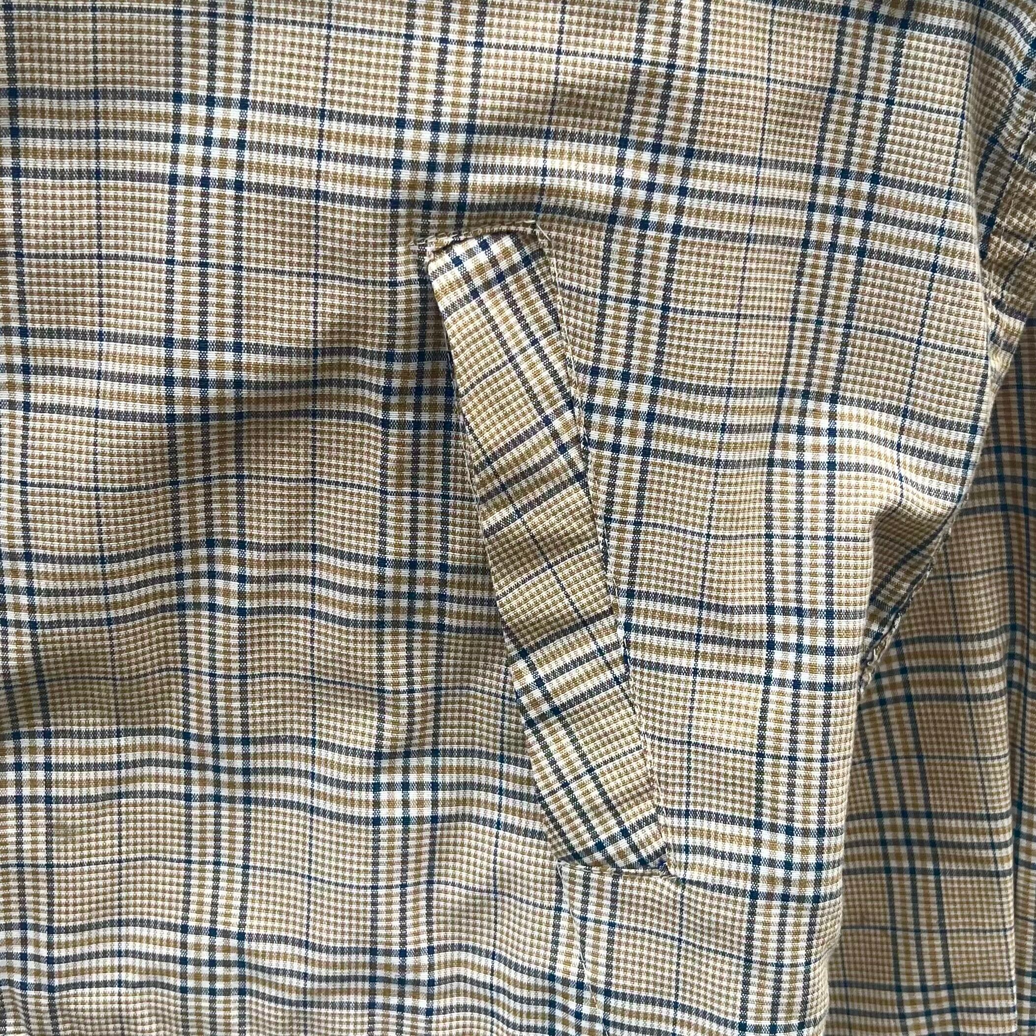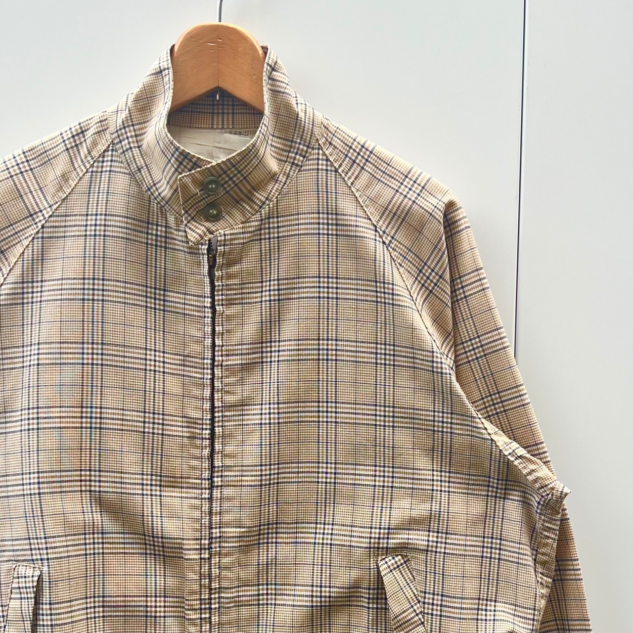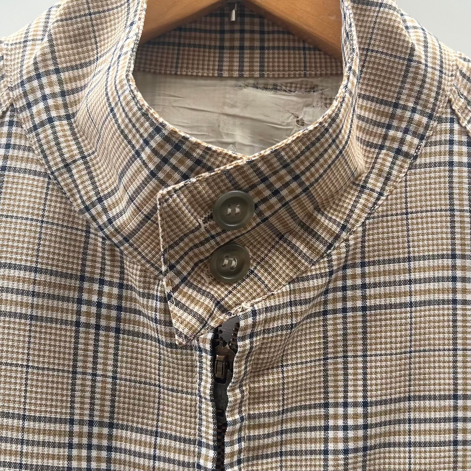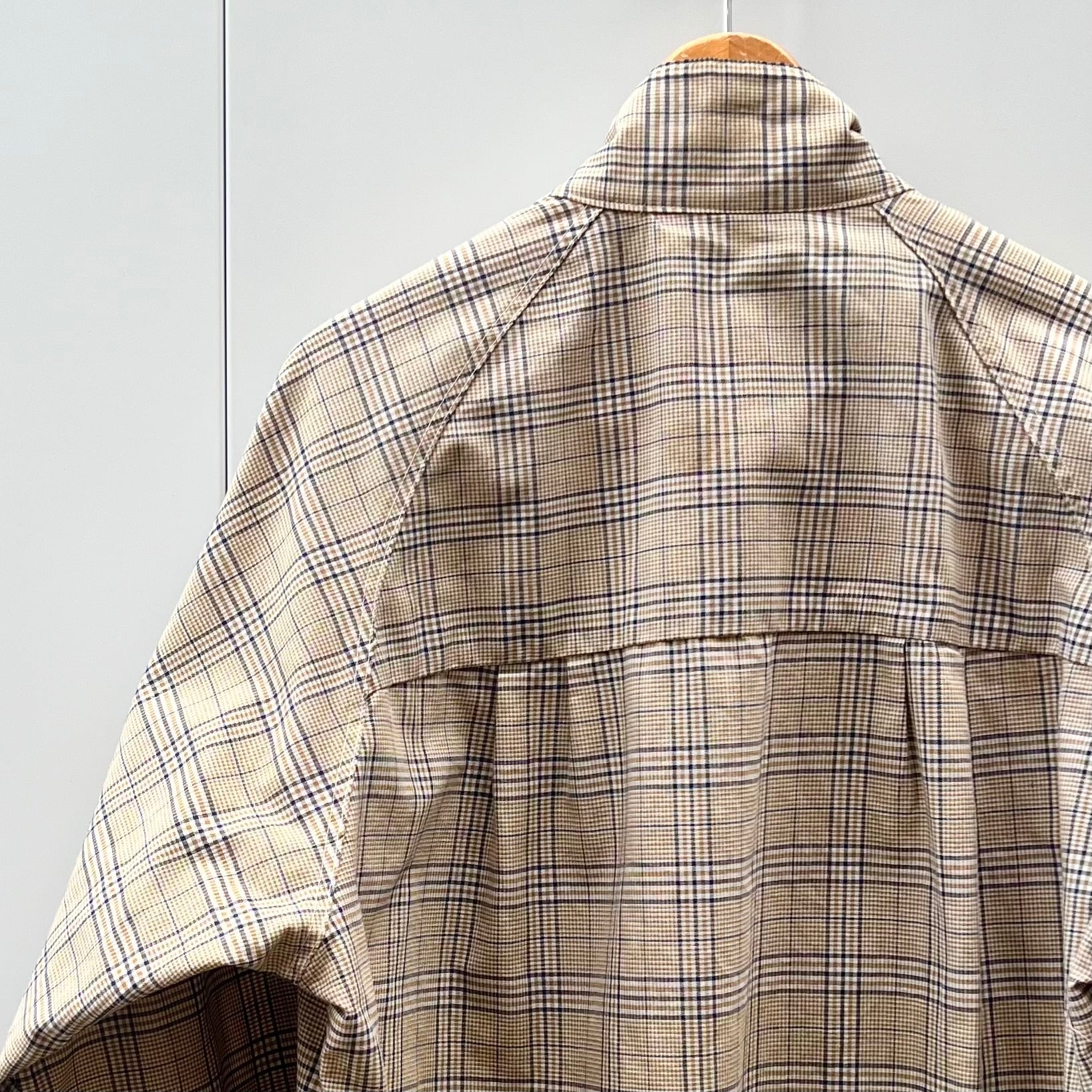 ベージュ系チェックのポリエステル混系素材、GENERALジッパー、ハンドウォームポケット、両サイドにゴムアジャスターの付いたシンプルデザインです。