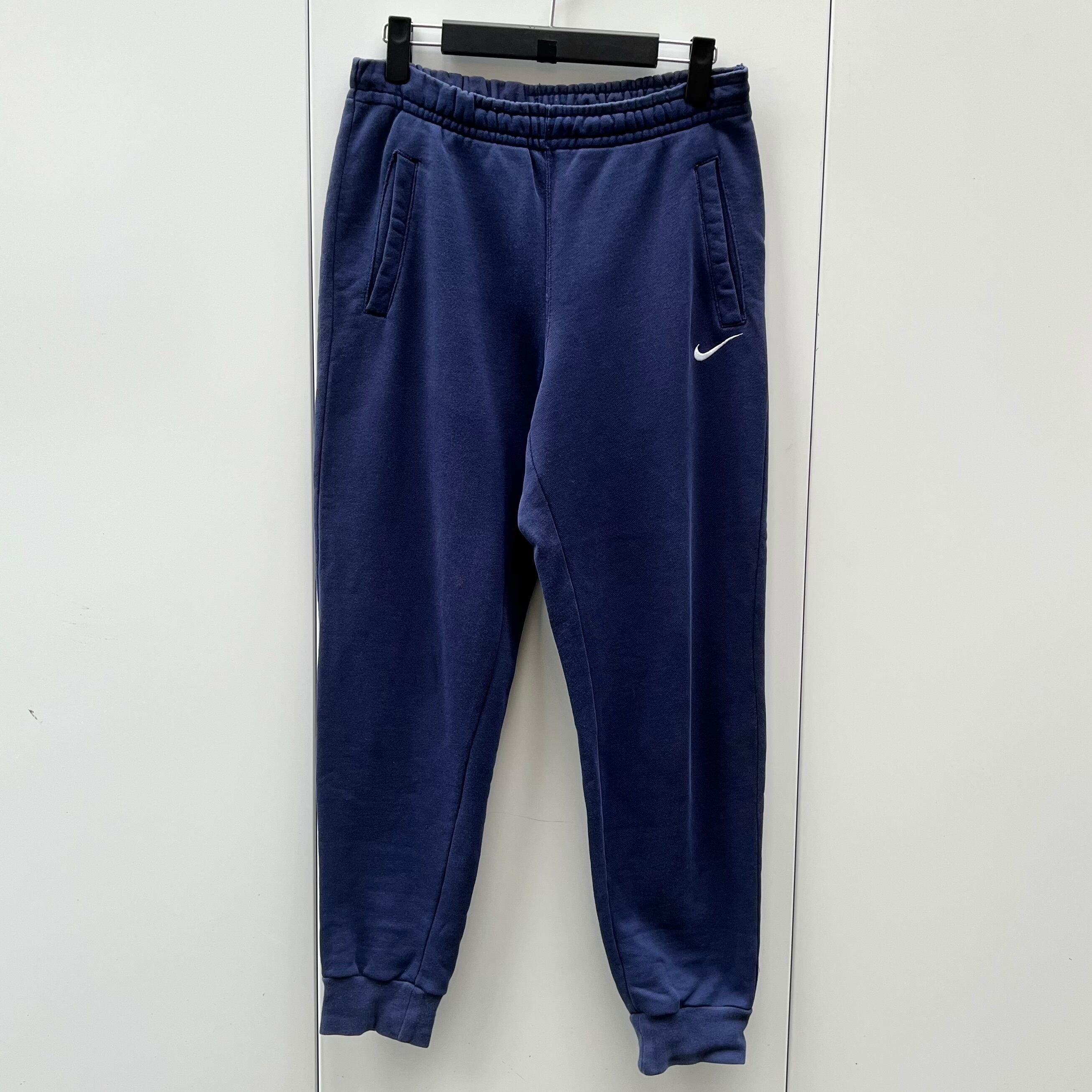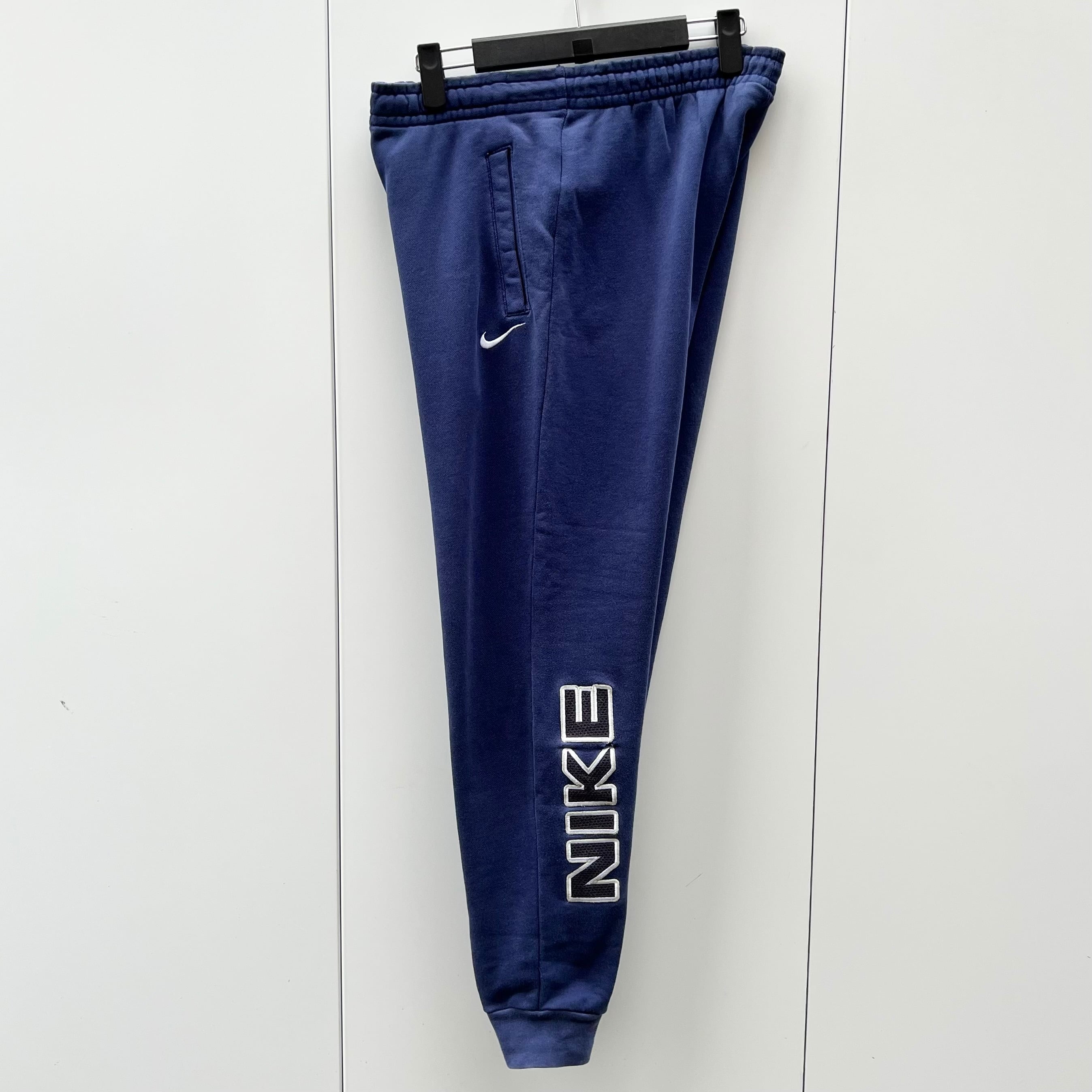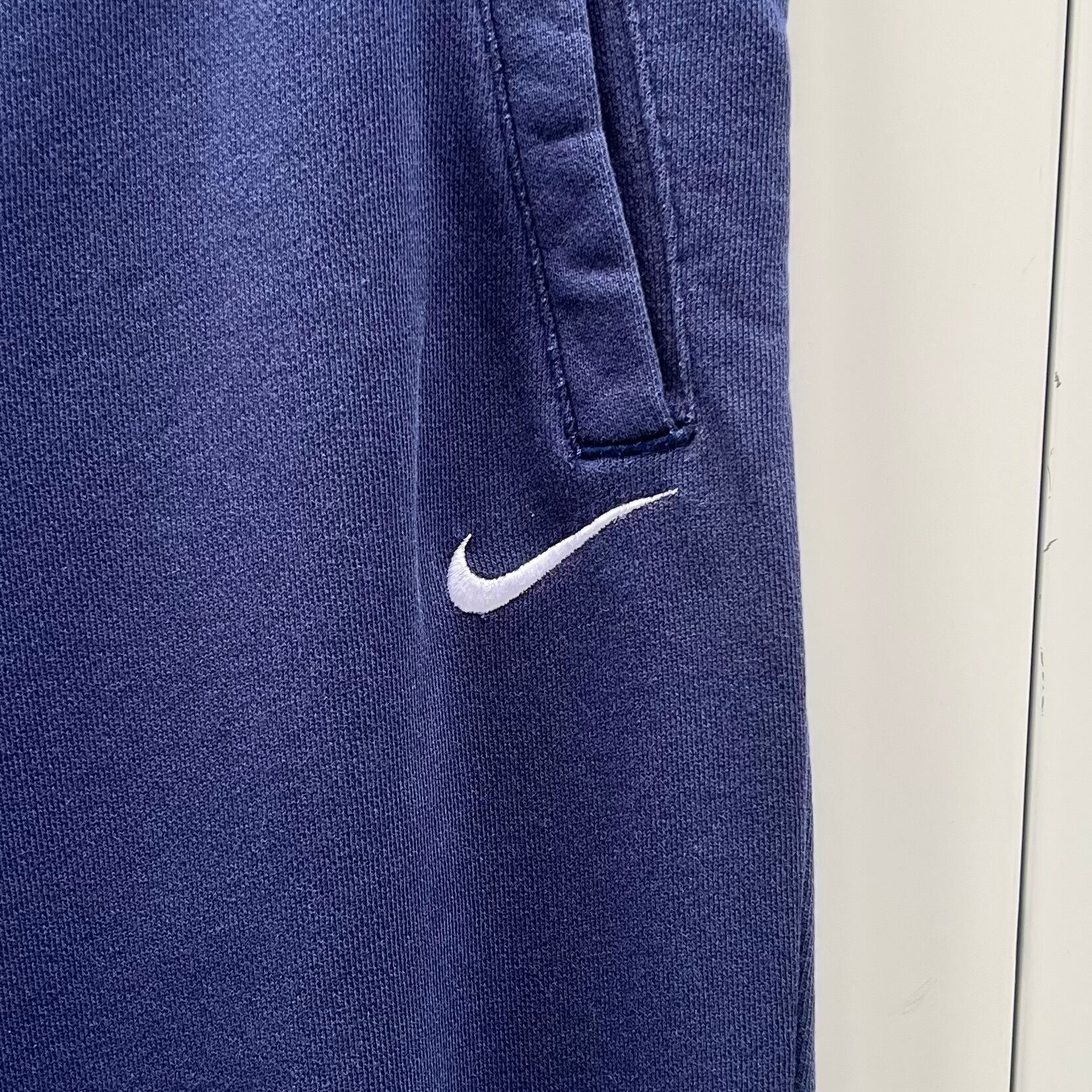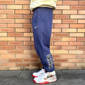 ネイビーの裏毛素材、左足にスウォッシュ刺繍、バック左サイドに大きくNIKE刺繍、ハンドウォームポケット、裾にリブが付いたシンプルデザインです。