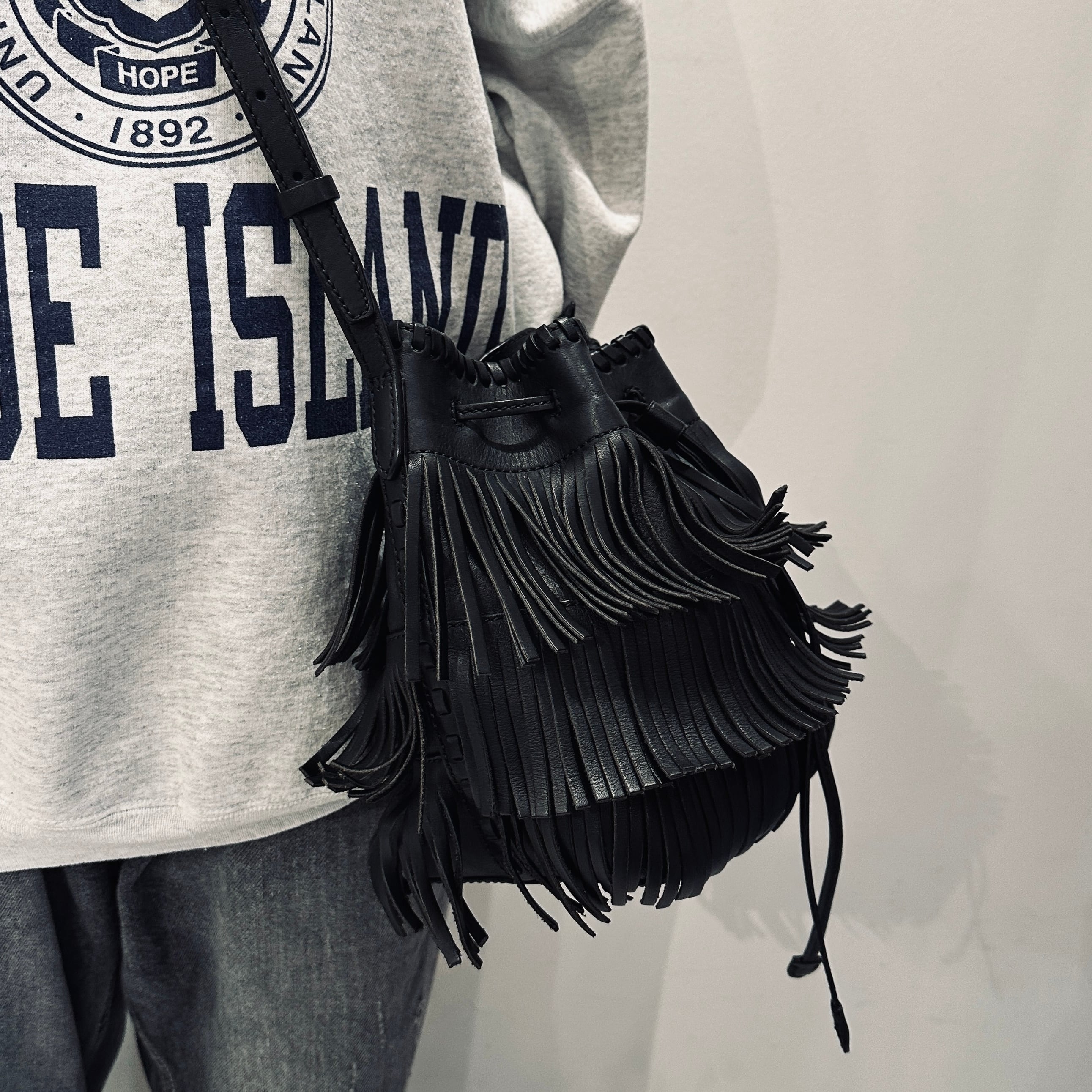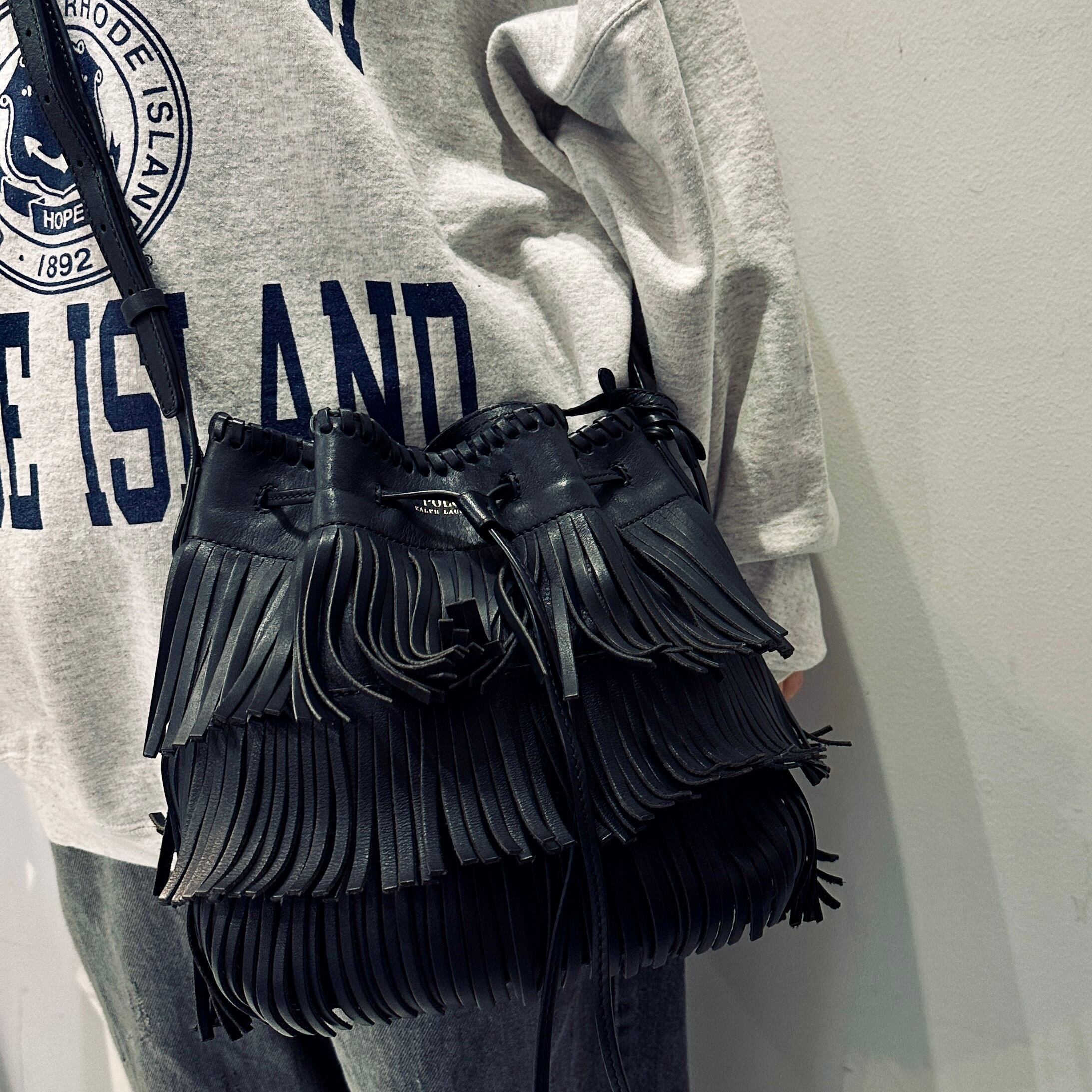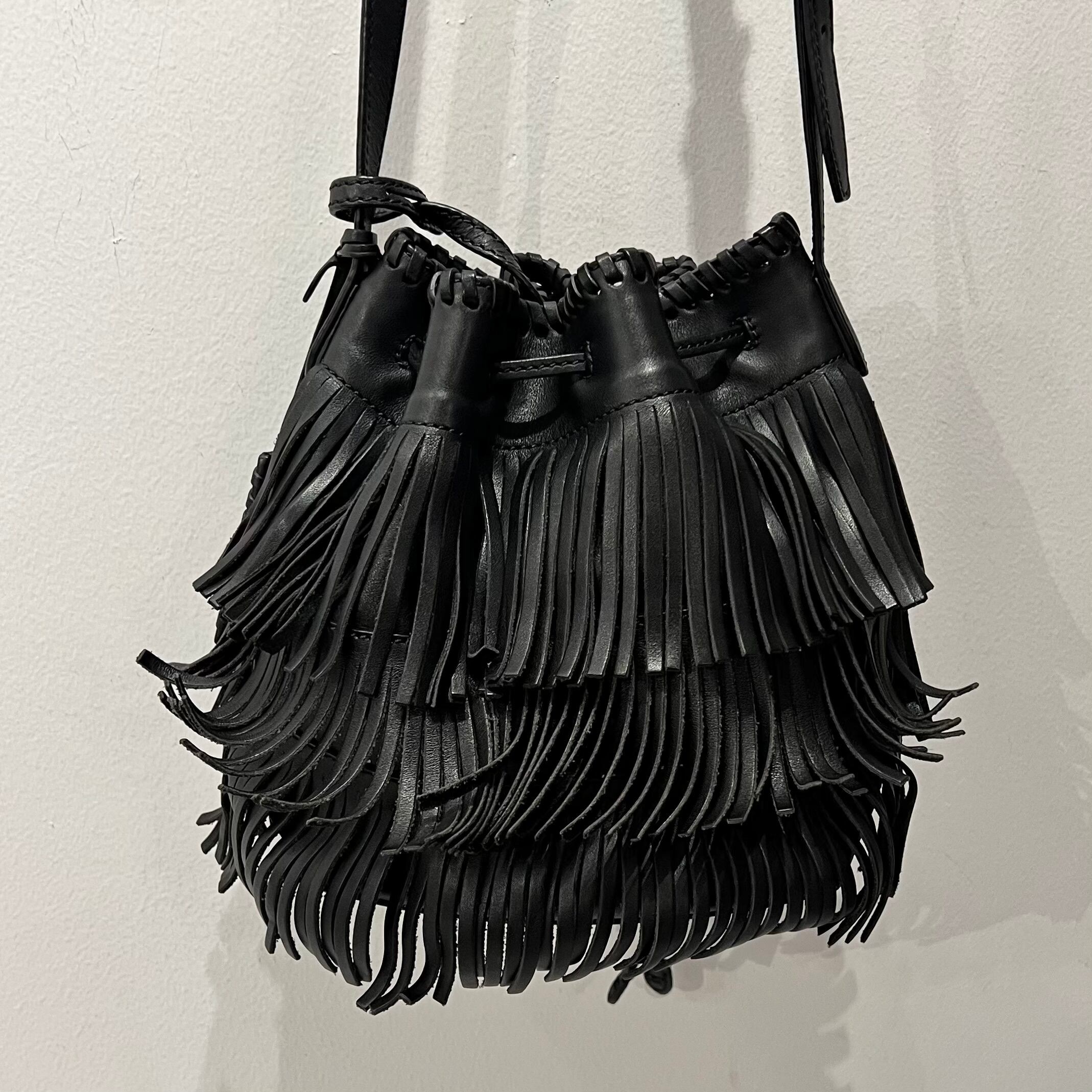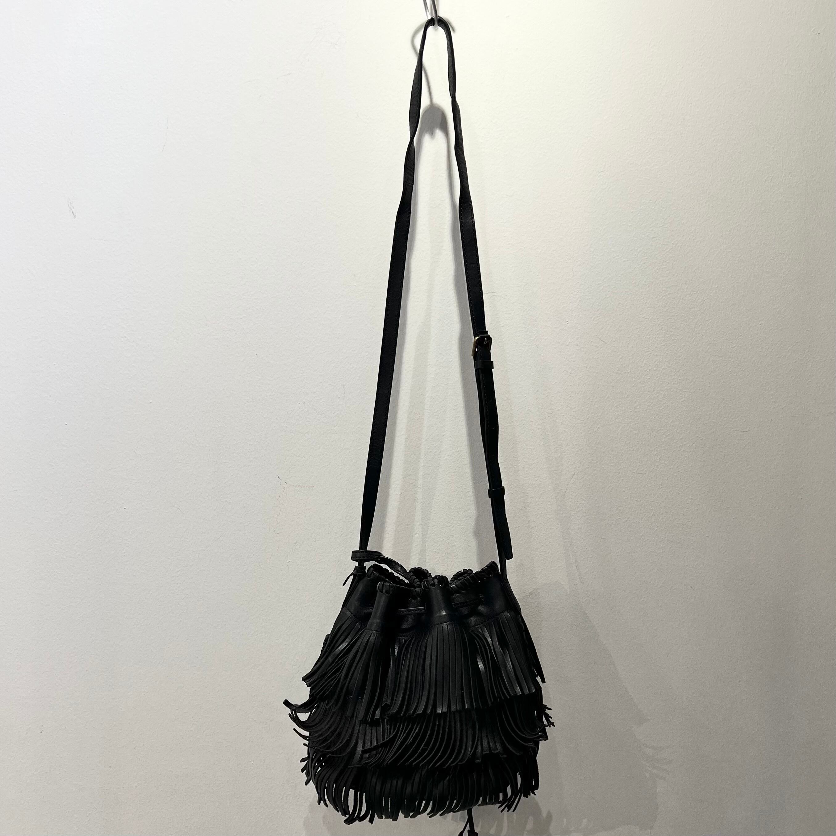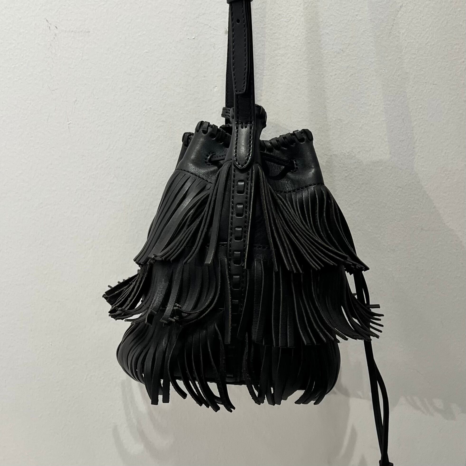 ブラックレザー、フロントにロゴプリント、巾着仕様、3段のフリンジ、セパレートのレザーポーチ、レザーネームストラップの付いたショルダーバッグ型デザインです。