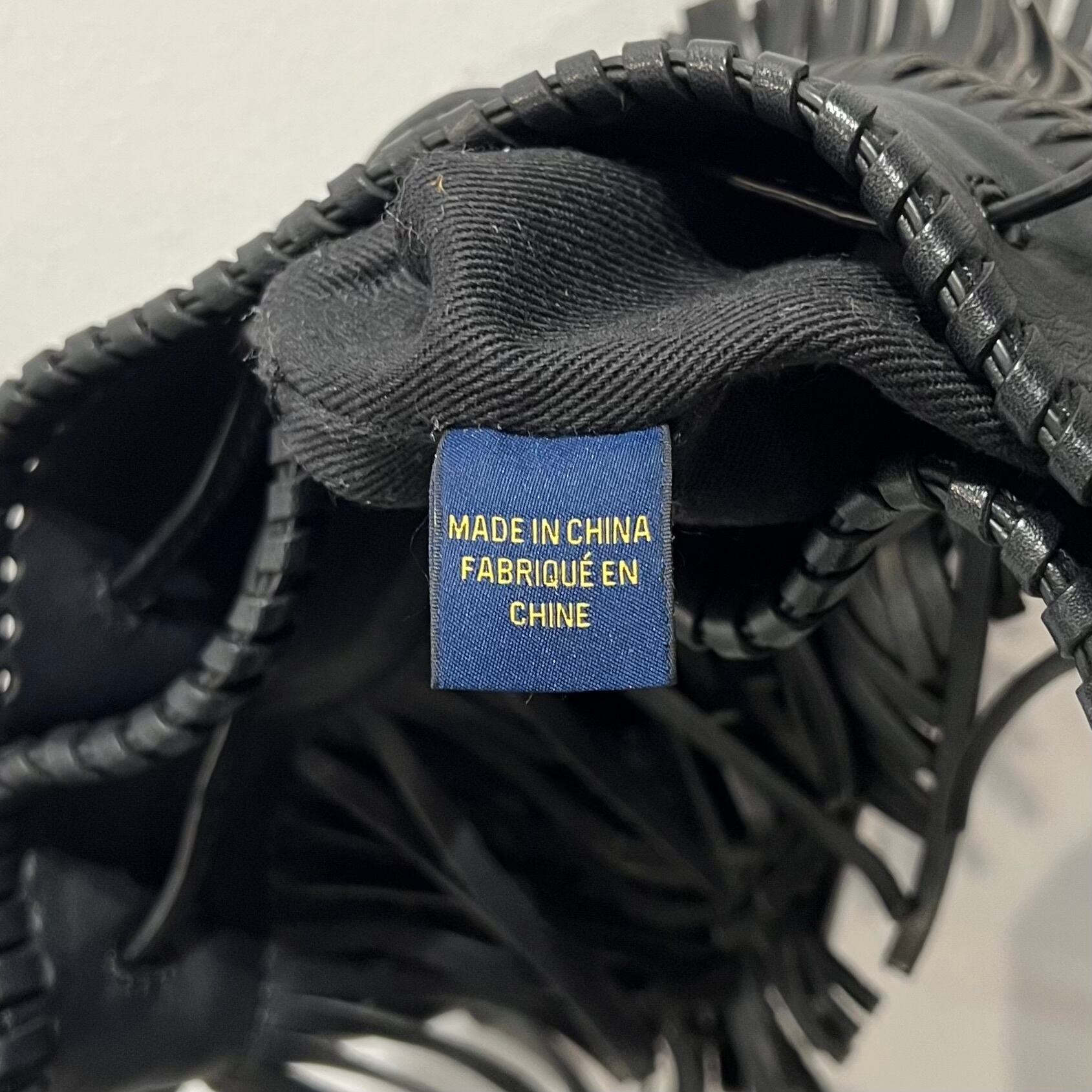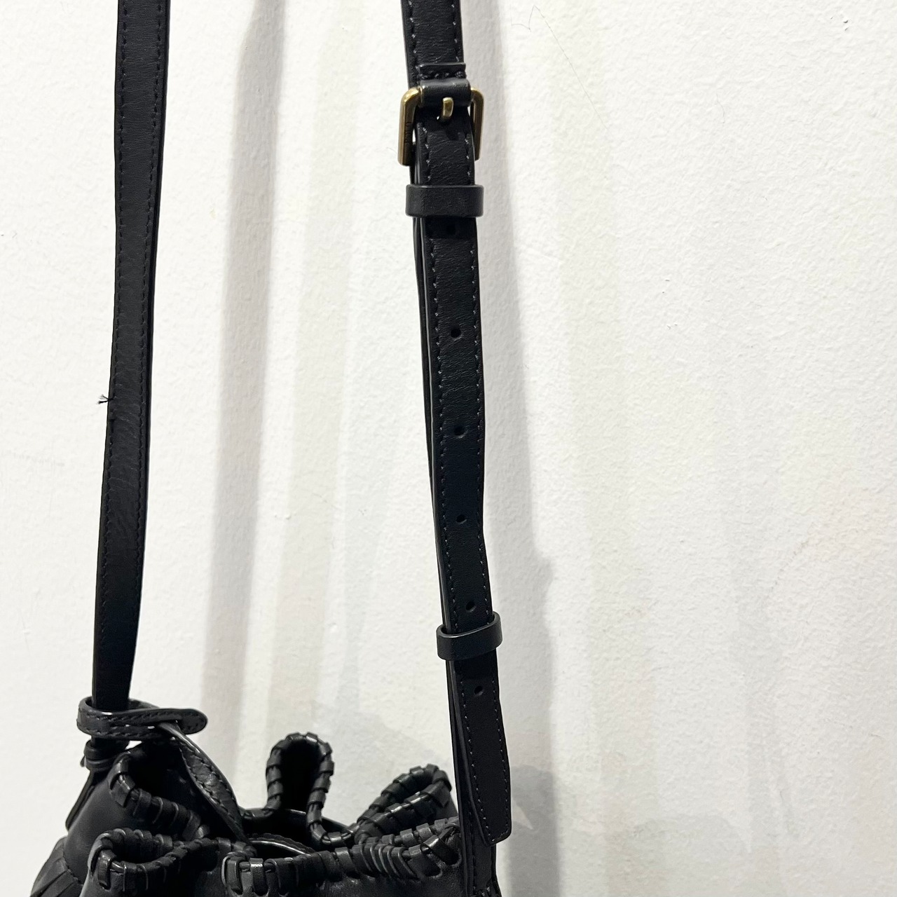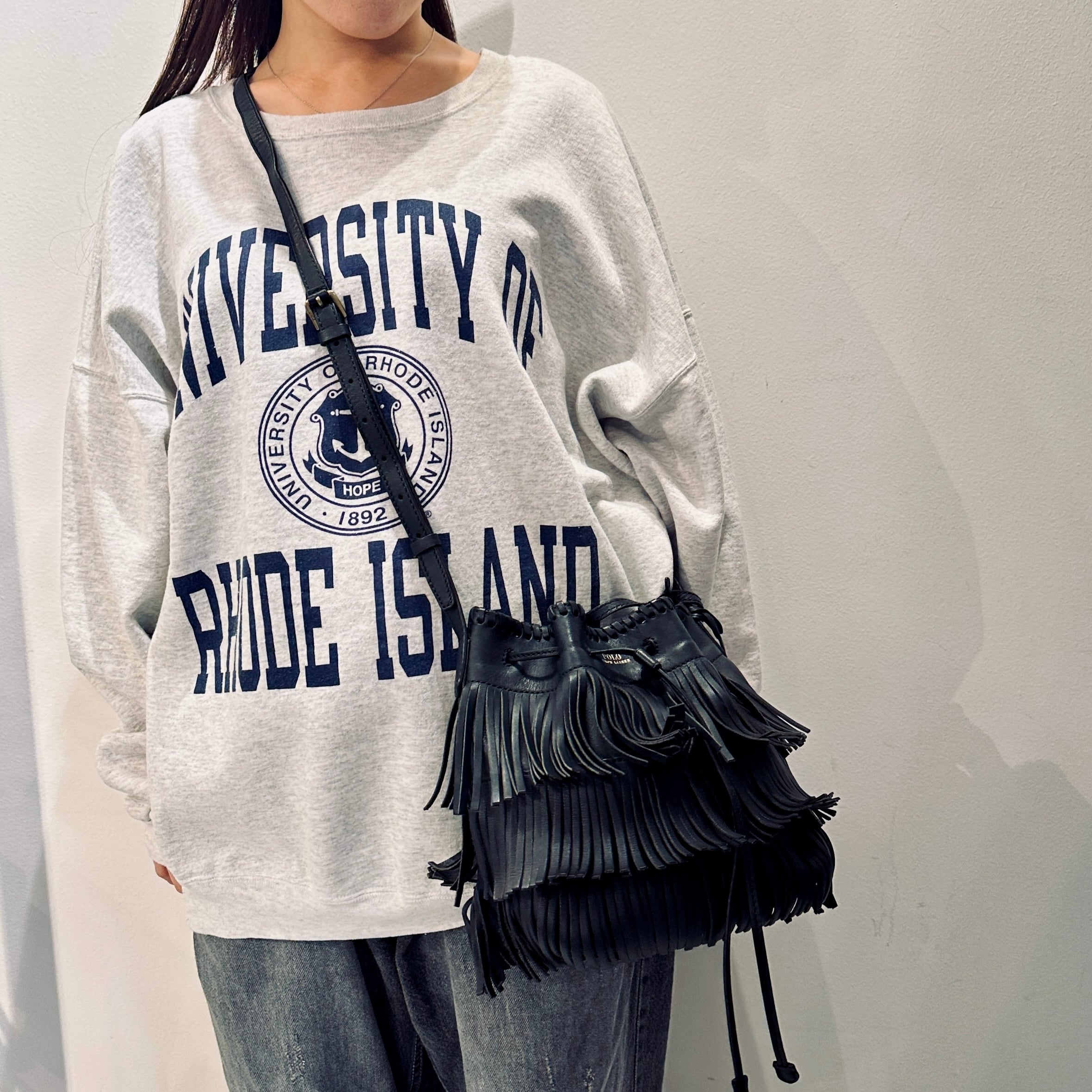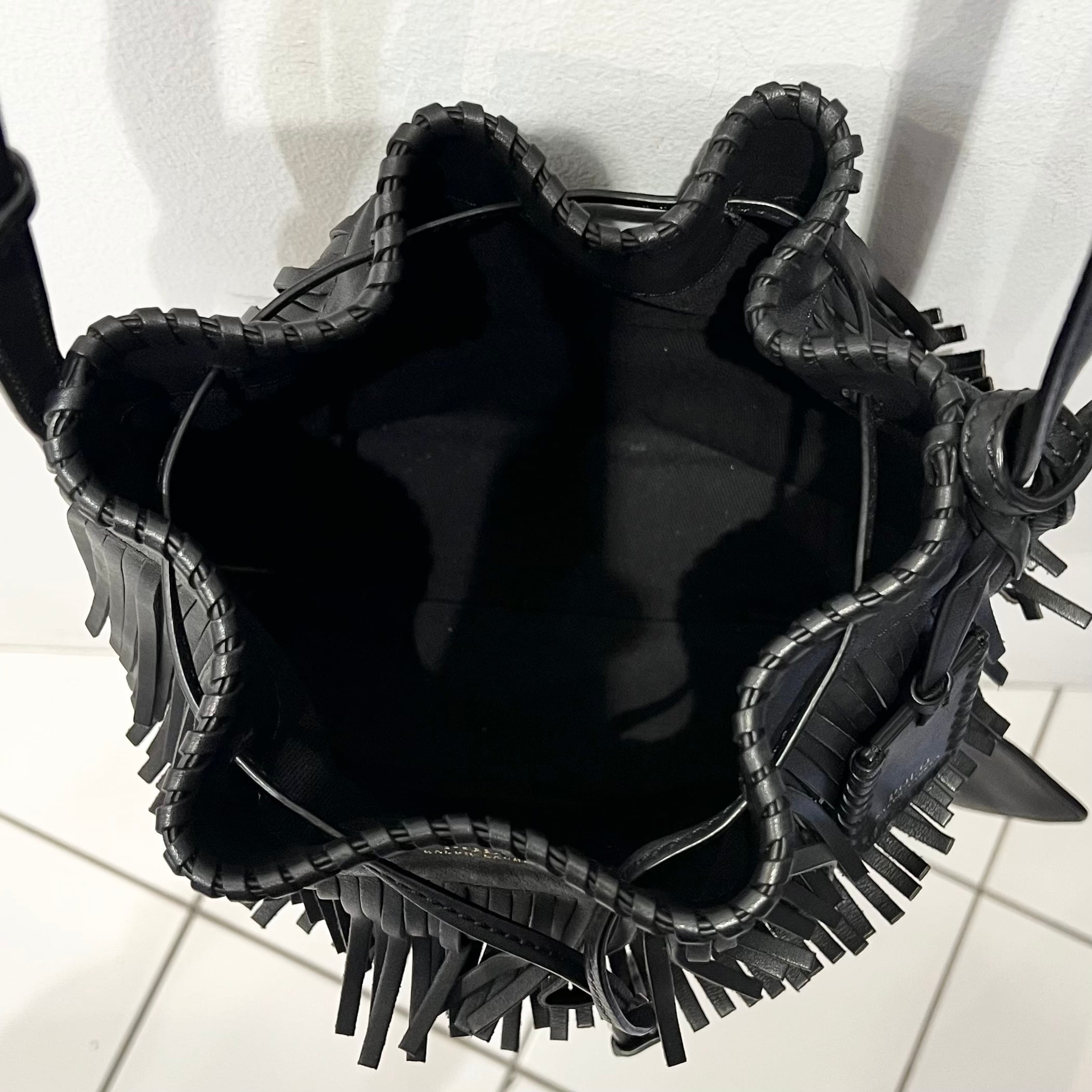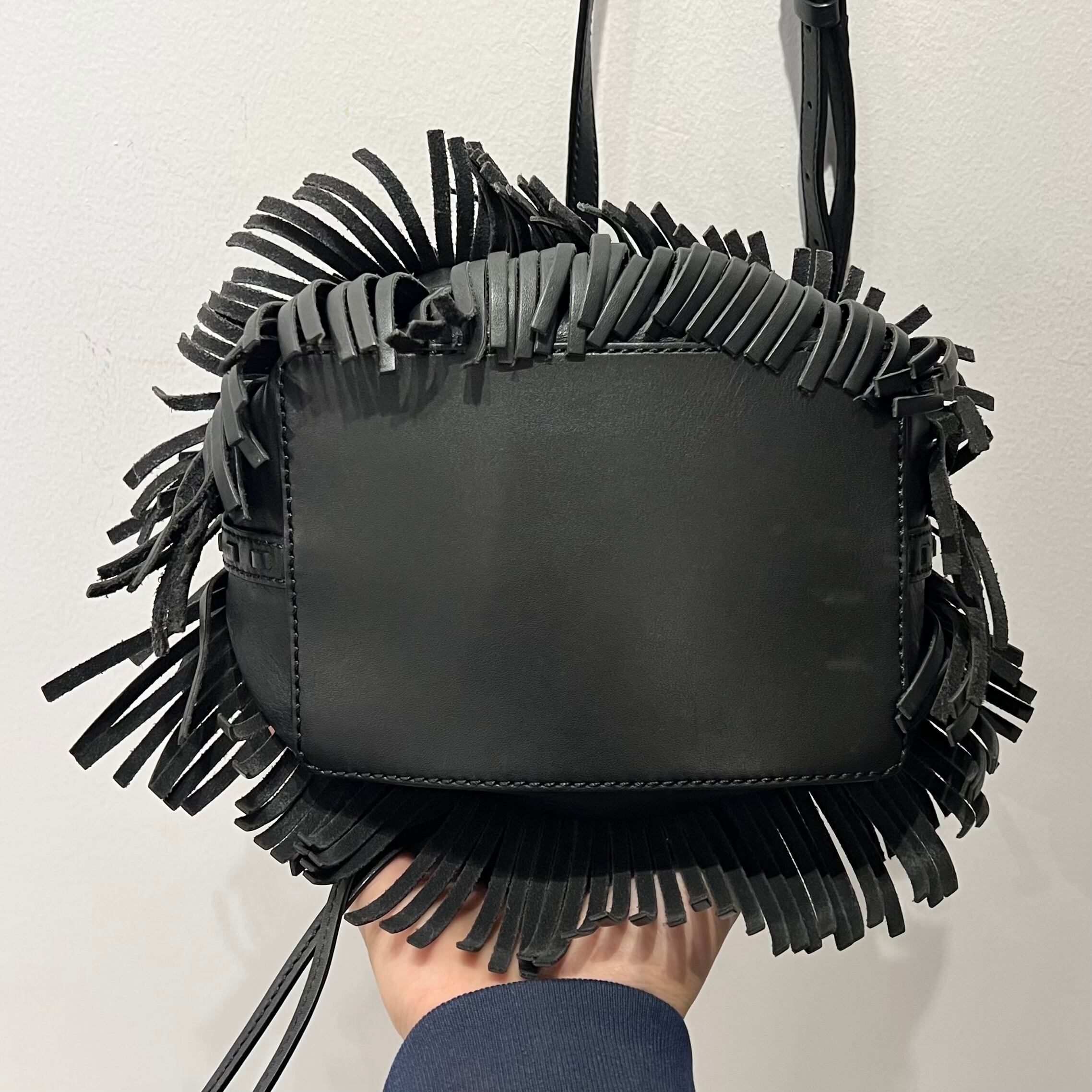ブラックレザー、フロントにロゴプリント、巾着仕様、3段のフリンジ、セパレートのレザーポーチ、レザーネームストラップの付いたショルダーバッグ型デザインです。