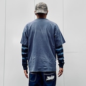 ネイビーのコットン素材、フロントにボックスの犬のフォト、ロゴとロゴマークプリントが入るデザインです。