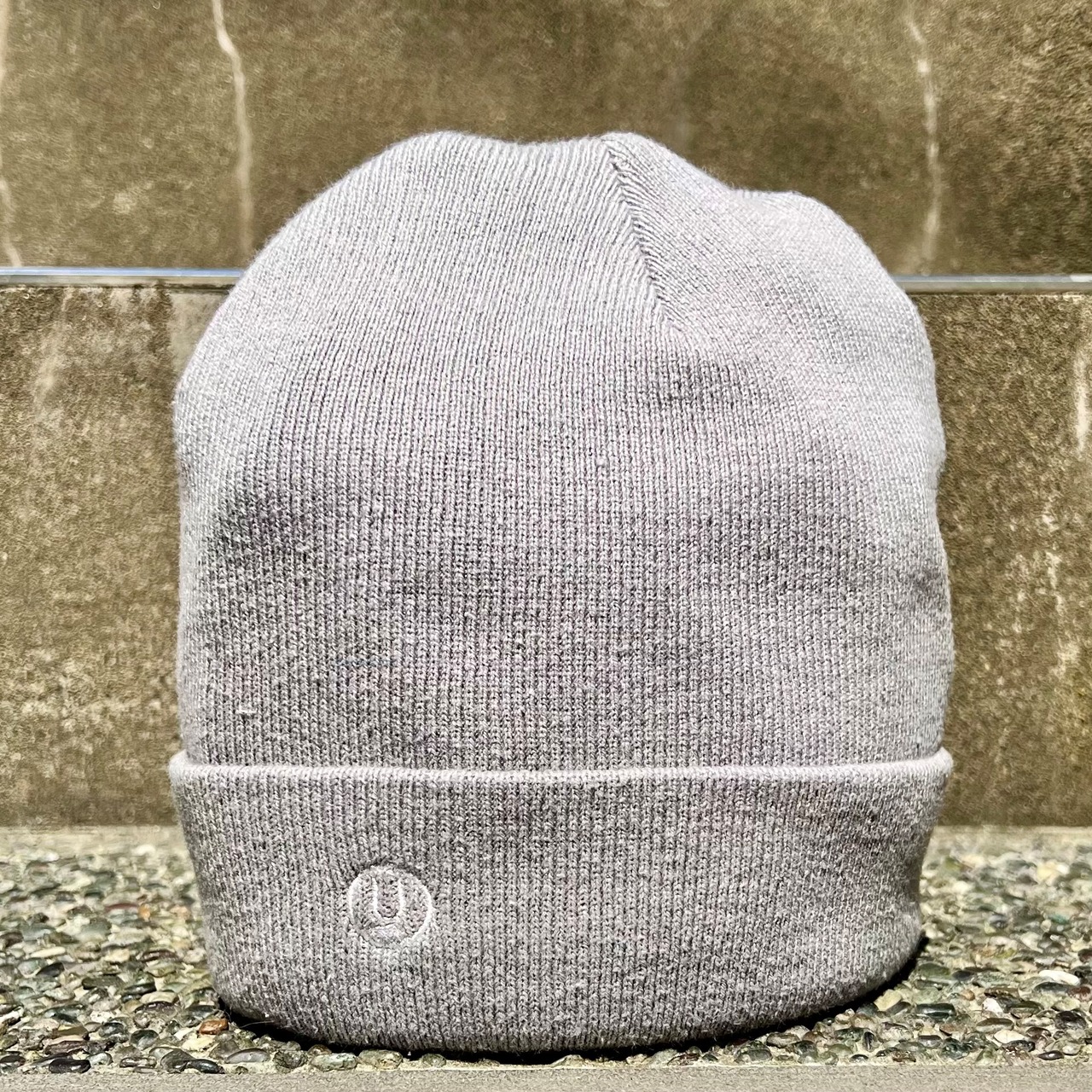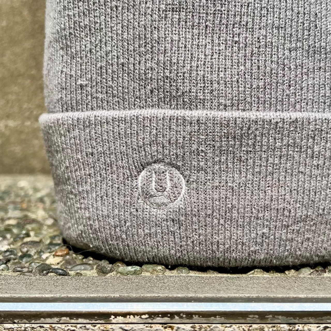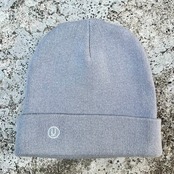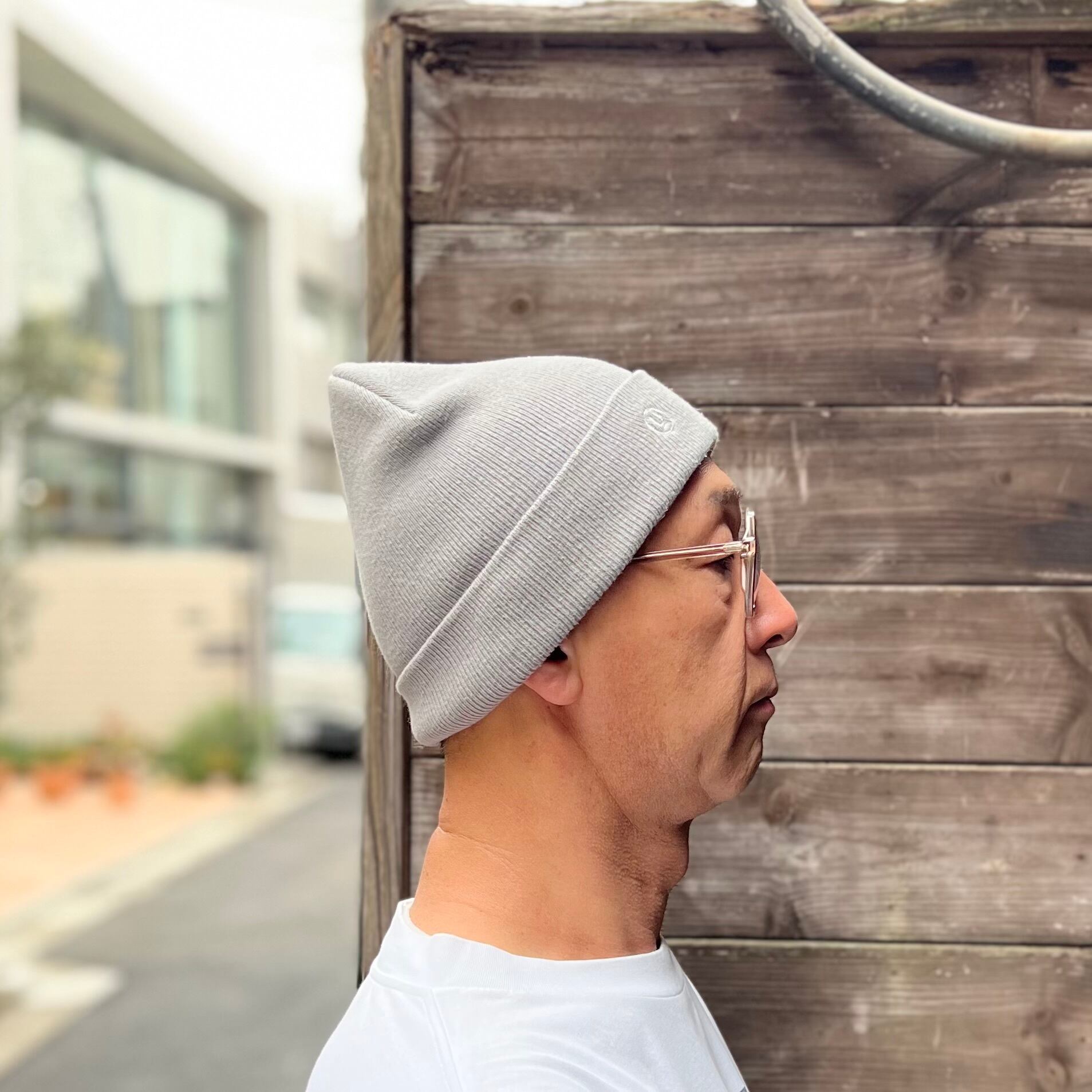 ライトグレーのポリエステル混素材、フロント右にロゴマーク刺繍が入るシンプルデザインです。