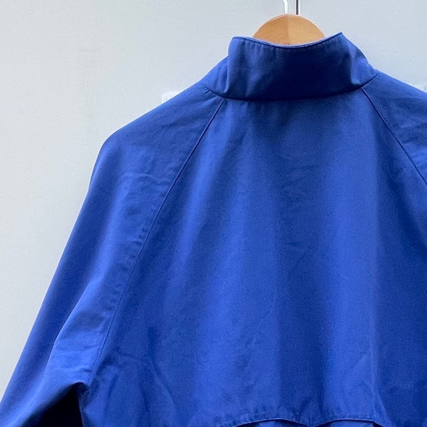 ブルーのポリエステル混素材、フラップ付きハンドウォームポケット、チェック裏地が付いたシンプルデザインです。