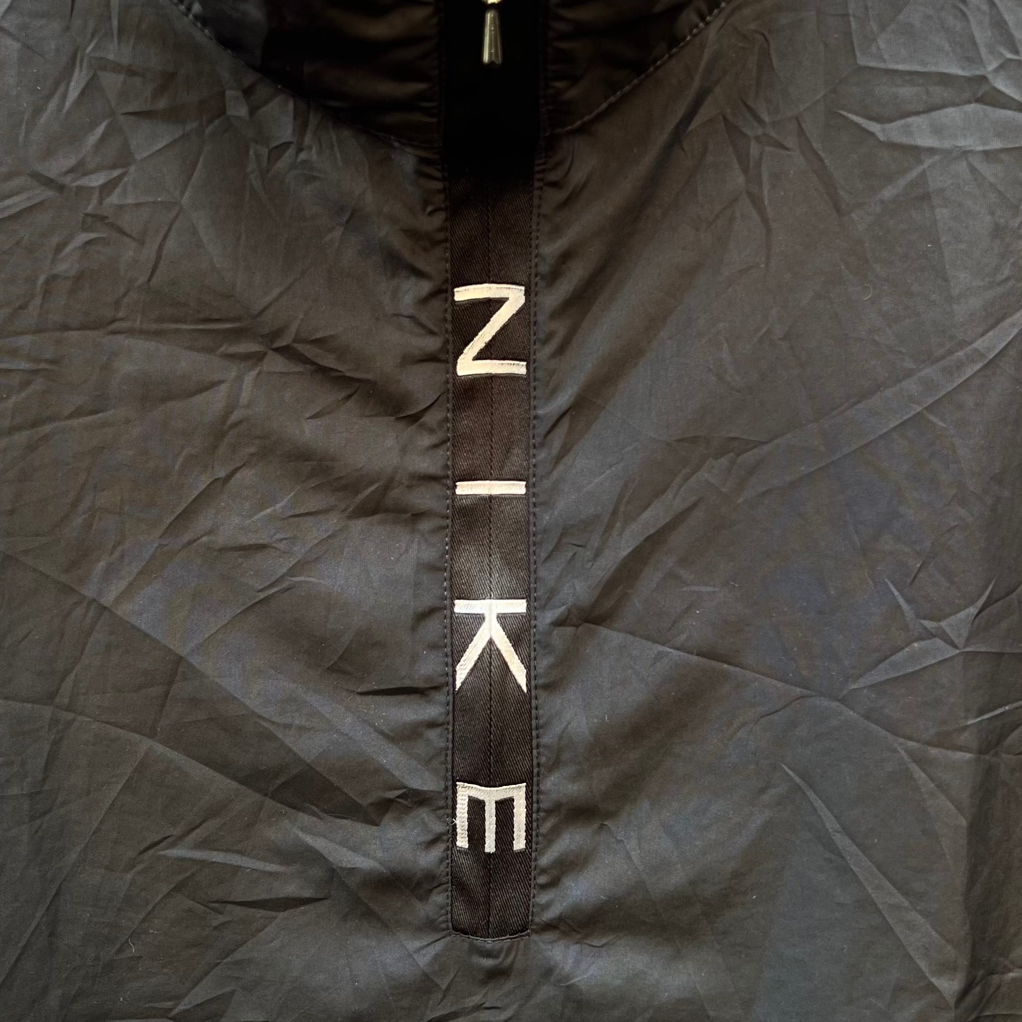ブラックのポリエステル素材、フロントジッパーに縦でNIKEロゴ、左裾にスウォッシュ刺繍、ハーフジップのデザインです。