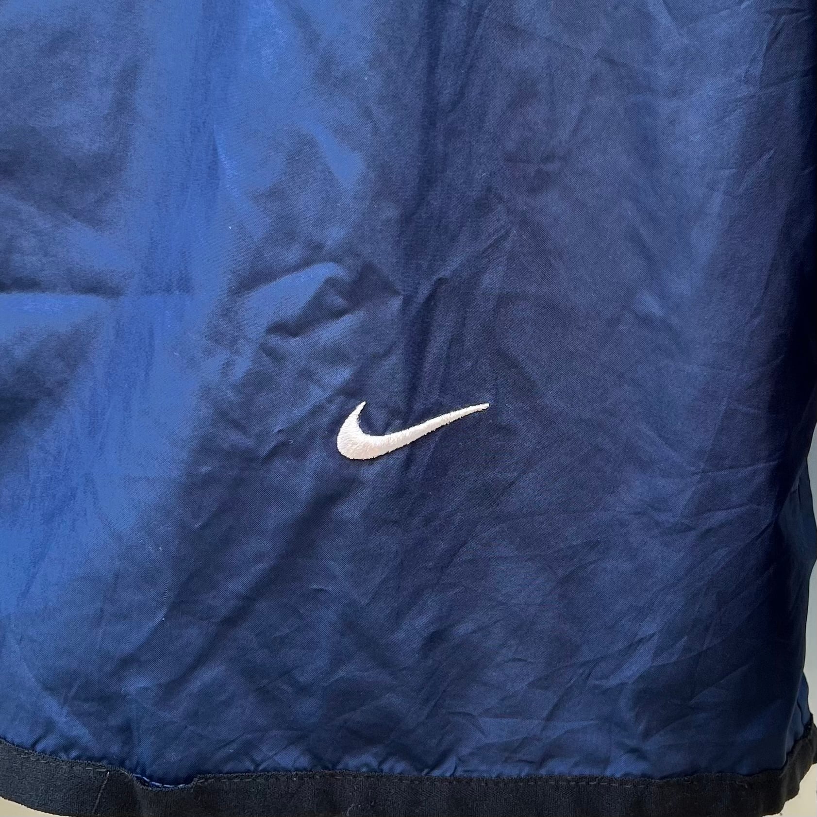 ネイビーのポリエステル素材xブラックパイピング、フロントジッパーに縦でNIKEロゴ、左裾にスウォッシュ刺繍、ハーフジップのデザインです。