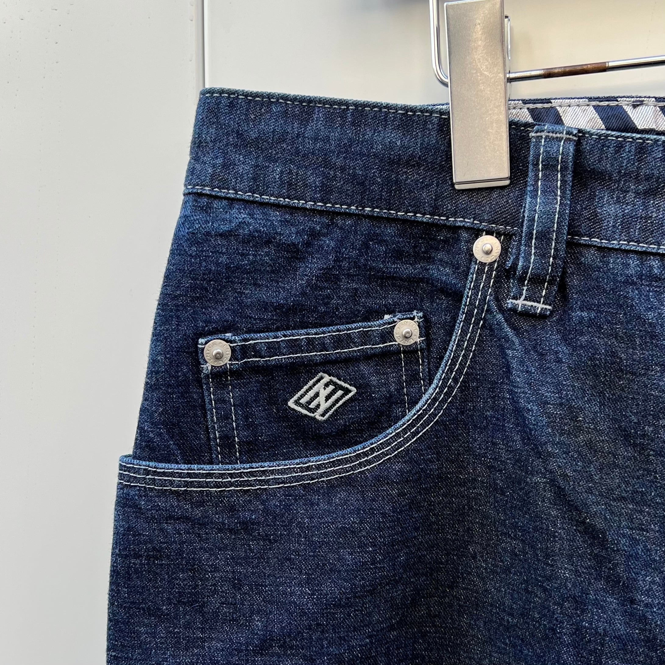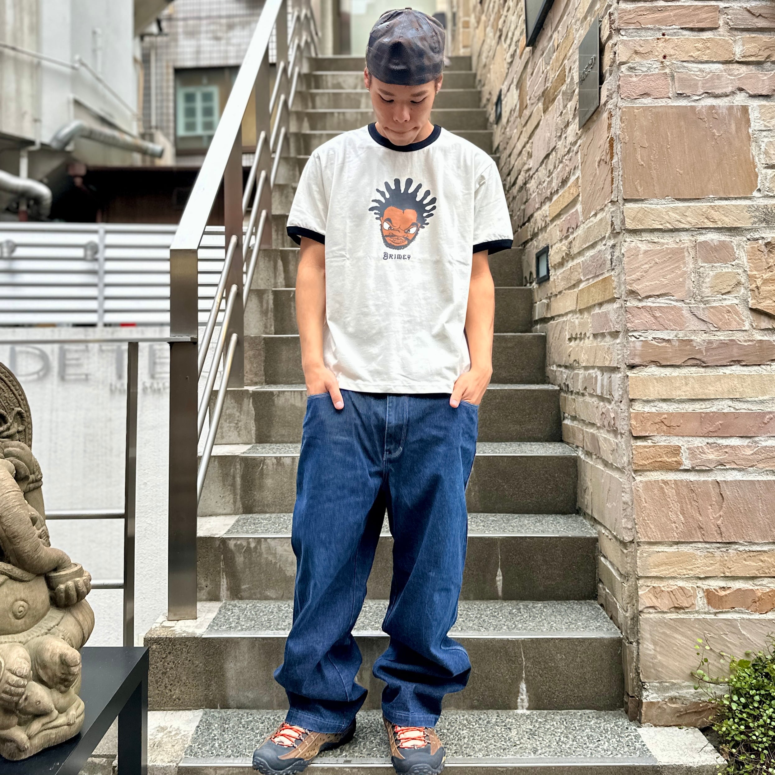 ウォッシュドブルーデニム、左バックポケットにネーム、右バックポケットにピスネーム、ロゴ入りボタン、リベット、5ポケット型のスタンダードデザインです。
