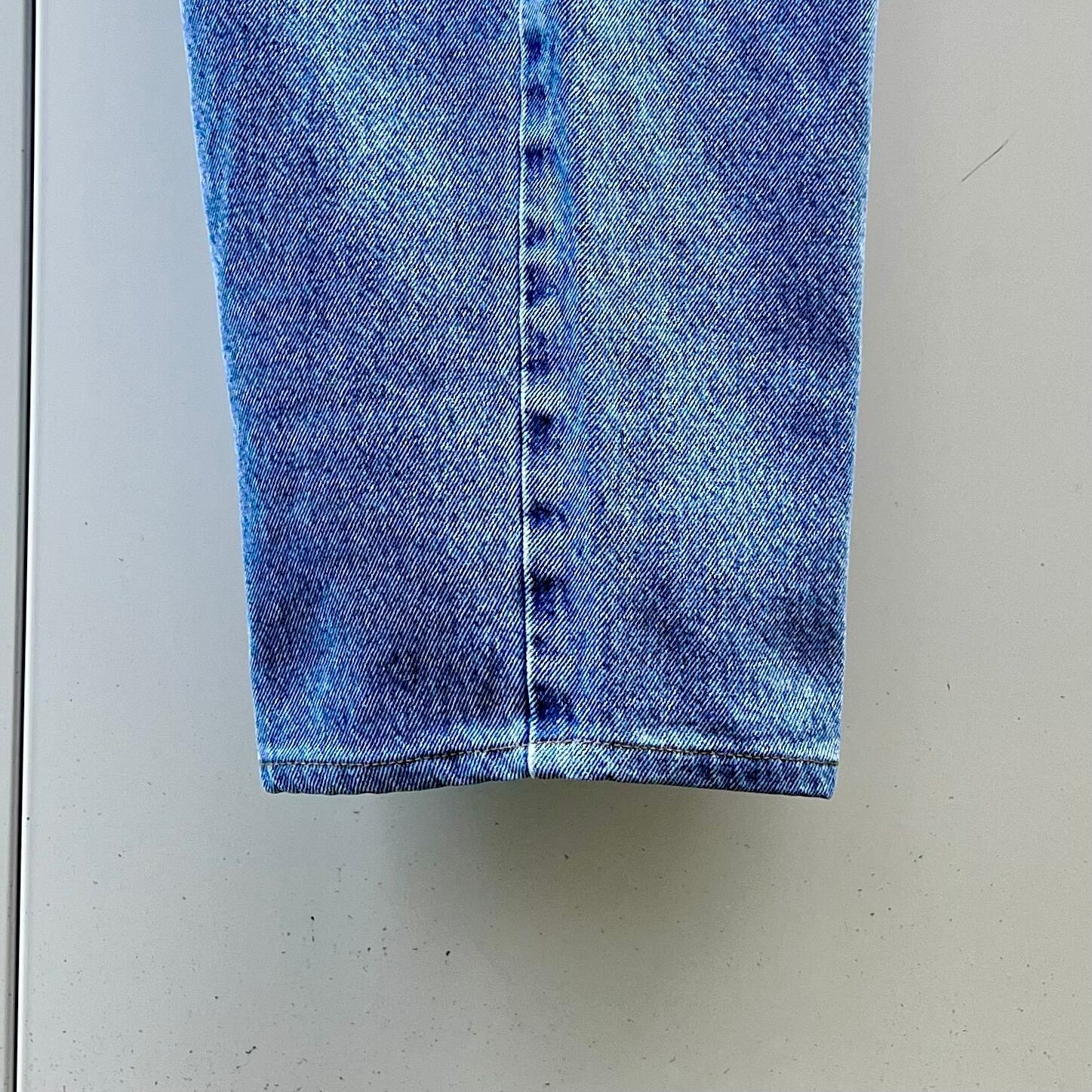 ウォッシュドブルーデニム、ロゴ入りボタン、リベットを使用したシンプルなデザインです。