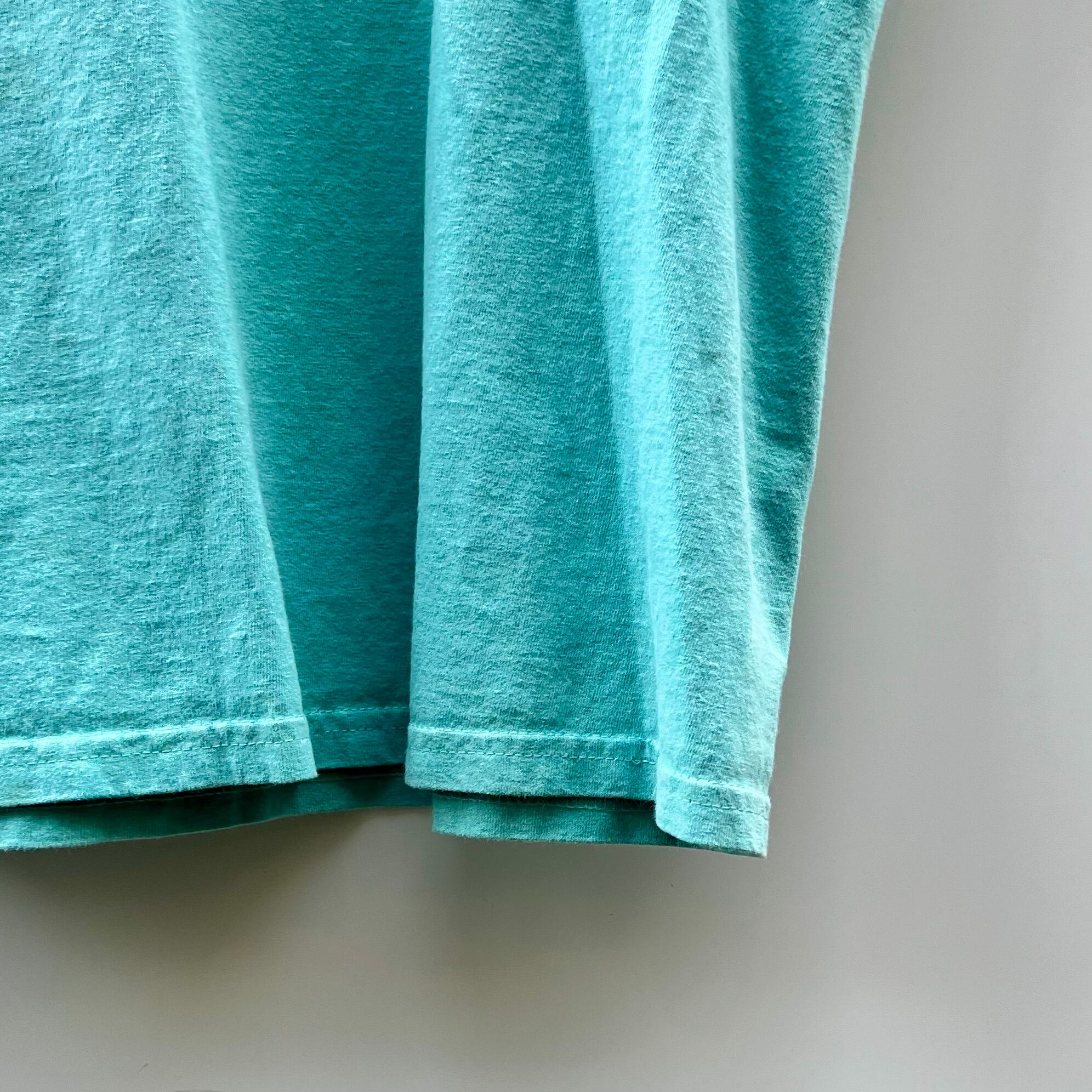 ミントグリーンのコットン素材、フロントのネイビーラインにスウォッシュとATHLETICSプリントが入るシンプルデザインです。