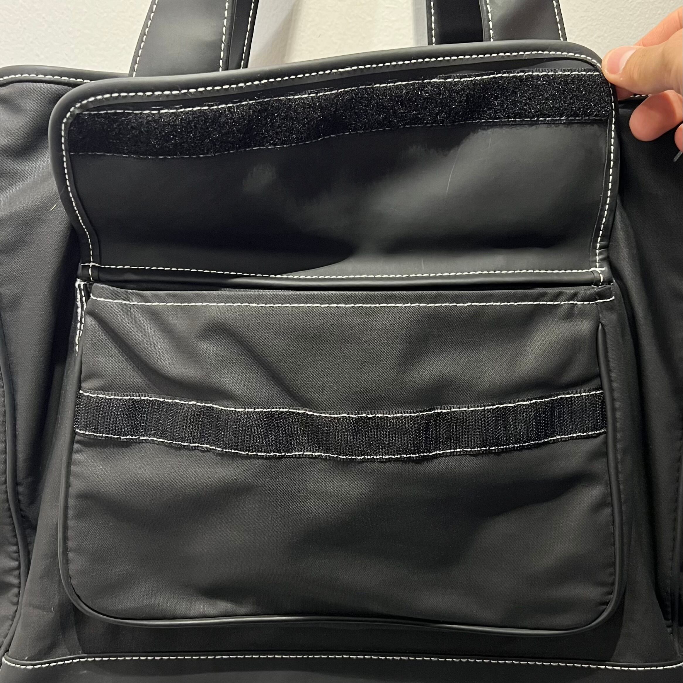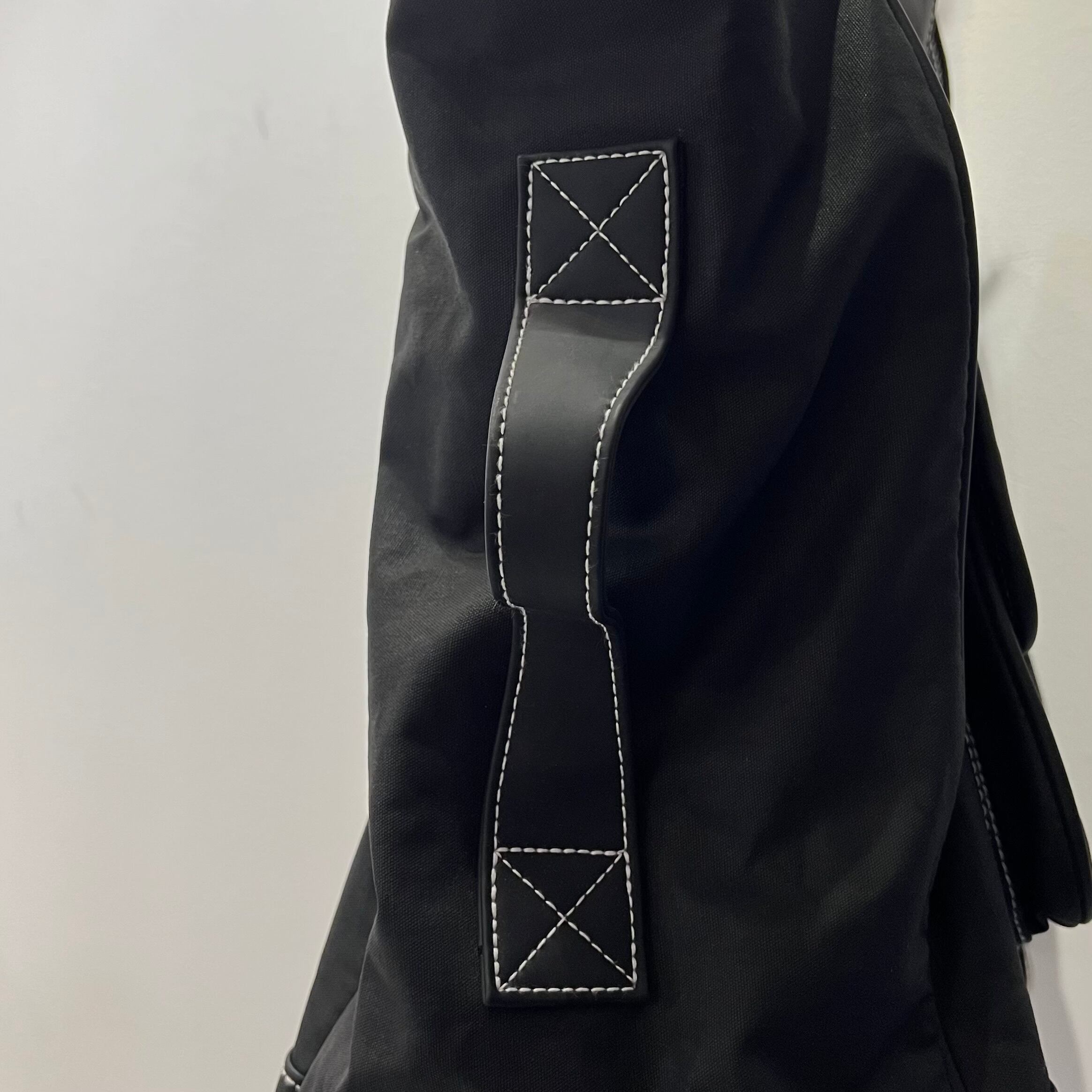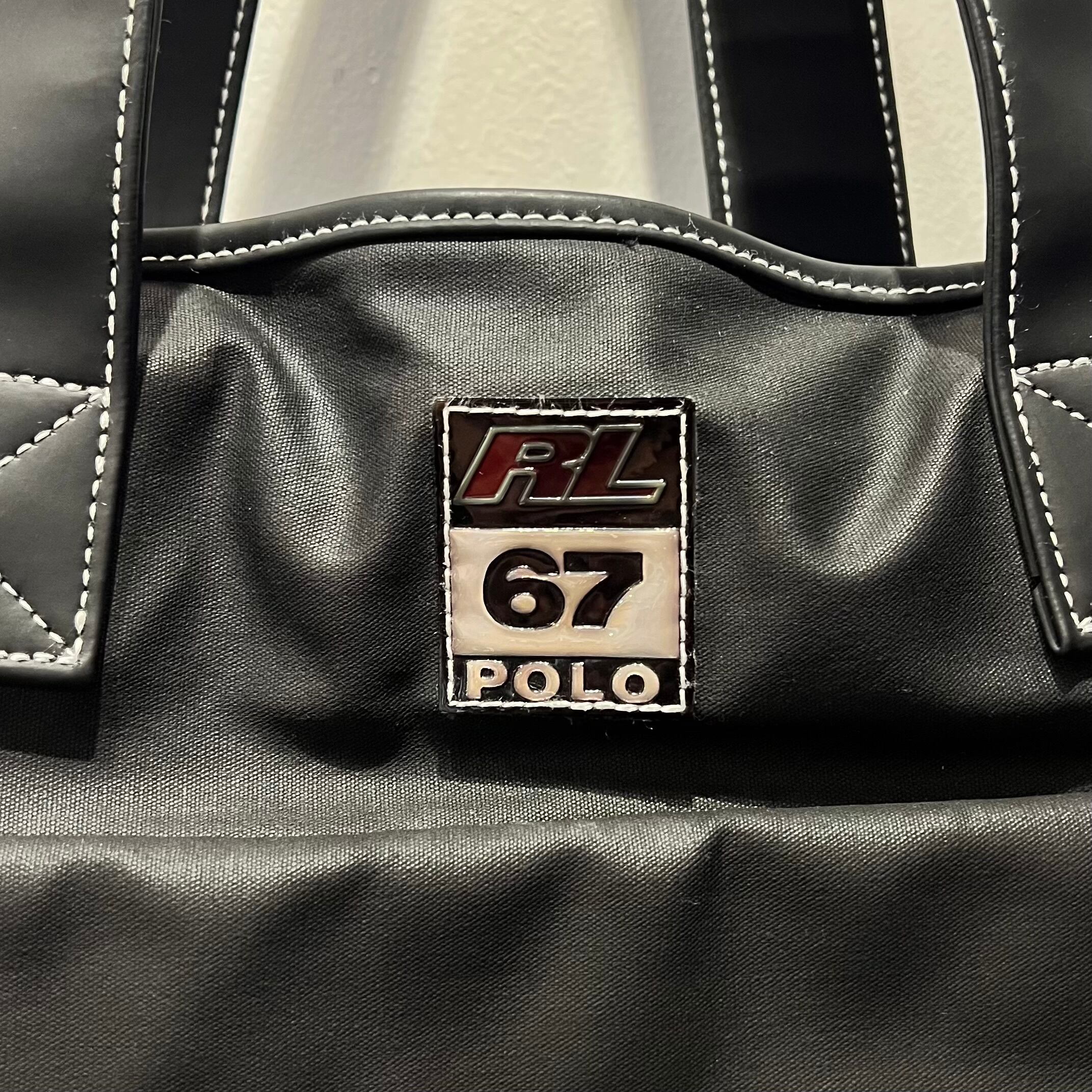 ブラックのナイロン系素材xブラックのポリウレタン系素材、フロントにRL67 POLOとPOLOSPORTワッペン、メインポケットとフロントと左サイドのフラップ付きサブポケットの3ポケット、右サイドにストラップ、メインポケットの内側に巾着付、内ポケットが付いた大き目のデザインです。