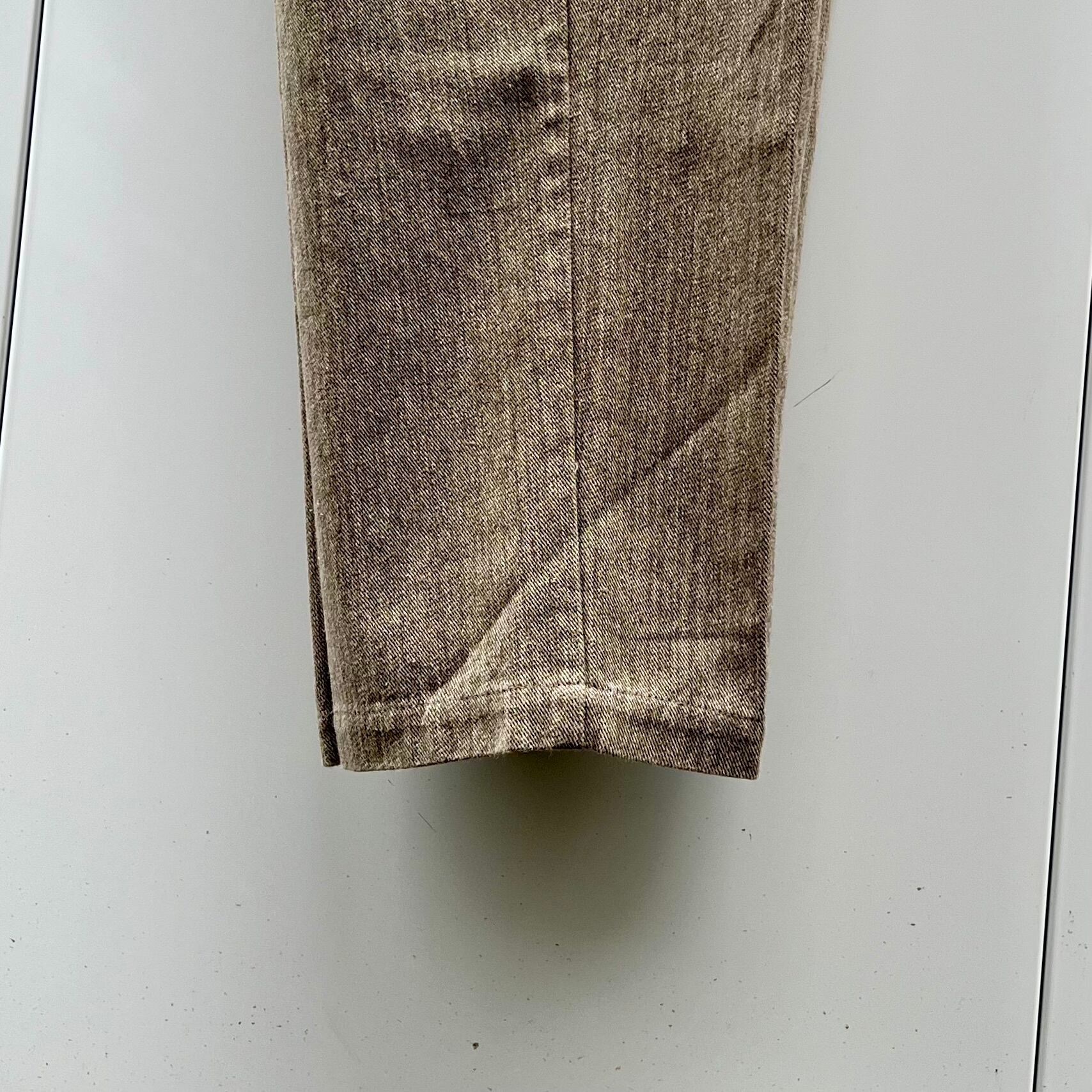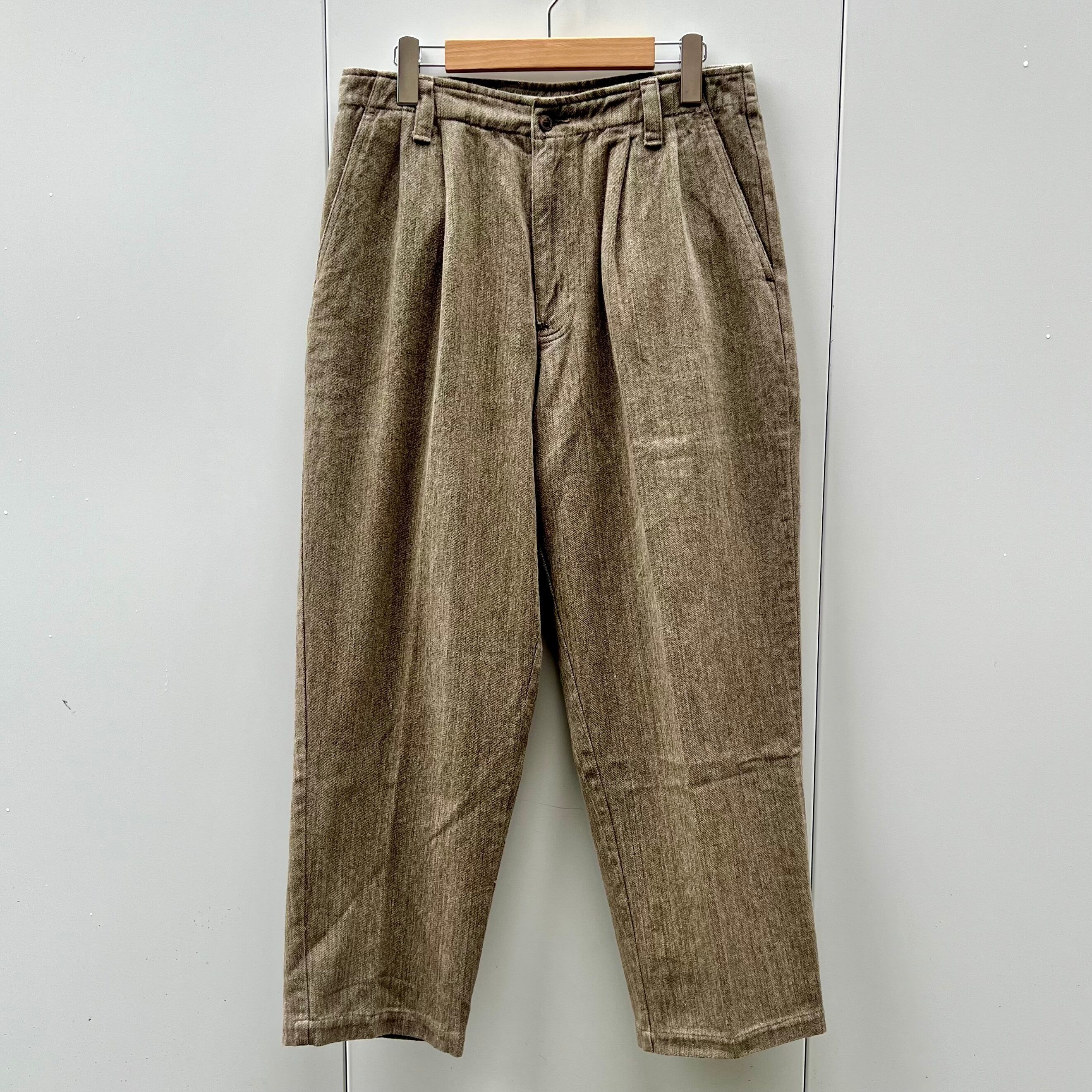 杢ベージュのコットン素材、右バックポケット上にネーム、2タックのシンプルデザインです。