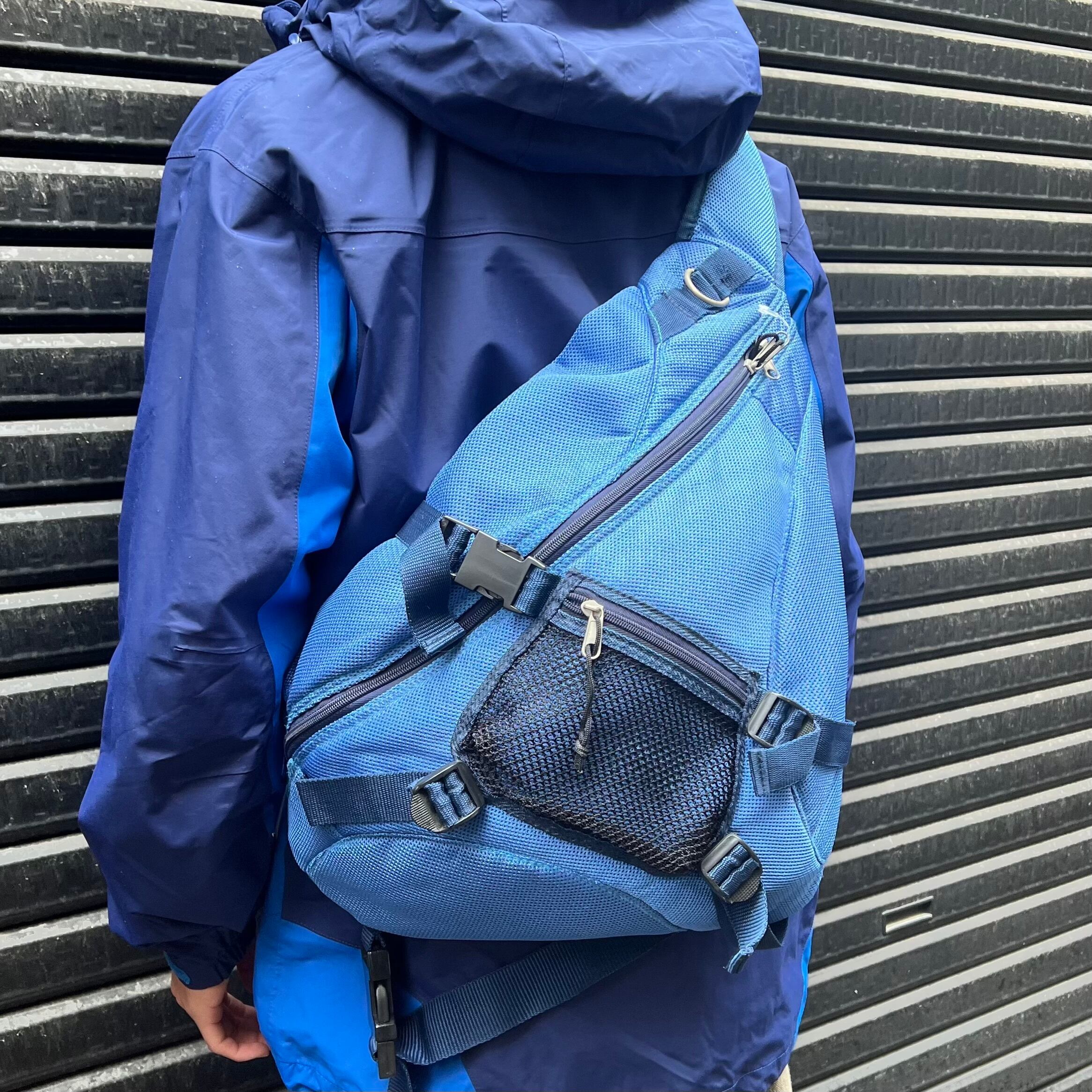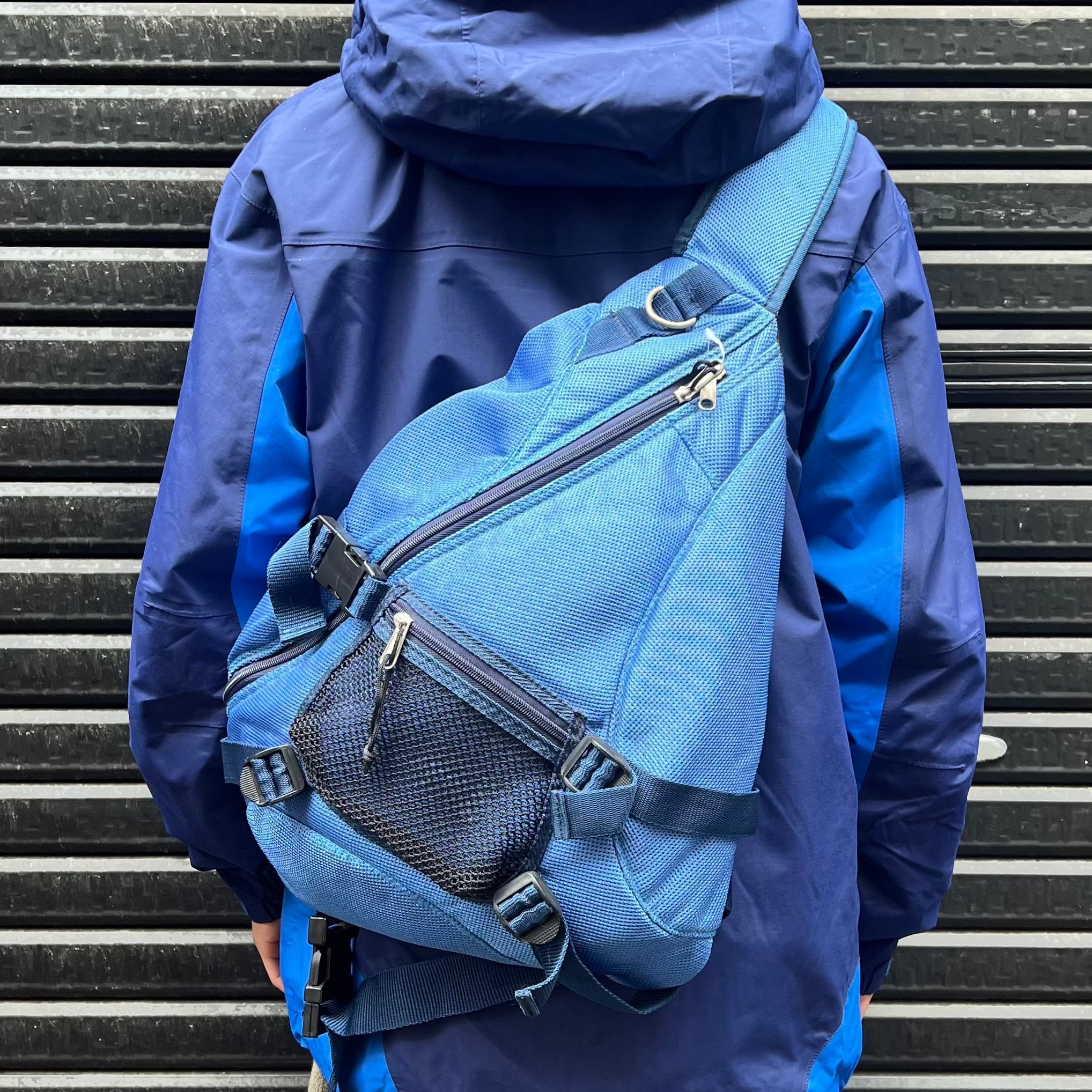 サックスブルーメッシュxネイビー/ブラック、ジッパー付きのメインポケットとフロントのジッパー付きメッシュサブポケット、ストラップにメッシュポケット、ウエストベルトが付いたデザインです。