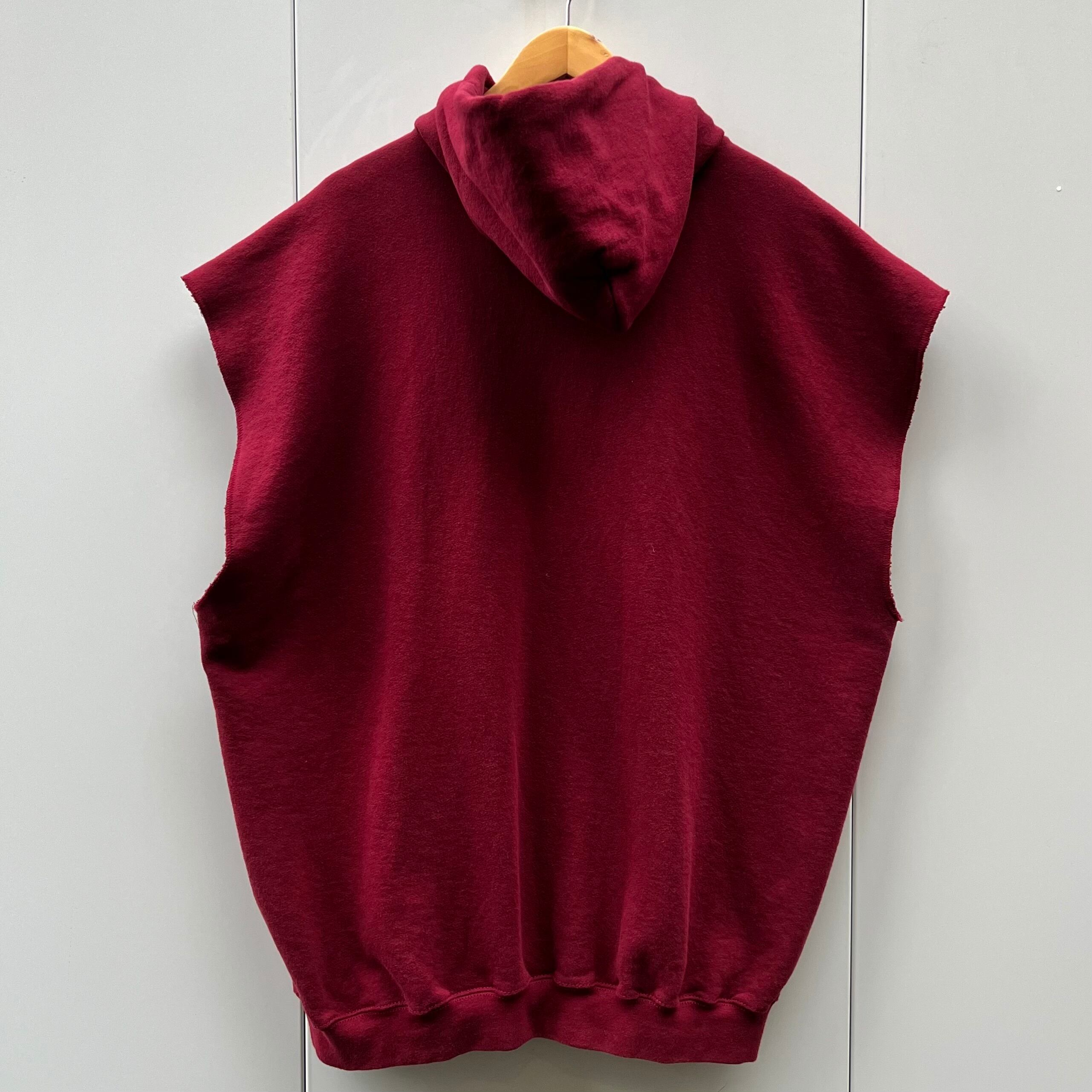 バーガンディの裏起毛素材、左胸にスウォッシュ刺繍、カンガルーポケット、袖の無いデザインです。